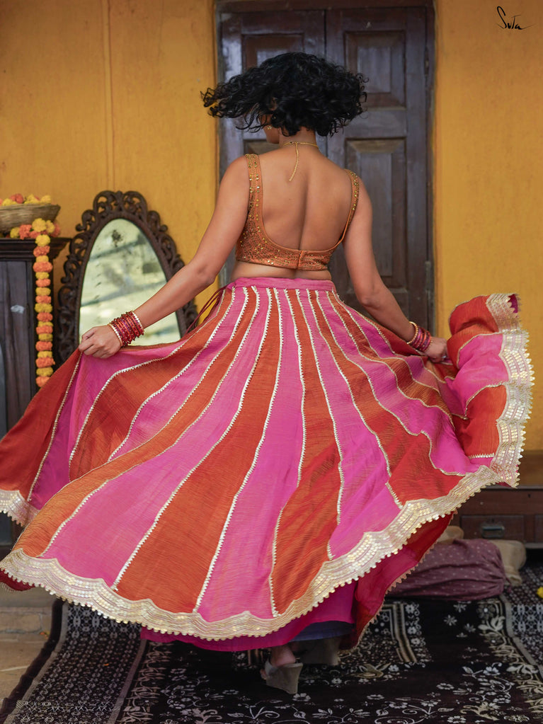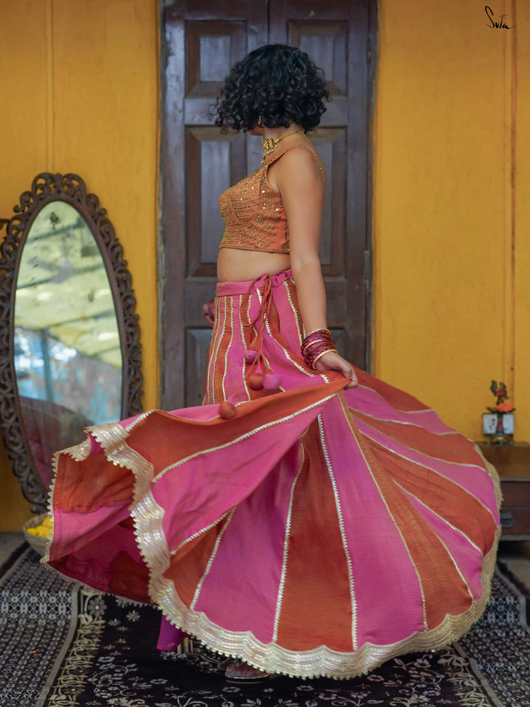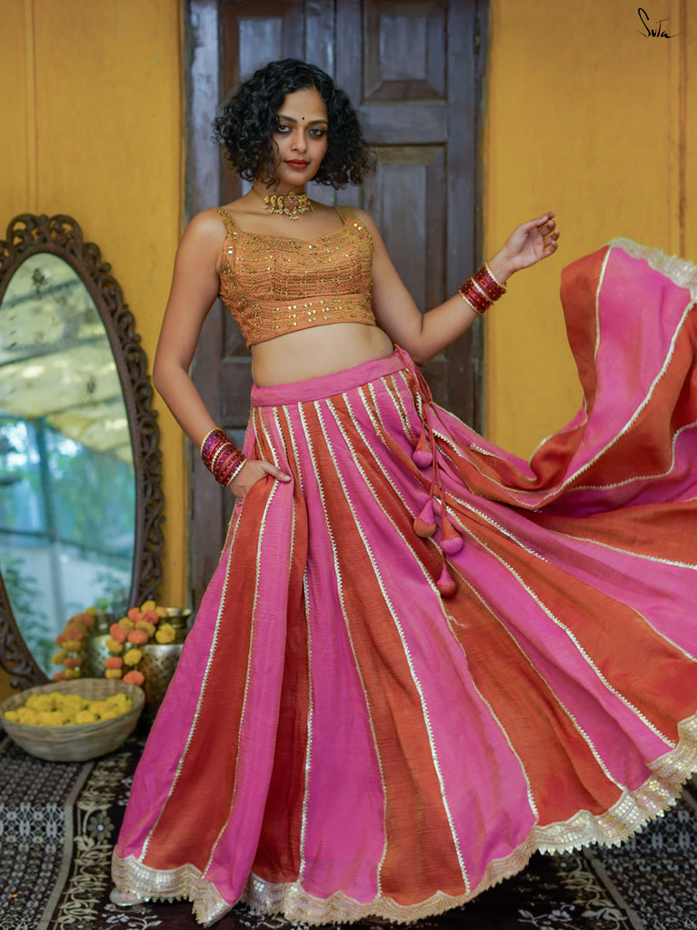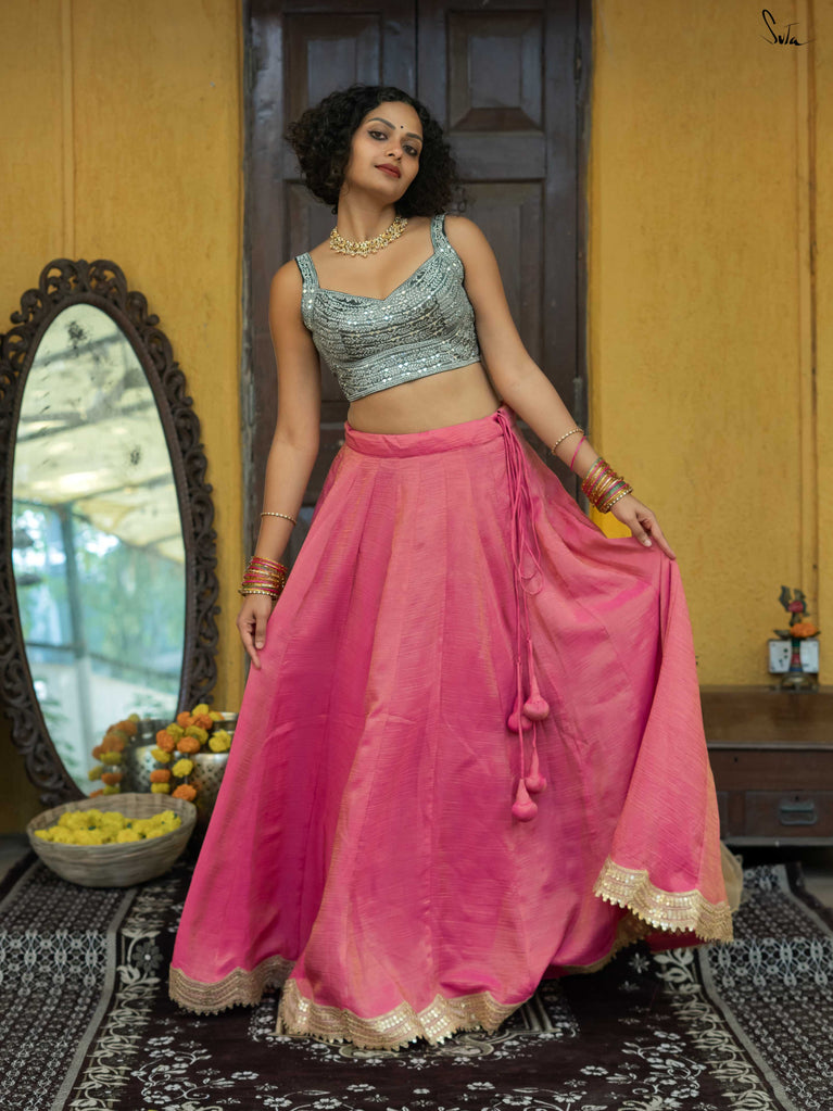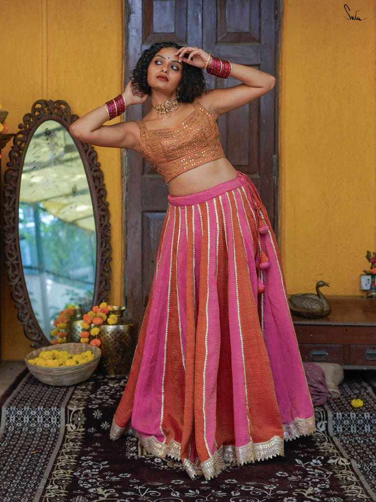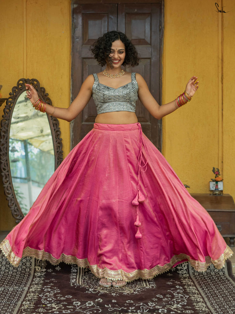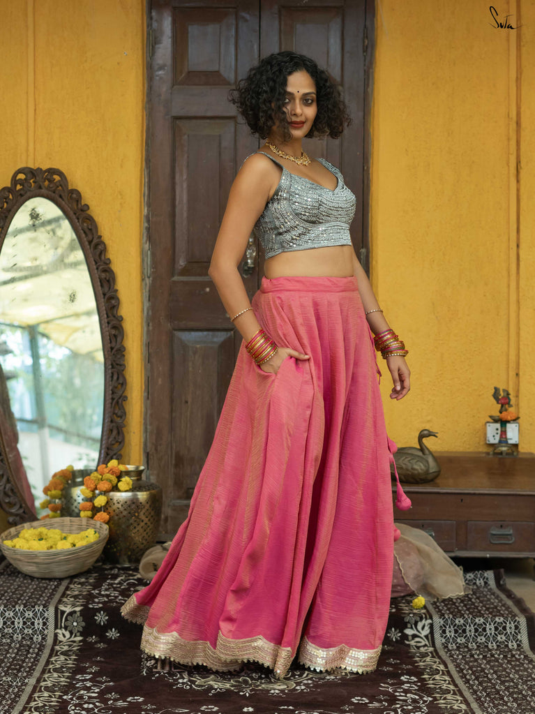 A lively mix of pink and red - bold, joyful, and made for celebrating your people. This crushed viscose lehenga is designed for wedding days that are all heart and movement. Light on the body with a soft festive sheen, it flows easily from laughter to dancing without missing a beat. Scalloped gold lace adds a gentle shimmer, while tassels keep things playful and fun. Style it with a blouse, drape it with a saree, or wear it as a skirt with your favourite crop top. Because when it’s yaar ki shaadi, you dress up, show up, and celebrate hard.