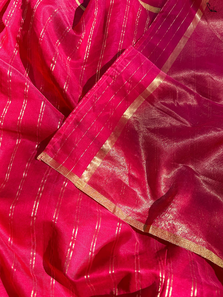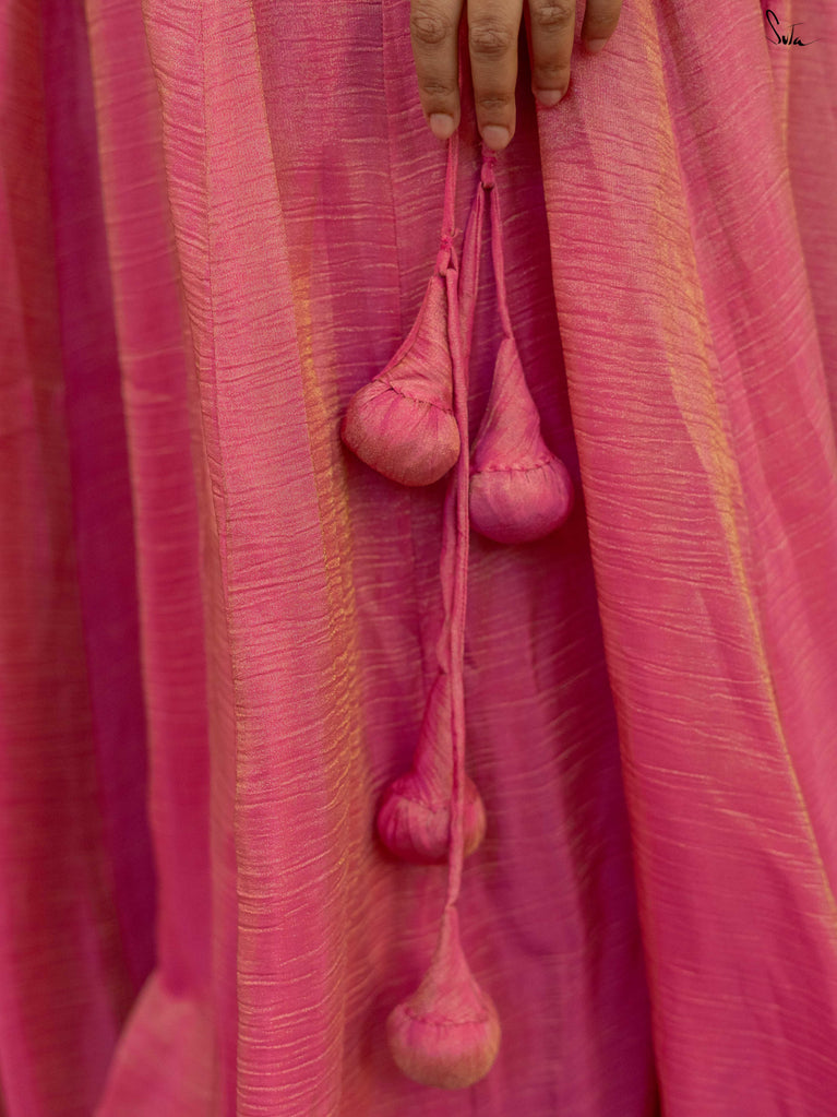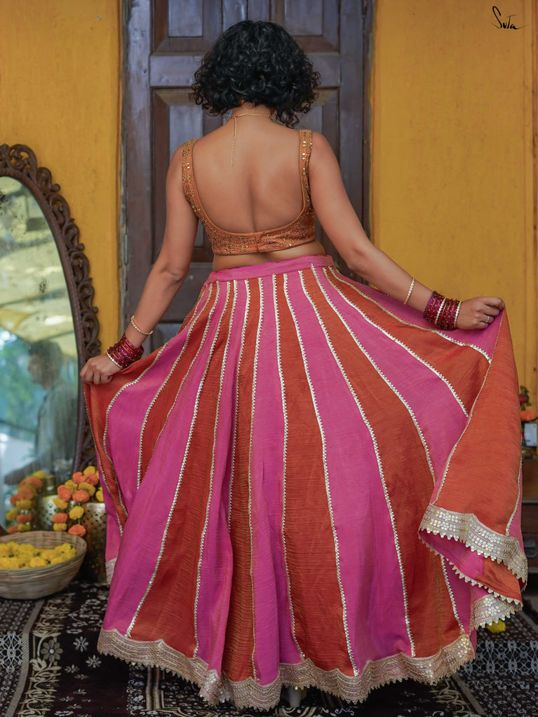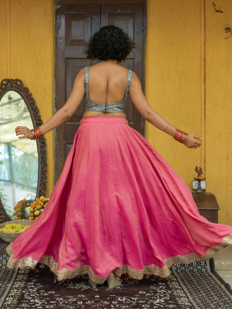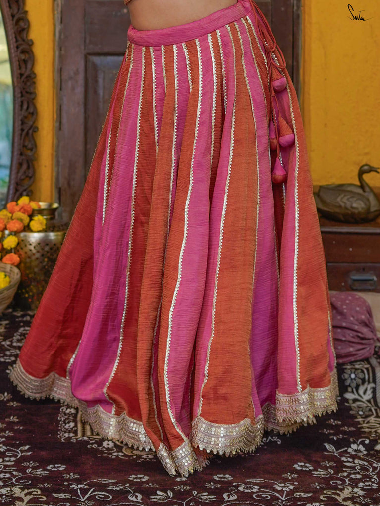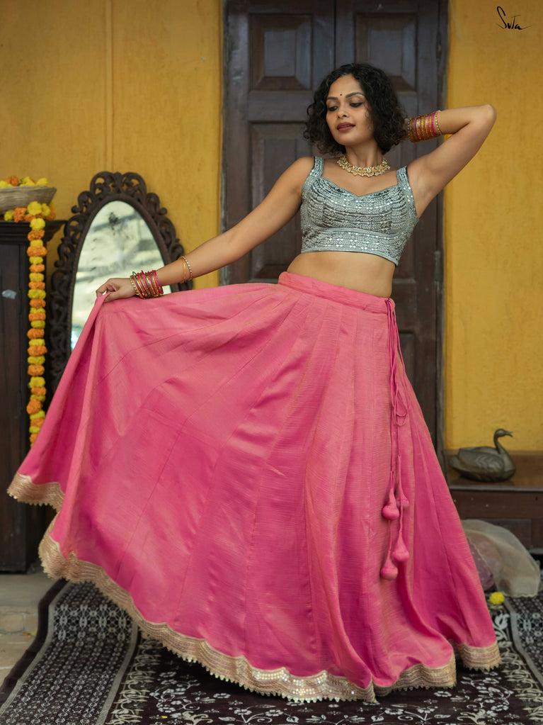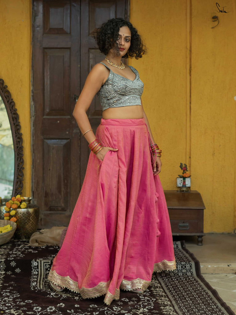 A lively mix of pink and red - bold, joyful, and made for celebrating your people. This crushed viscose lehenga is designed for wedding days that are all heart and movement. Light on the body with a soft festive sheen, it flows easily from laughter to dancing without missing a beat. Scalloped gold lace adds a gentle shimmer, while tassels keep things playful and fun. Style it with a blouse, drape it with a saree, or wear it as a skirt with your favourite crop top. Because when it’s yaar ki shaadi, you dress up, show up, and celebrate hard.