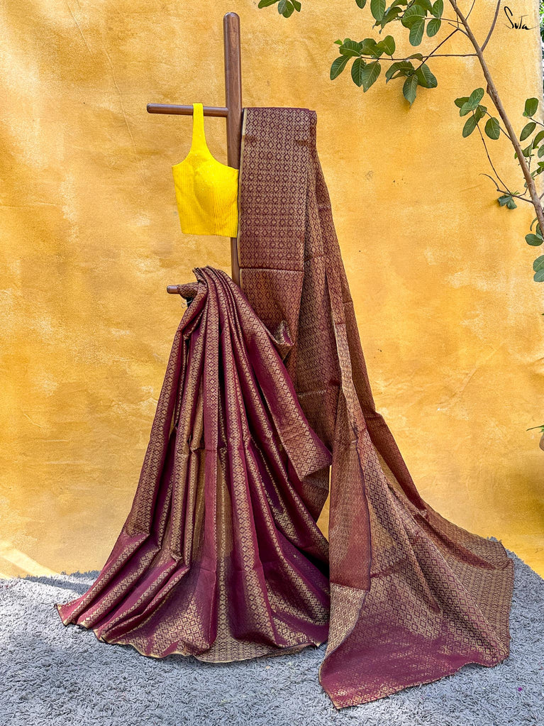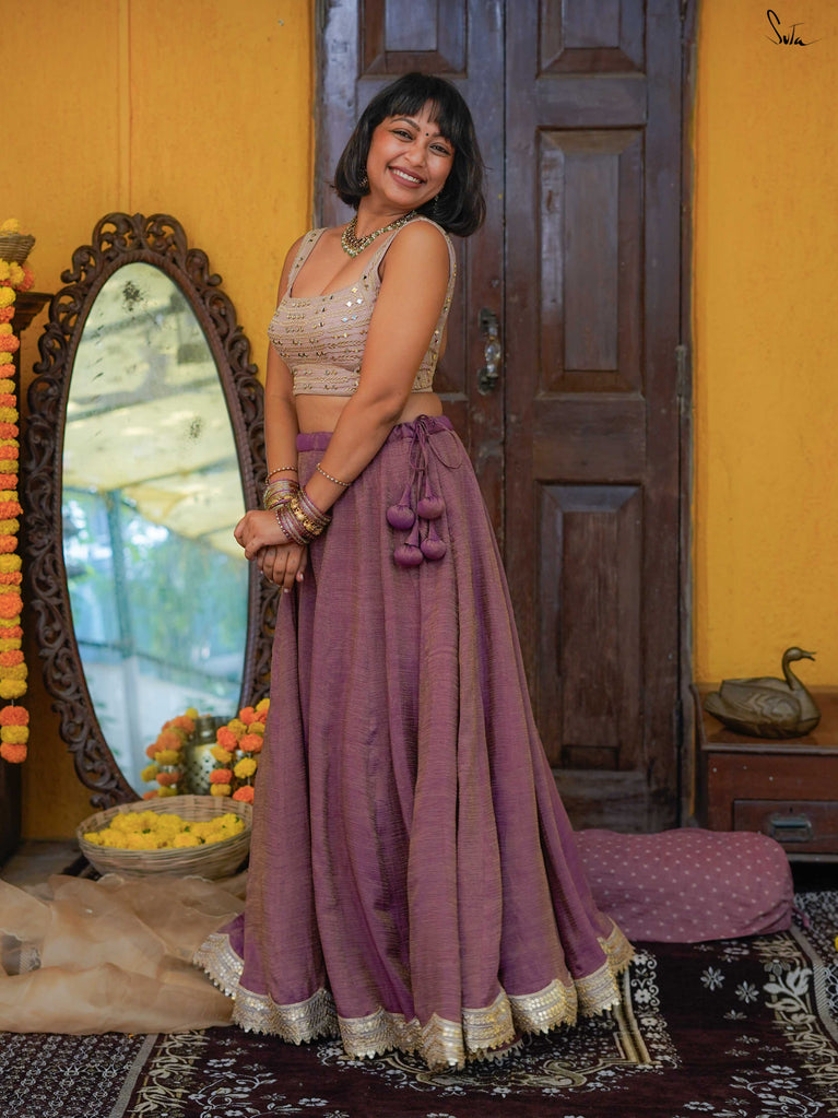 A deep wine hue that feels festive, warm, and quietly striking. This crushed viscose lehenga is made for wedding days that stretch into late nights, when comfort matters as much as celebration. Light, fluid, and softly lustrous, it moves with you through every hug, step, and dance. The scalloped gold lace adds a touch of glow, while tassels bring in that little hint of fun. Wear it with a blouse for a classic festive look, drape it with a saree, or style it as a skirt with your favourite crop top. Because mama ki shaadi calls for joy, without the heaviness.
