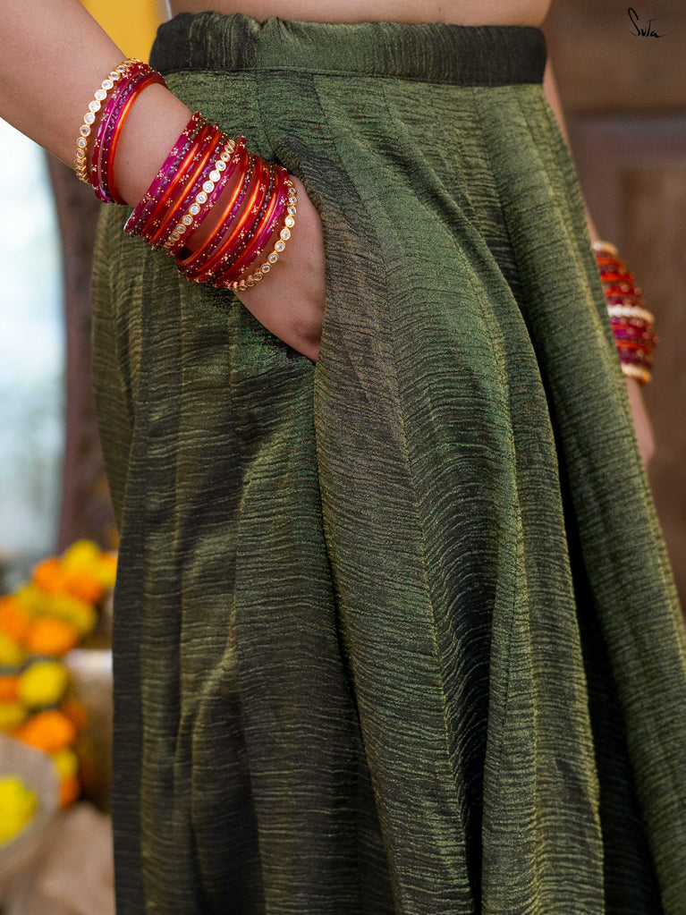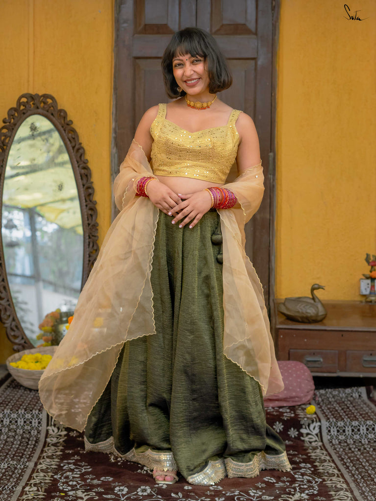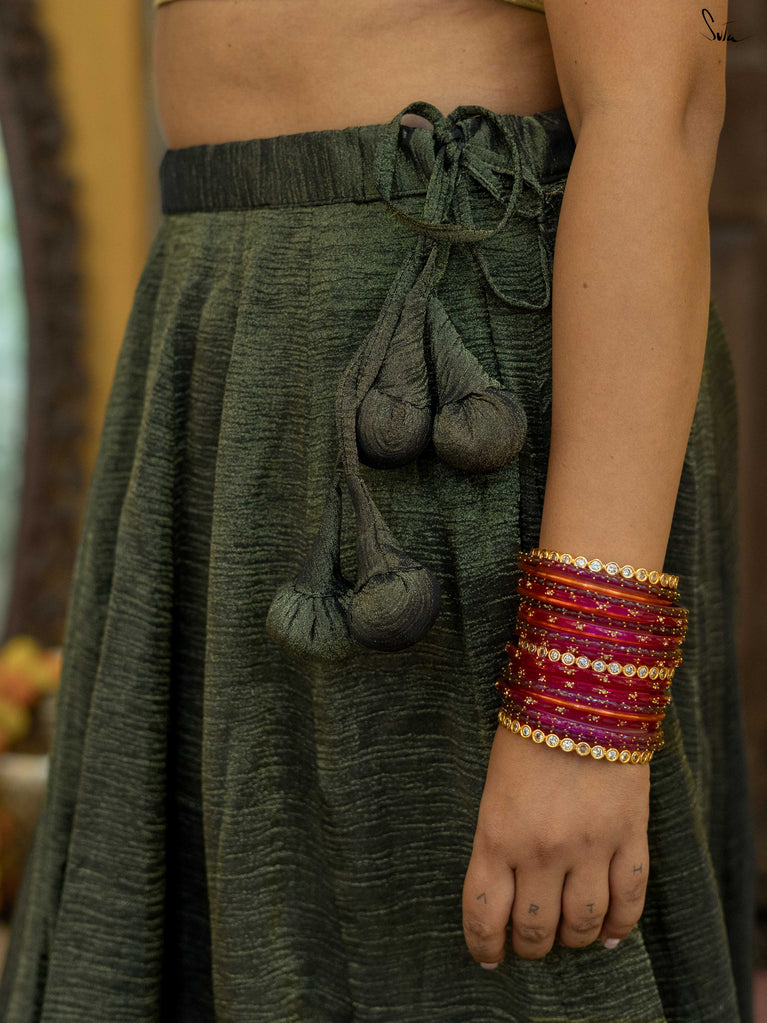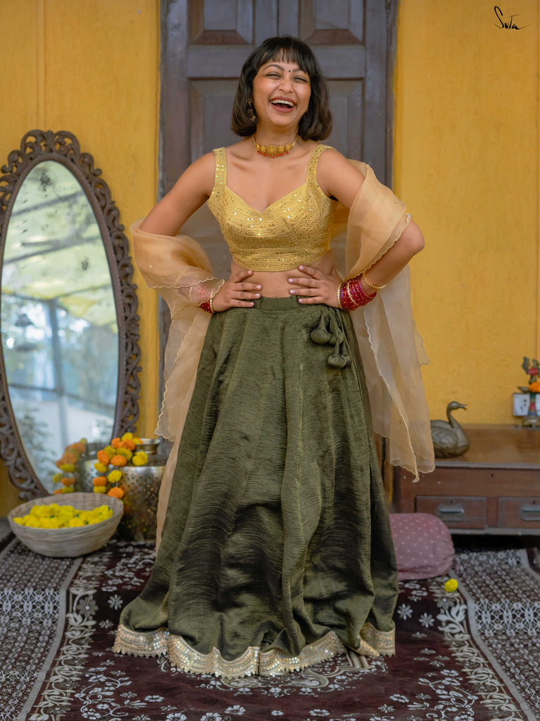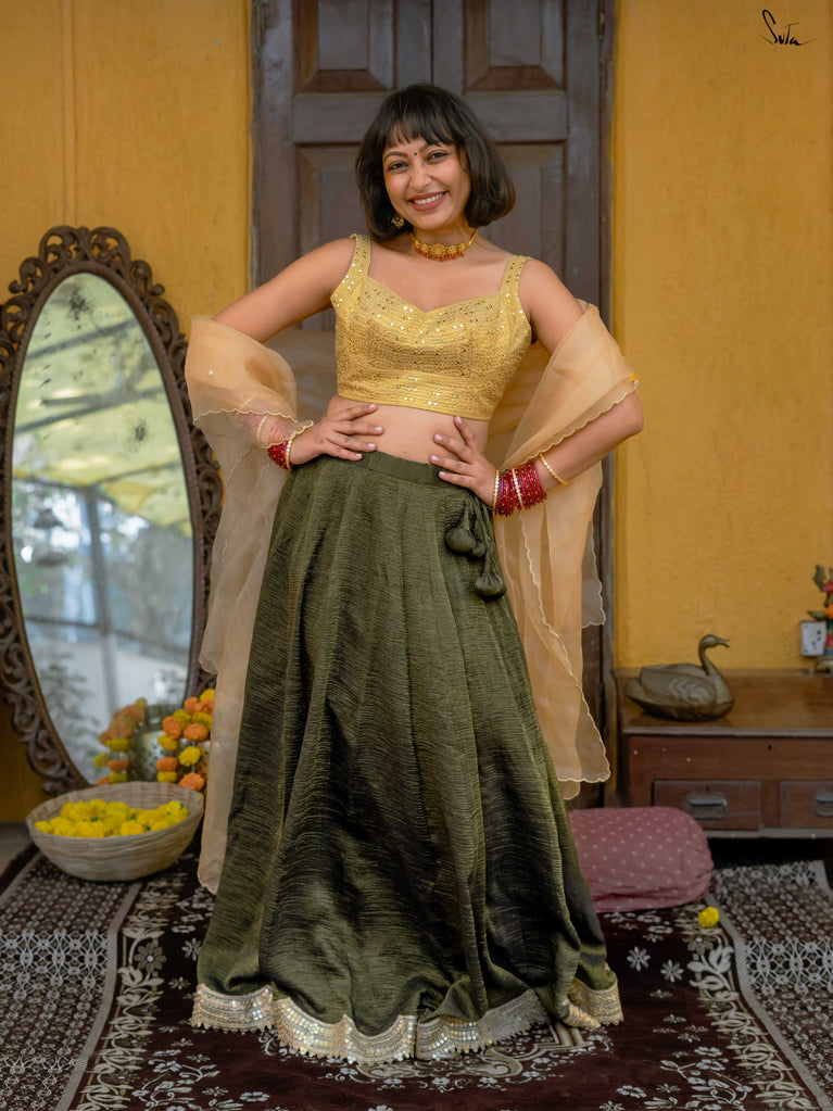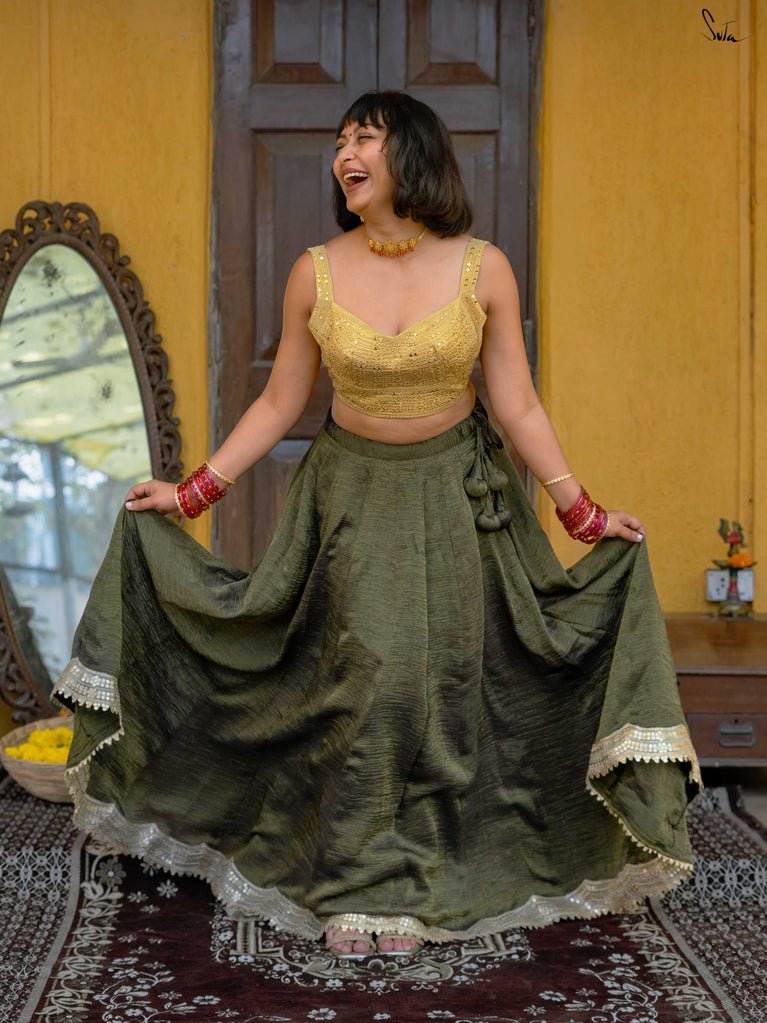 A rich green that feels festive without trying too hard. This crushed viscose lehenga is made for wedding days filled with movement, walking between functions, dancing when your song comes on, sitting wherever there’s space. Light, breathable, and fluid, it has a soft festive sheen that catches the light just right. Finished with scalloped gold lace and playful tassels, it brings in celebration without the weight. Style it with a blouse, drape it with a saree, or wear it as a skirt with your favourite crop top.Because when it’s chacha ki shaadi, comfort and fun go hand in hand.
