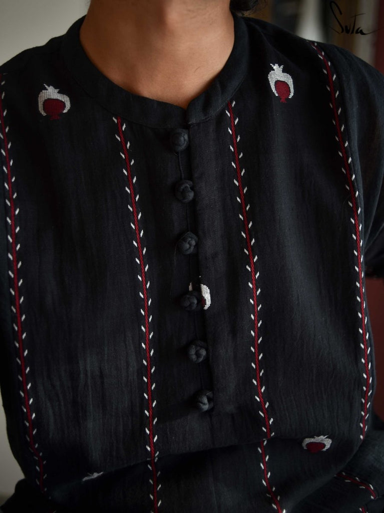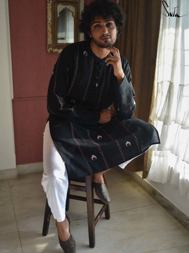 This handloom cotton kurta in black with red and white detailing has been made with as much love as you knew of during the growing-up years. Drape it to experience the warmth of your childhood, and then some more.