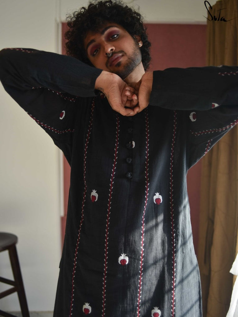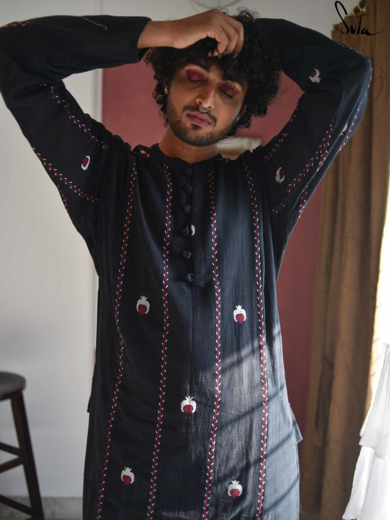 This is a handloom cotton kurta. The beautiful pomegranate-inspired motif that symbolizes the co-existence of contrasts is handwoven into the fabric and brings a gorgeous charm to the kurta. It reflects the idea of breaking stereotypes and looking at things in more than one way, of acceptance and un-labeling.Handloom cotton is a type of fabric that is woven using hand operated looms. Two sets of interlacing yarns, the warp (length) and weft (width), are woven on a mechanised loom operated by weavers. These looms do not use electricity. Human handling lends the fabrics a unique feel and renders the fabrics more value. The art of hand weaving is labour intensive and takes a longer time. But, the beauty it adds to the fabric is priceless. Choosing handloom cotton supports the rich weaving heritage of India and lets the weavers carry on the precious art-form to the future generations as well.