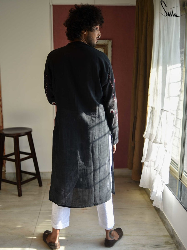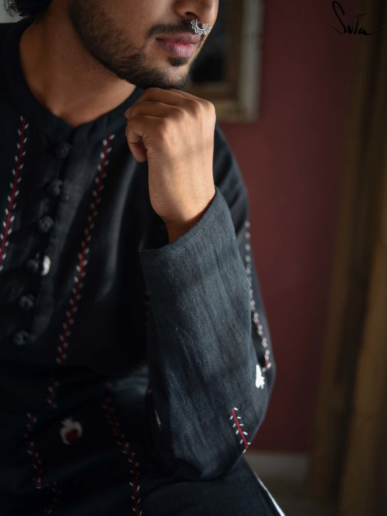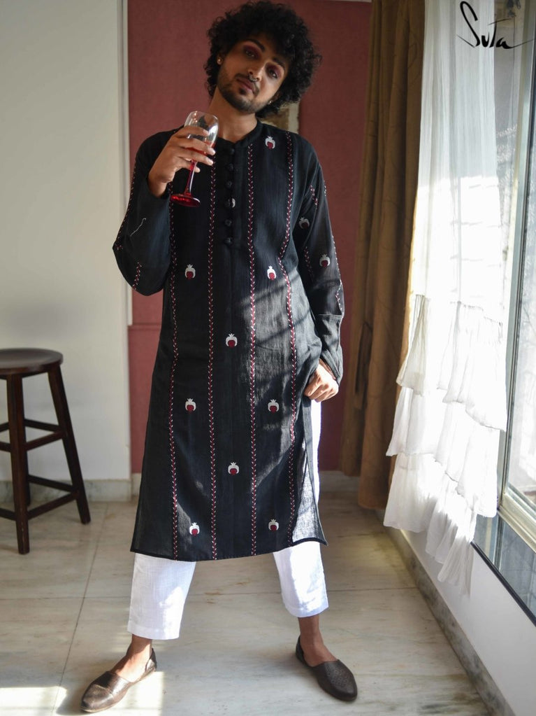 Lights out. Two tiny dimmed rays of light turn on from two sides of the king-sized bed. Two heads are seen scrolling and scrolling and scrolling endlessly — he, on his side of the bed — and she, on hers. News, tweets, WhatsApp, Facebook, Instagram, memes, funny videos, movies, series…continue on separate tracks night after night. Sudden giggles, they glance up from our phones, smile at each other, share the joke, and sometimes slide a little closer for a hug. At other times, they go back to the endless and mindless scrolling! There are of course nights when they spend hours deciding on a movie, watching it and then discussing it after it’s over at dinner. That leaves me wondering, have our gadgets made us alone even when we are together or are they somehow binding us in this strange mystery of the digital world? Are they giving us a reason to laugh and learn more often or are they taking away the small opportunities to share a moment together from our everyday lives? Do we not have enough to talk about or is it poetic bliss to be reading a book or watching our phones with our backs to each other, holding hands from time to time, and being completely comfortable in the silence that lies ahead for hours on end?This black kurta with red and white detailing may not bring you clear answers but it tends to take the shape of its wearer’s heart and sets its binding soul free.
