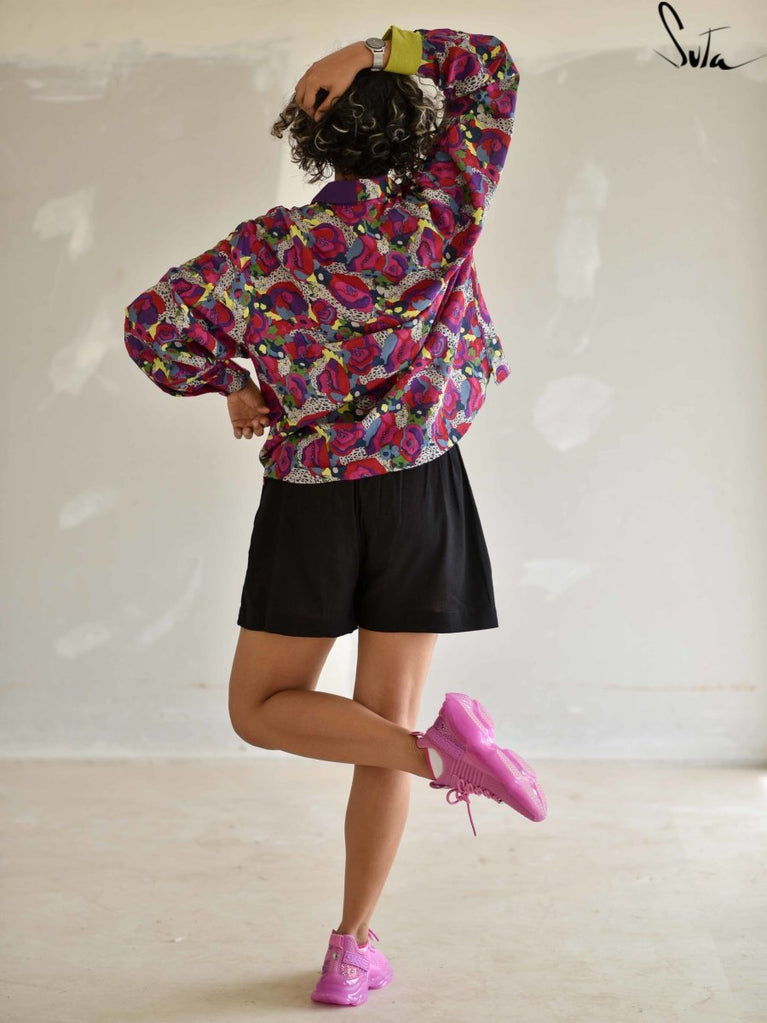 This blouse is made from a beautiful viscose blend fabric that has a subtle shine to it along with being very soft on the skin. The colors come alive on the fabric that brings comfort and style together.