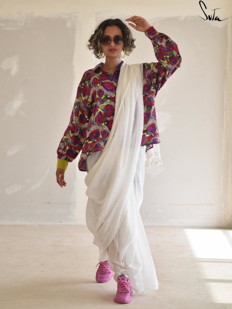 This pristine white handloom cotton shirt thats been designed such that one size flatters all body types (XS to 2XL) will envelop you in a soft, freeing embrace.