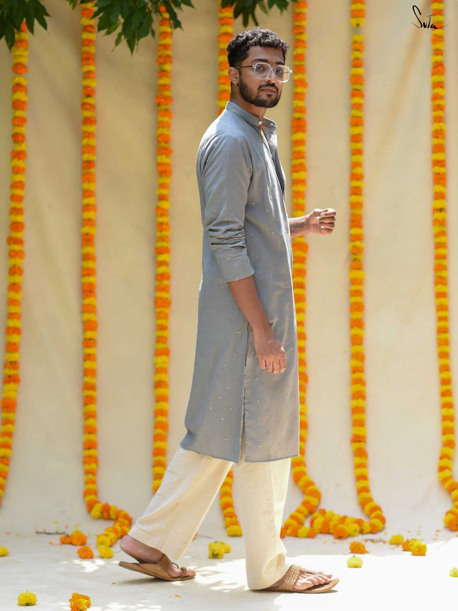 The Ash Ki Raat Kurta captures the allure of evening celebrations. In a graceful shade of grey, this cotton kurta boasts delicate tone-on-tone flower butta and shimmering sequins. Its understated elegance is ideal for festive gatherings, allowing you to celebrate the warmth of togetherness in effortless style.