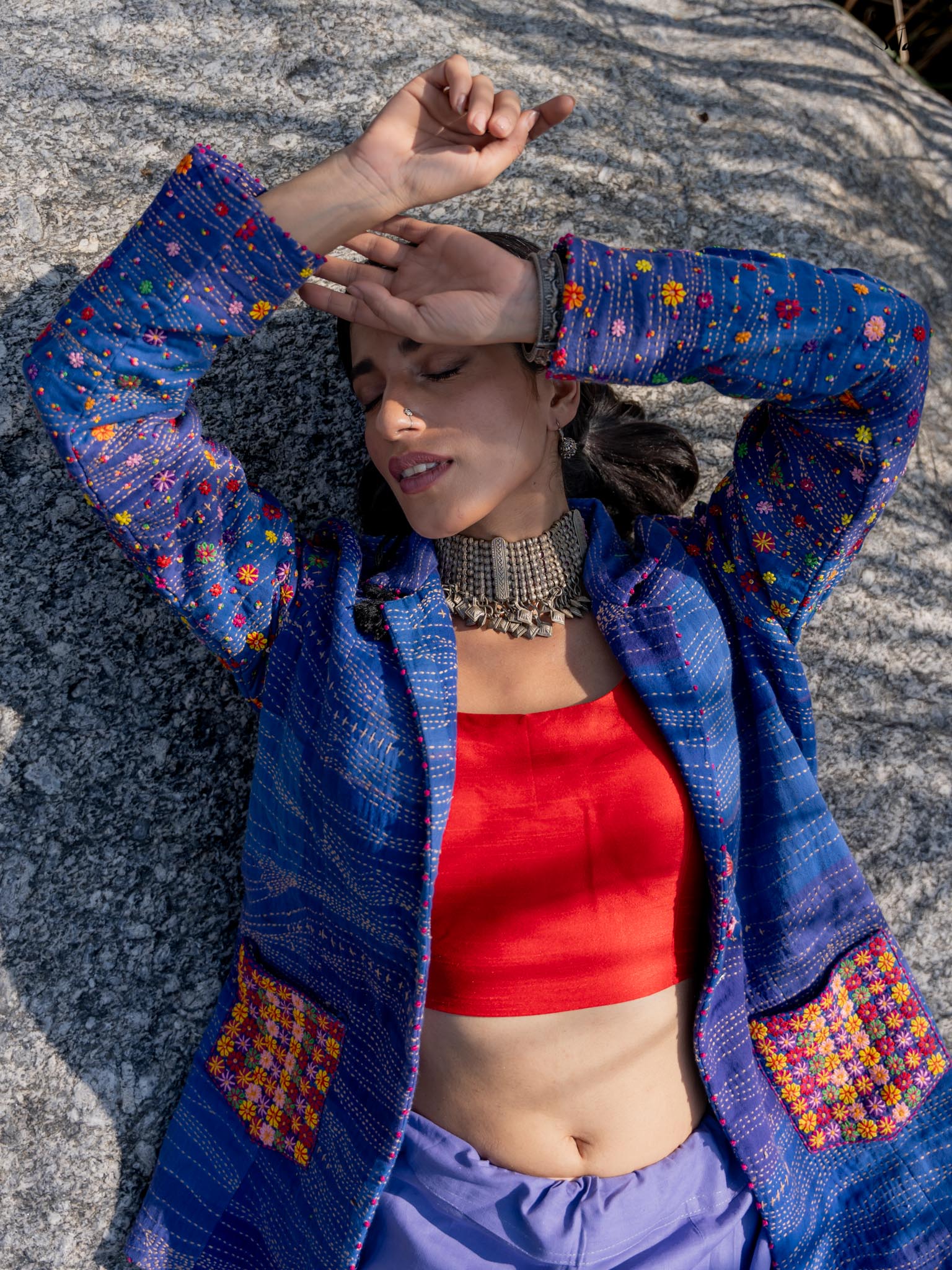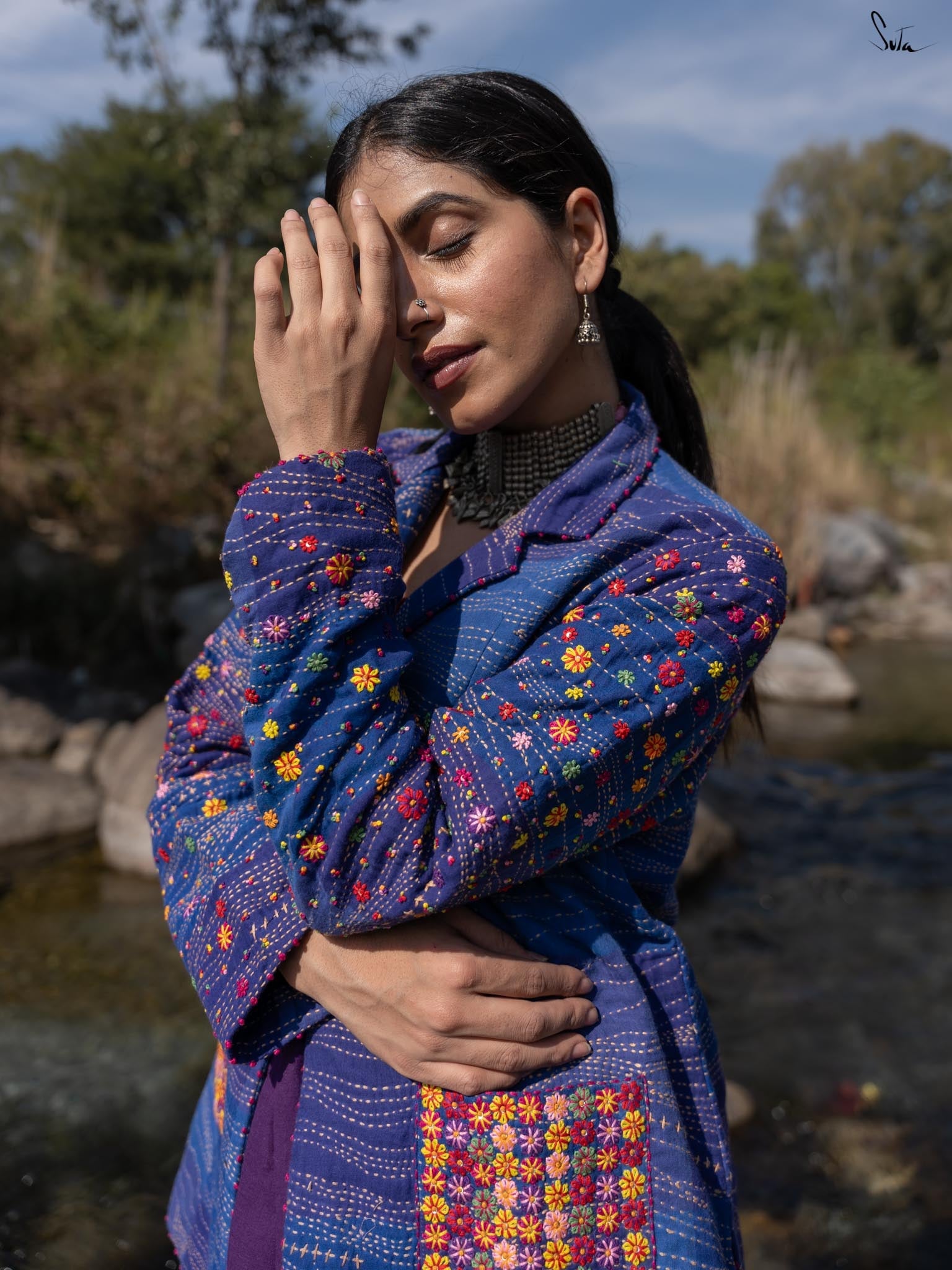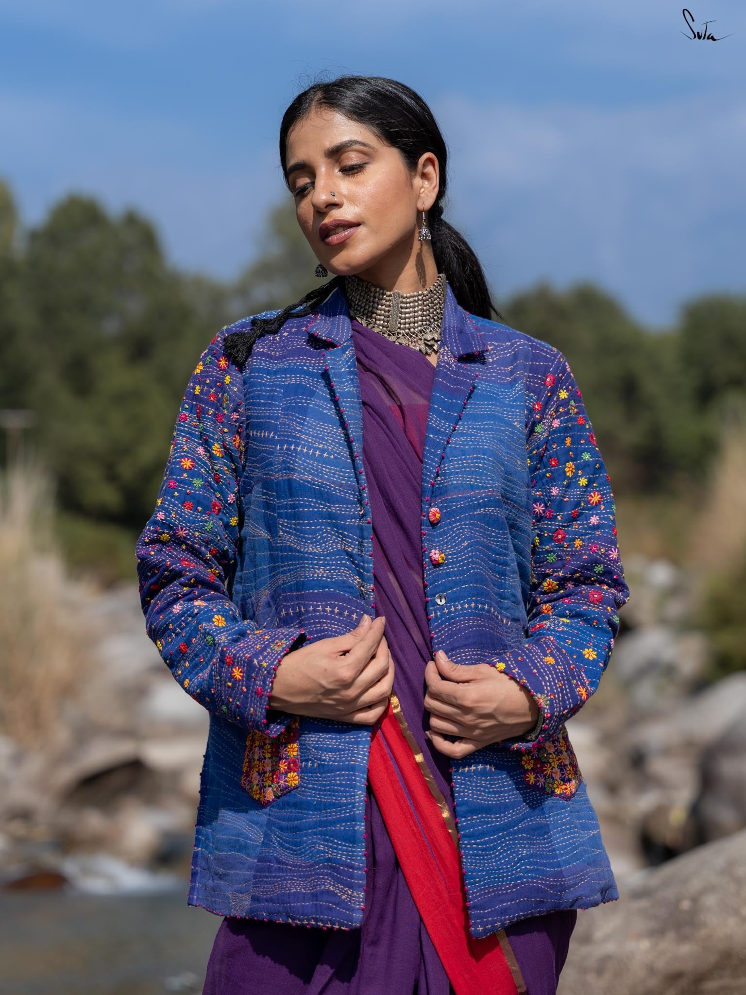 Inspired by the tranquil coastal town of Bardez, this jacket from Suta’s Bageecha collection tells a story of serene blues and vibrant florals. The deep shades of blue, quilted with traditional Katha running stitches, carry the stories of skilled hands passing from one artisan to another. The multicolor floral embroidery on the pockets and sleeves, meticulously hand-stitched, showcases the artistry of our craftsmen who infuse each design with their heart and soul. The pink French knots at the jacket and sleeve hems are a delicate finishing touch, each knot a tiny act of love. The buttons, embroidered with flower motifs, further reflect the care that has gone into this jacket. This creation is more than just a garment; it’s a narrative of tradition, artistry, and the love of our craftsmen that flows through each intricate detail.