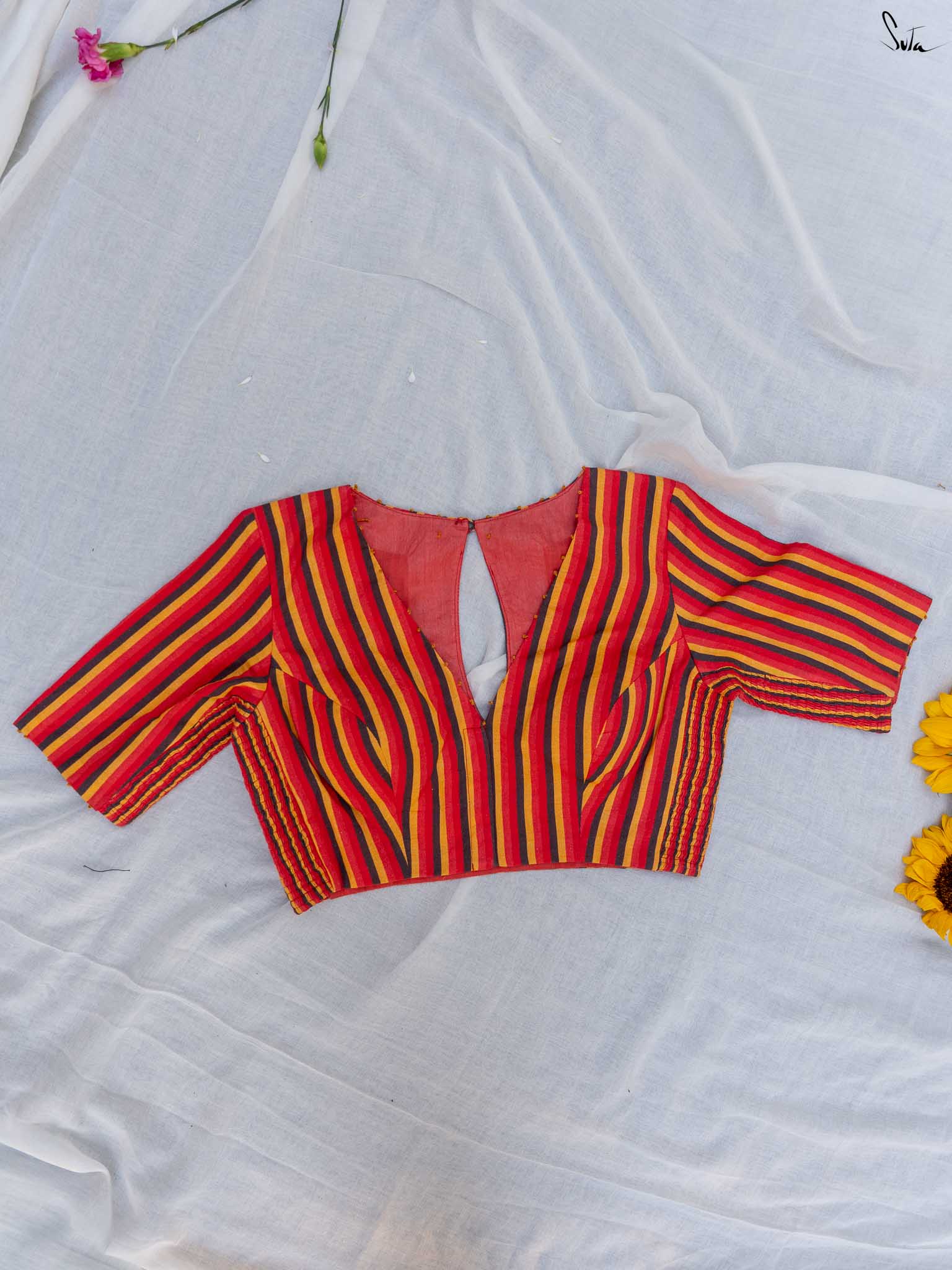 Bright, playful, and full of movement, this blouse mirrors the lively hues of Basant. The soft cotton fabric keeps it breathable, while the V-neck and quarter sleeves offer an easy, flattering fit. Side elastic adds gentle stretch, and the back keyhole detail finishes it with a touch of charm.