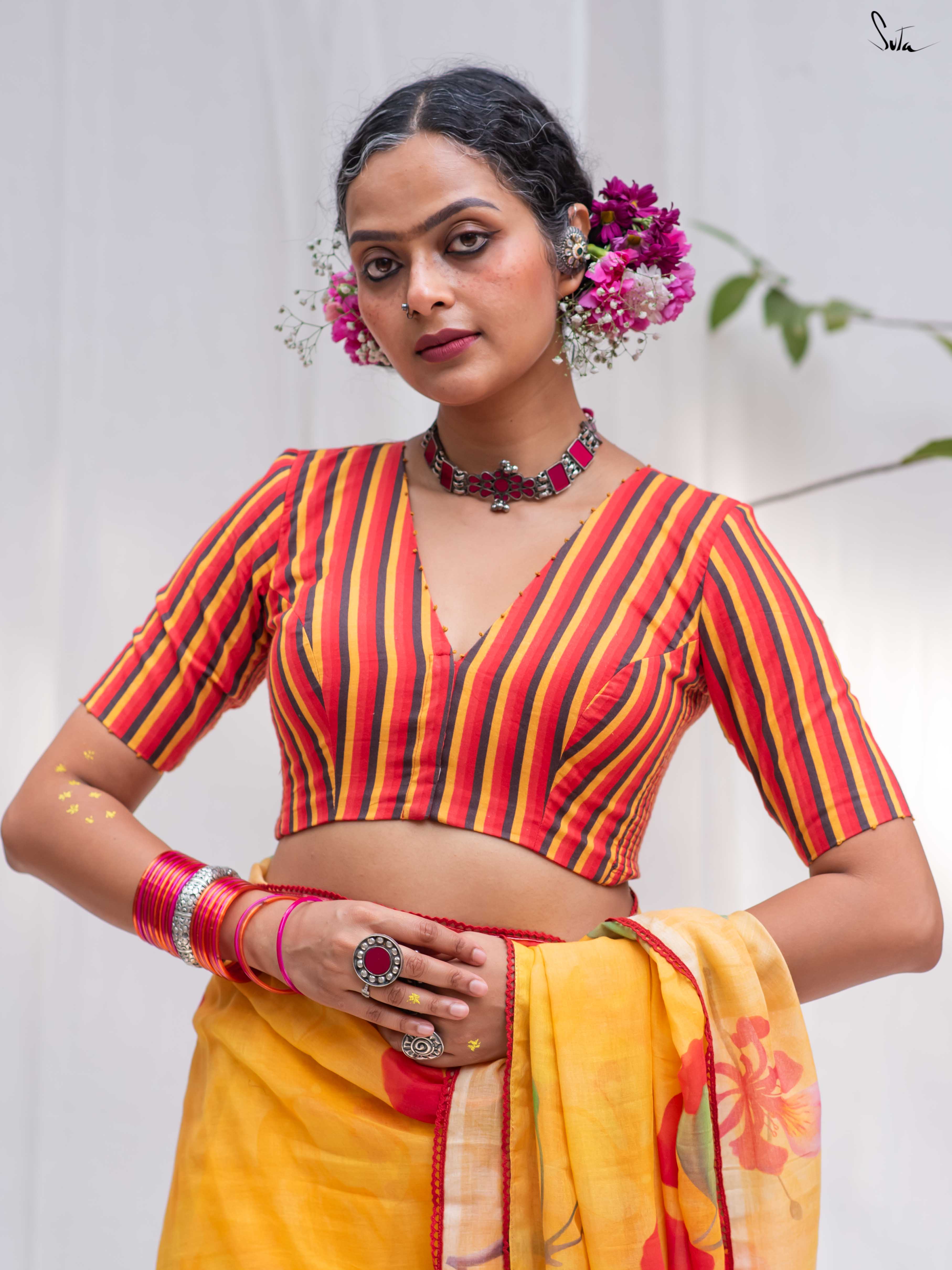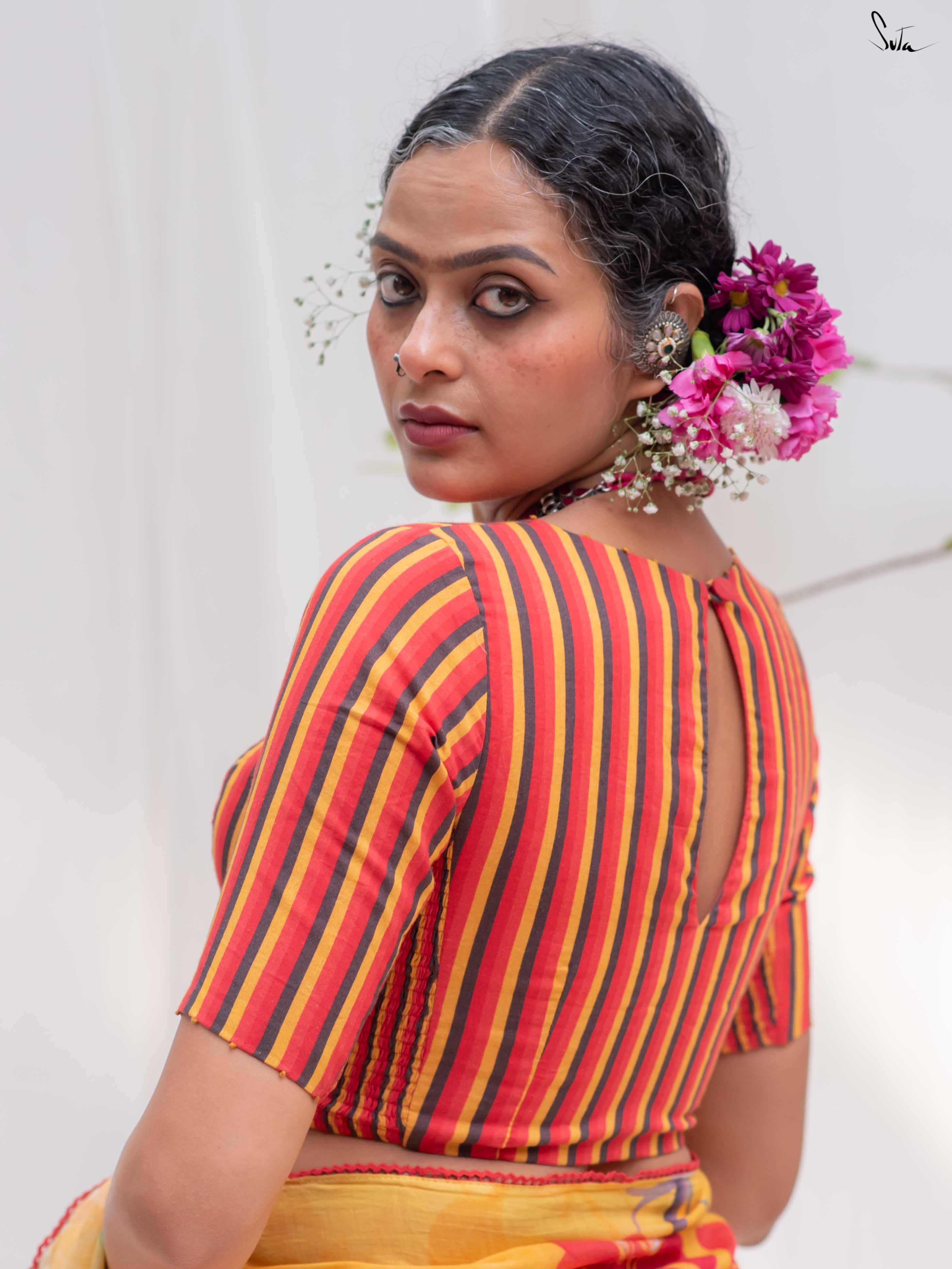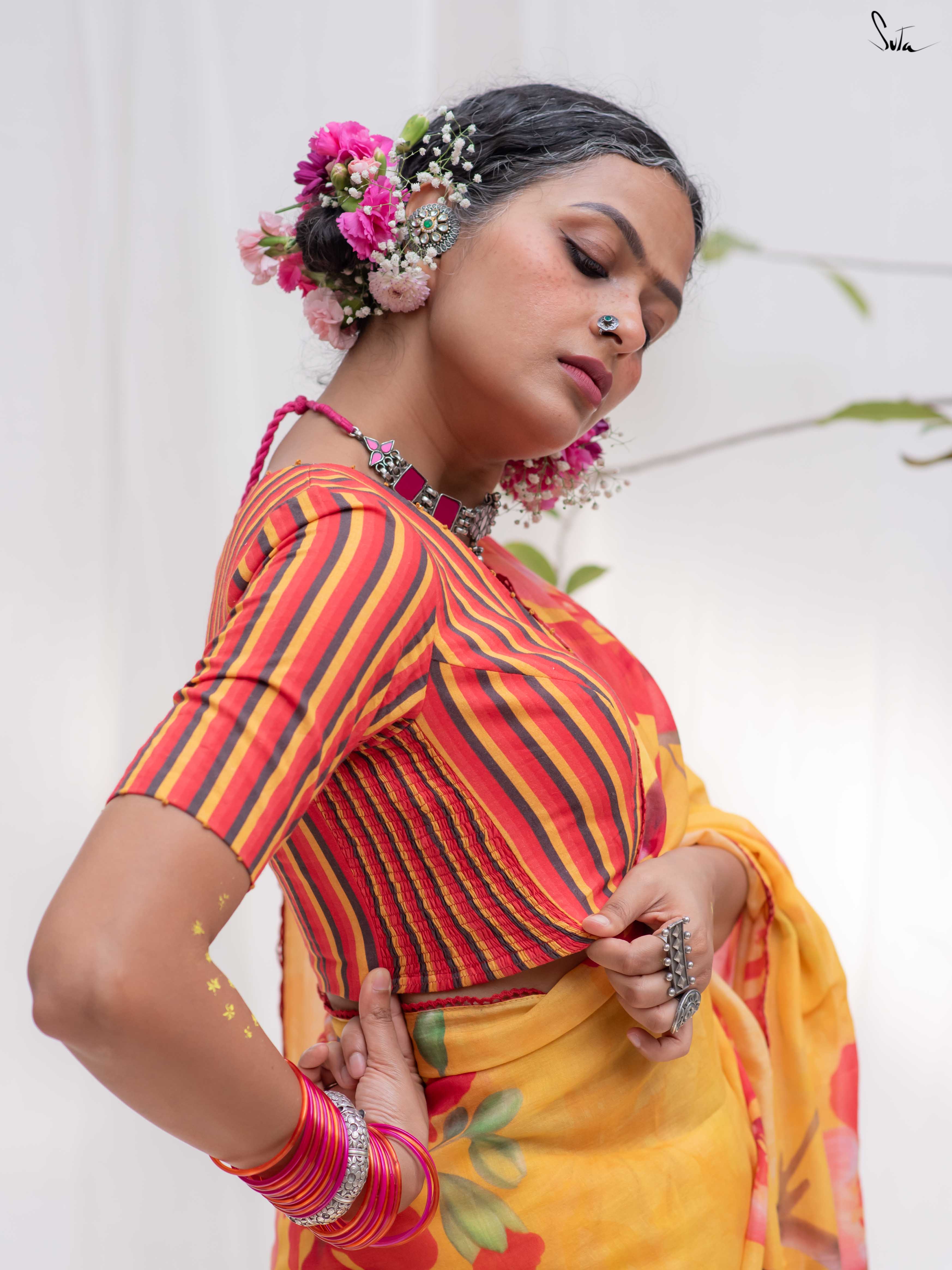 Saree: Su, the model is wearing a size S blouse and the saree called Palash Sa Basant