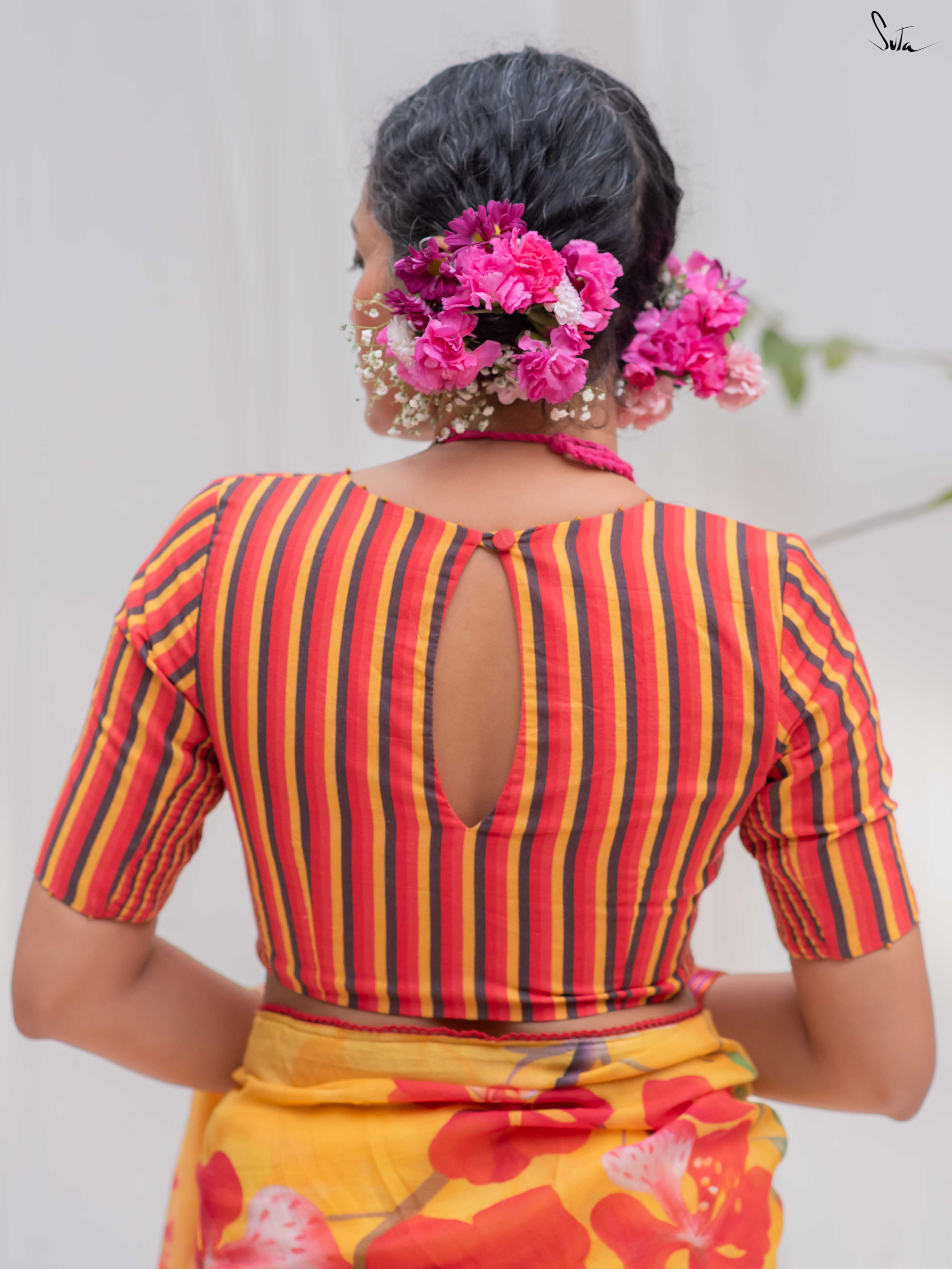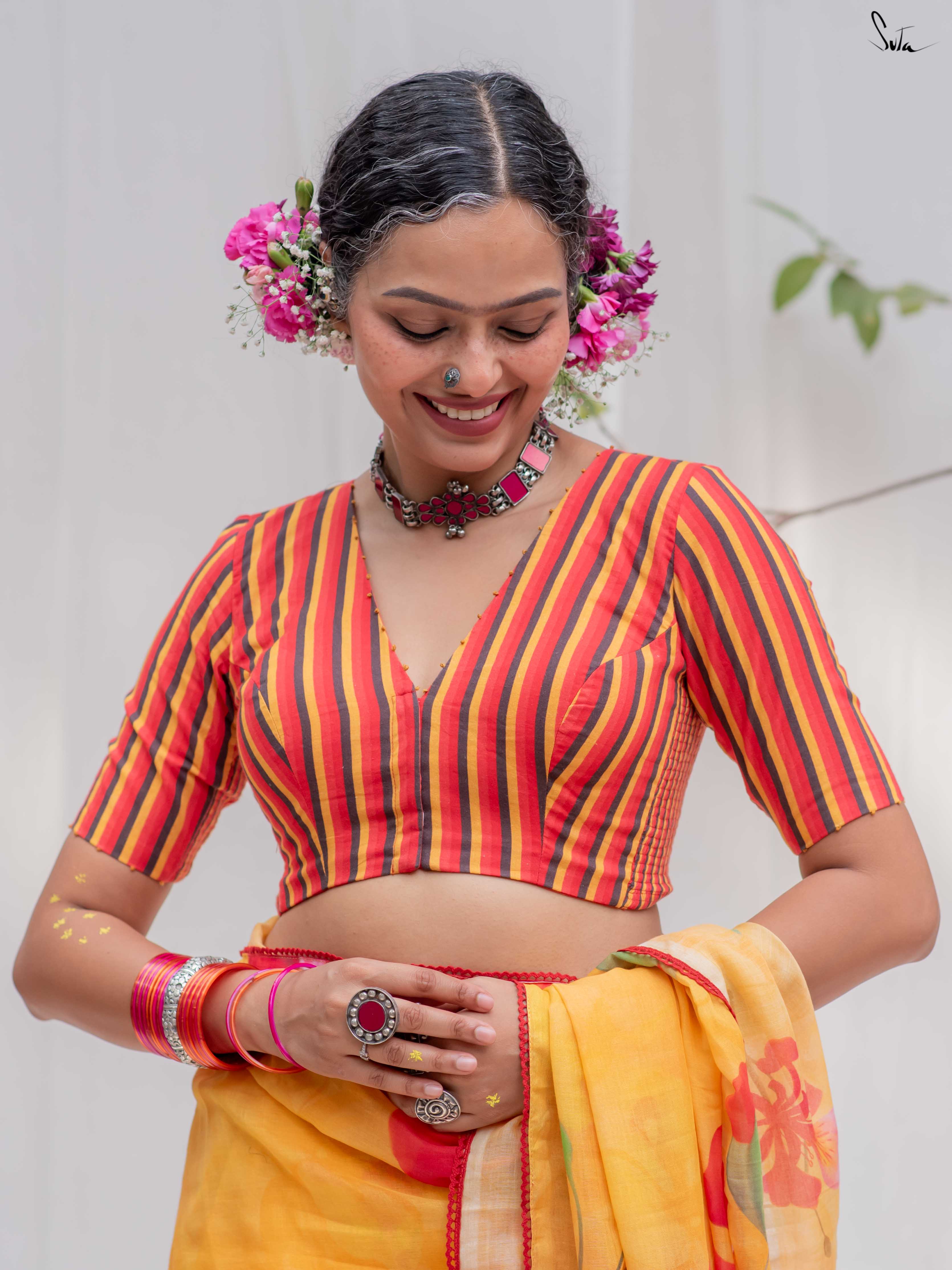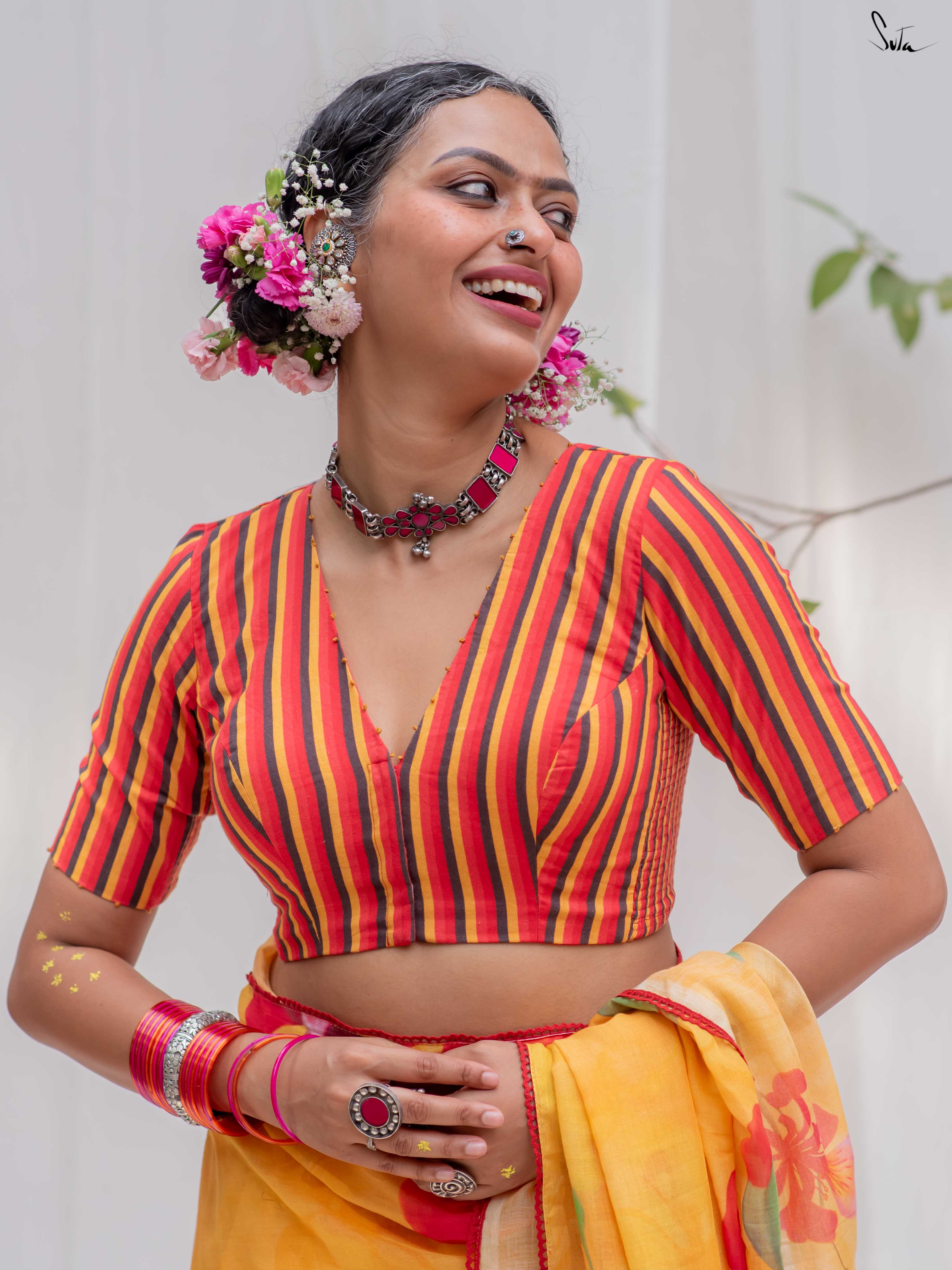 Saree: Su, the model is wearing a size S blouse and the saree called Palash Sa Basant