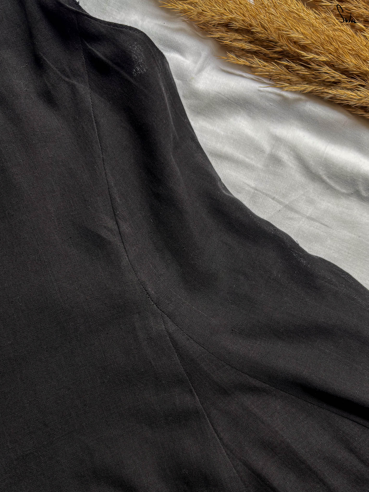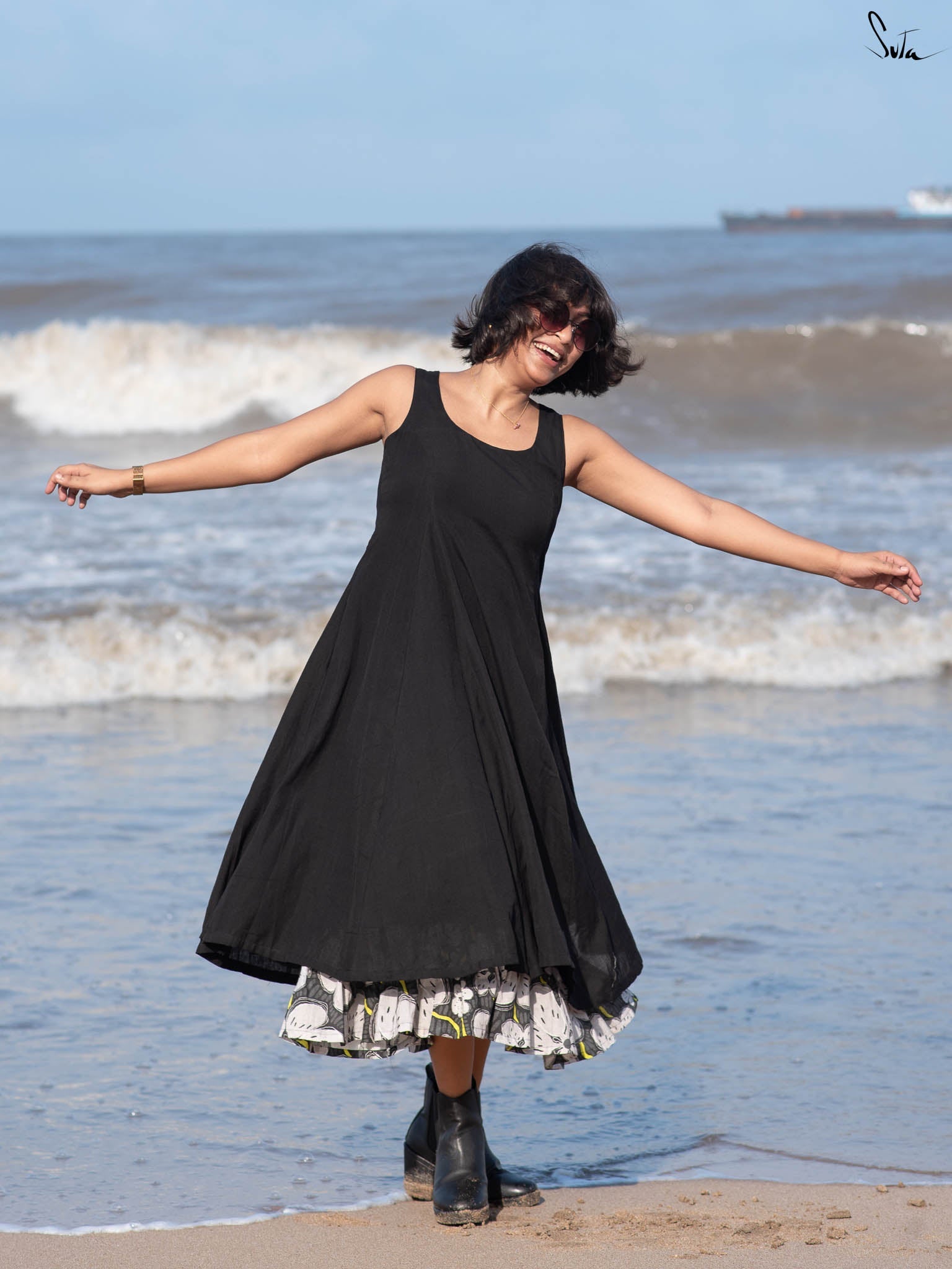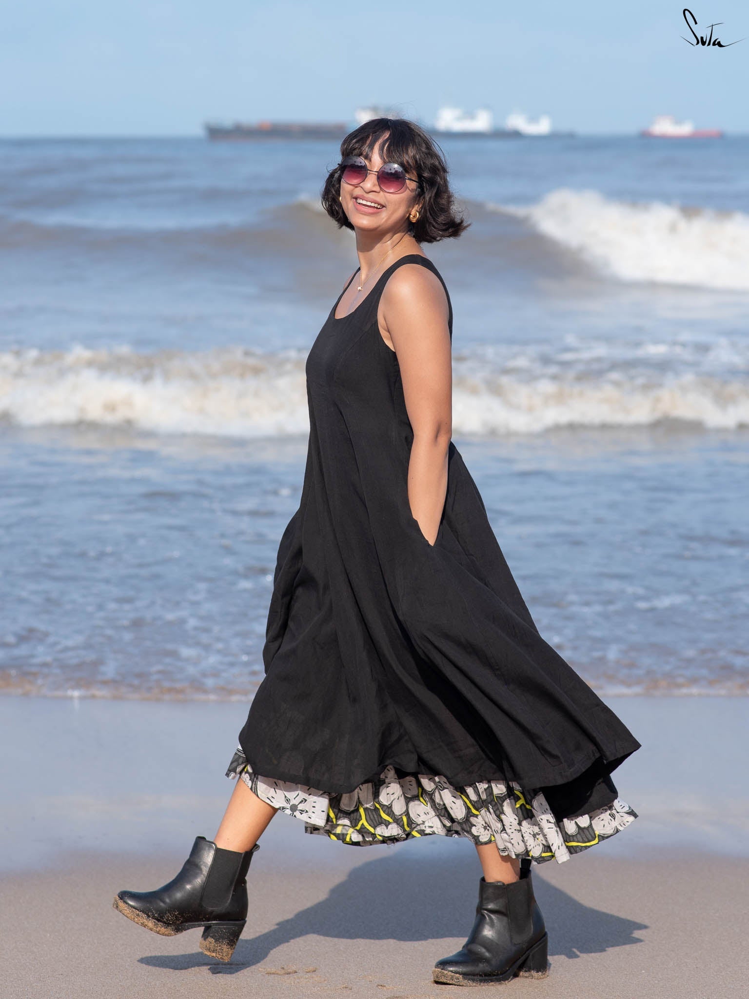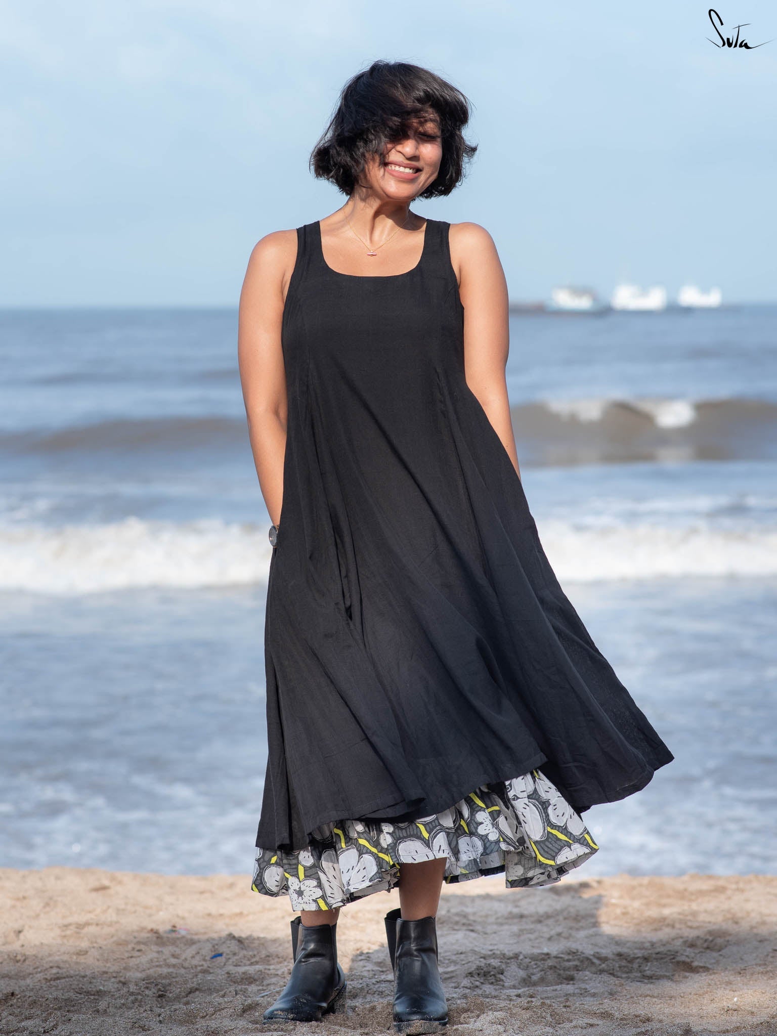 A blend of solid panels and floral print, this dress channels a carefree spirit rooted in balance. The digital artwork adds bursts of color without overwhelming, while soft frills at the hem bring gentle movement.