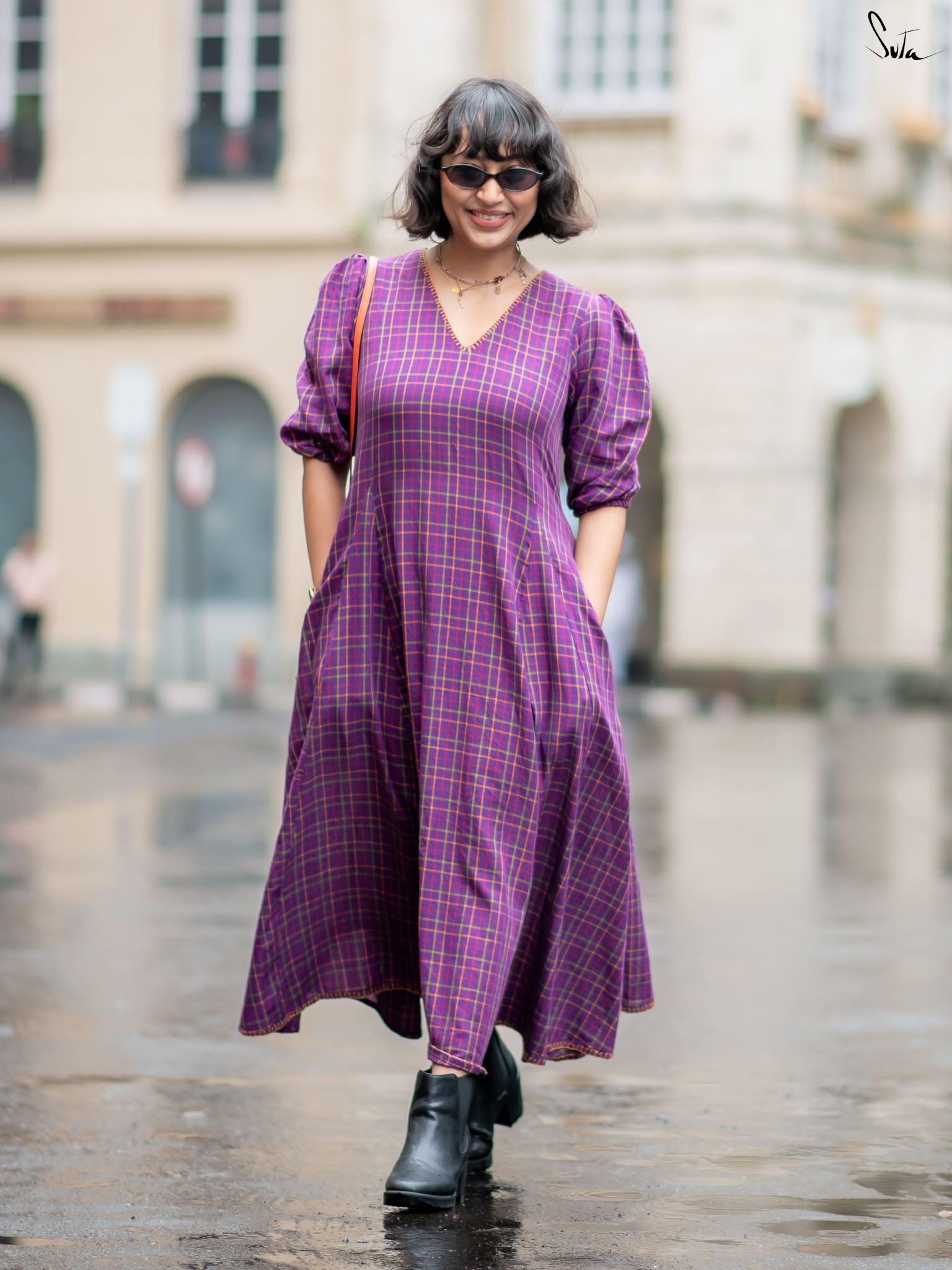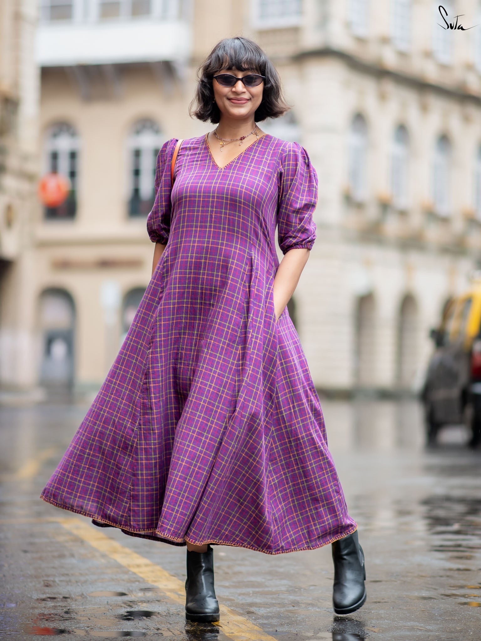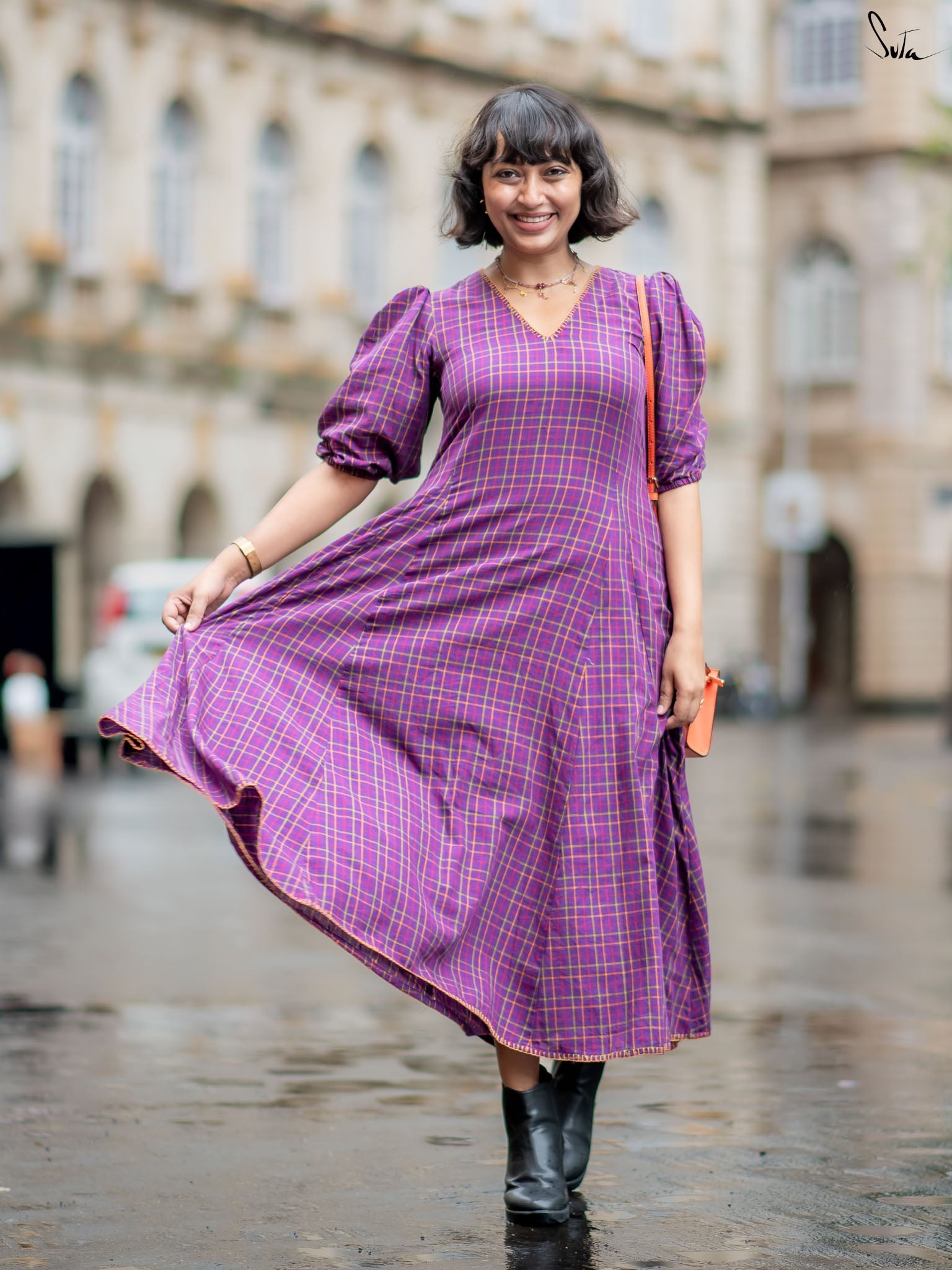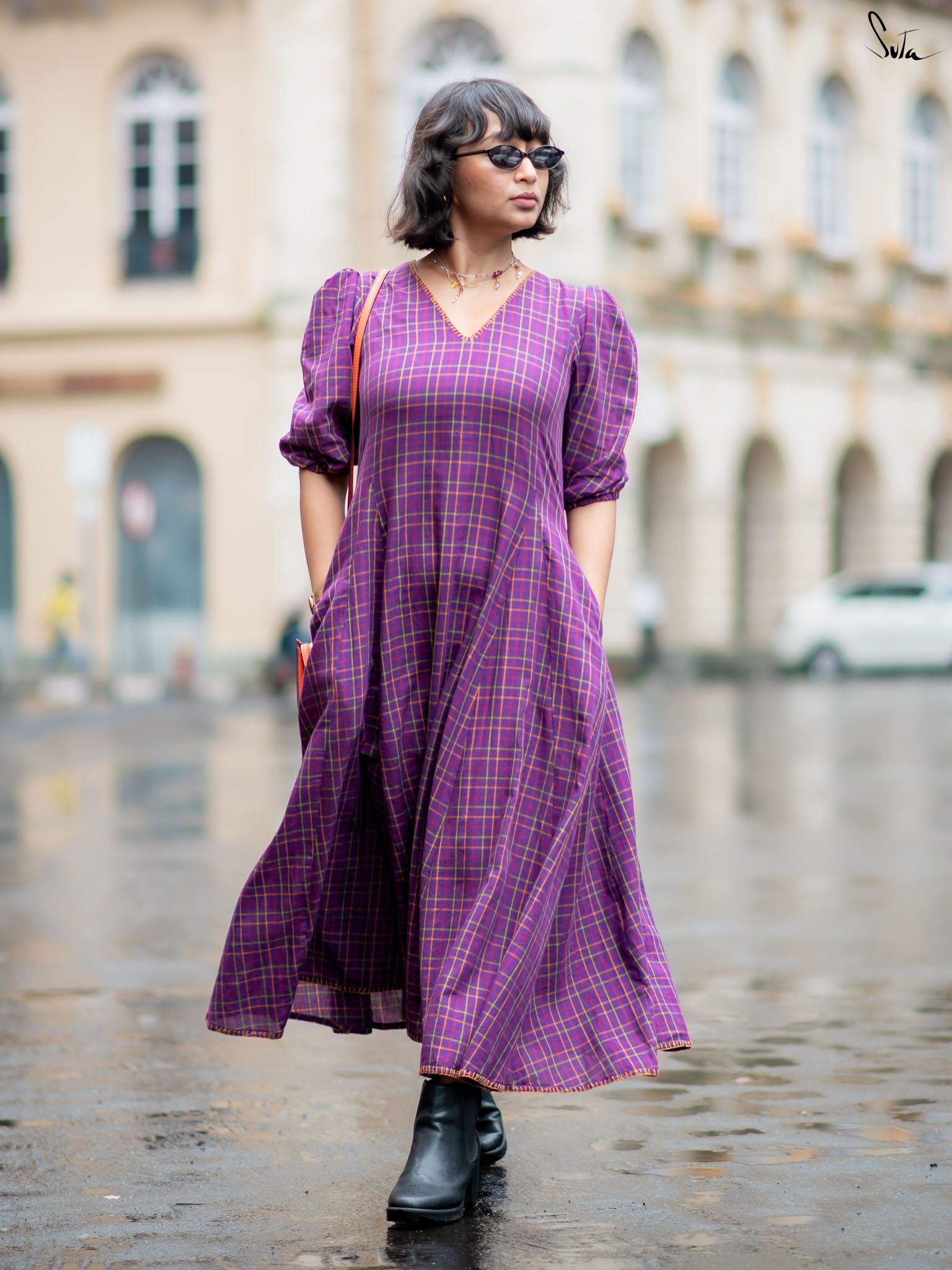 Checks with a twist! This purple cotton midi dress redefines a classic in V-neckline with  contrasting mustard blanket stitches, a design detail that subtly draws attention. The breathable cotton keeps it summer-ready, while the puff sleeves and easy flare make it an all-day comfort pick. It’s your go-to for market strolls, casual catch ups, or just feeling cute on a weekday.