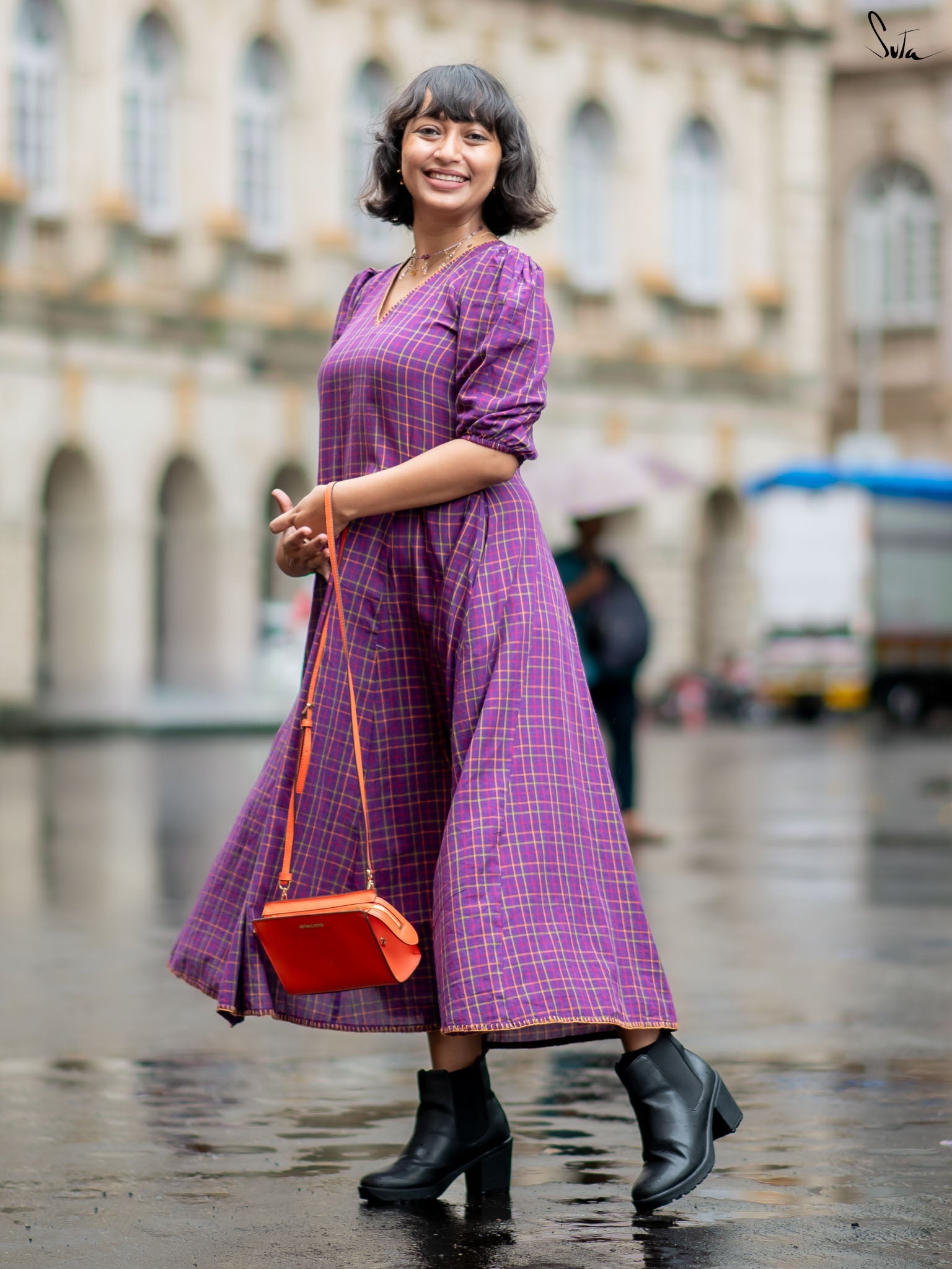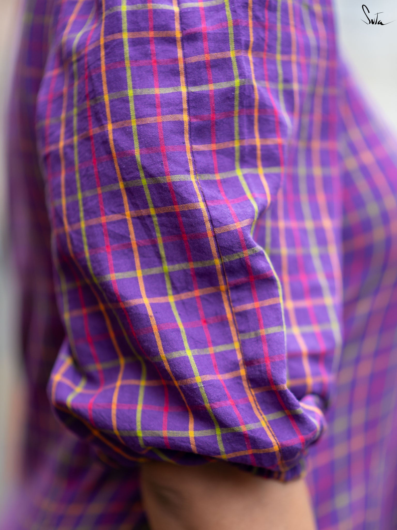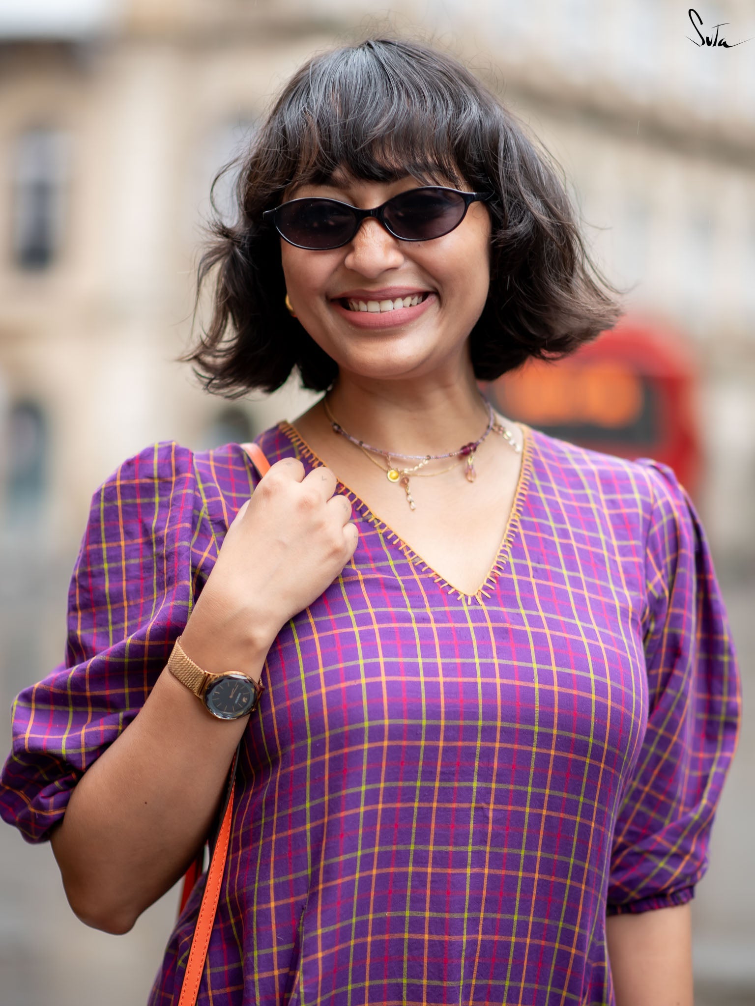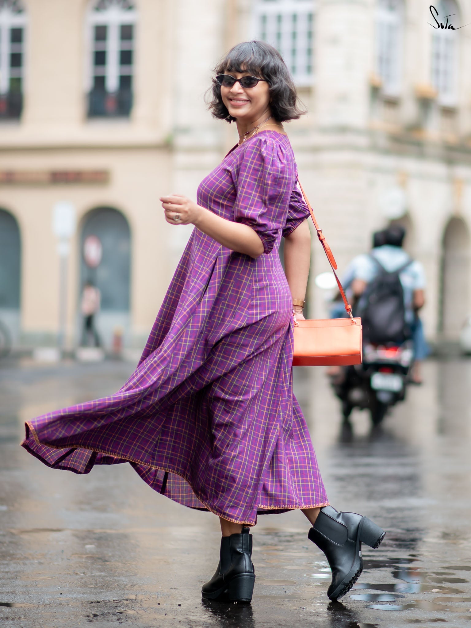 Checks with a twist! This purple cotton midi dress redefines a classic in V-neckline with  contrasting mustard blanket stitches, a design detail that subtly draws attention. The breathable cotton keeps it summer-ready, while the puff sleeves and easy flare make it an all-day comfort pick. It’s your go-to for market strolls, casual catch ups, or just feeling cute on a weekday.