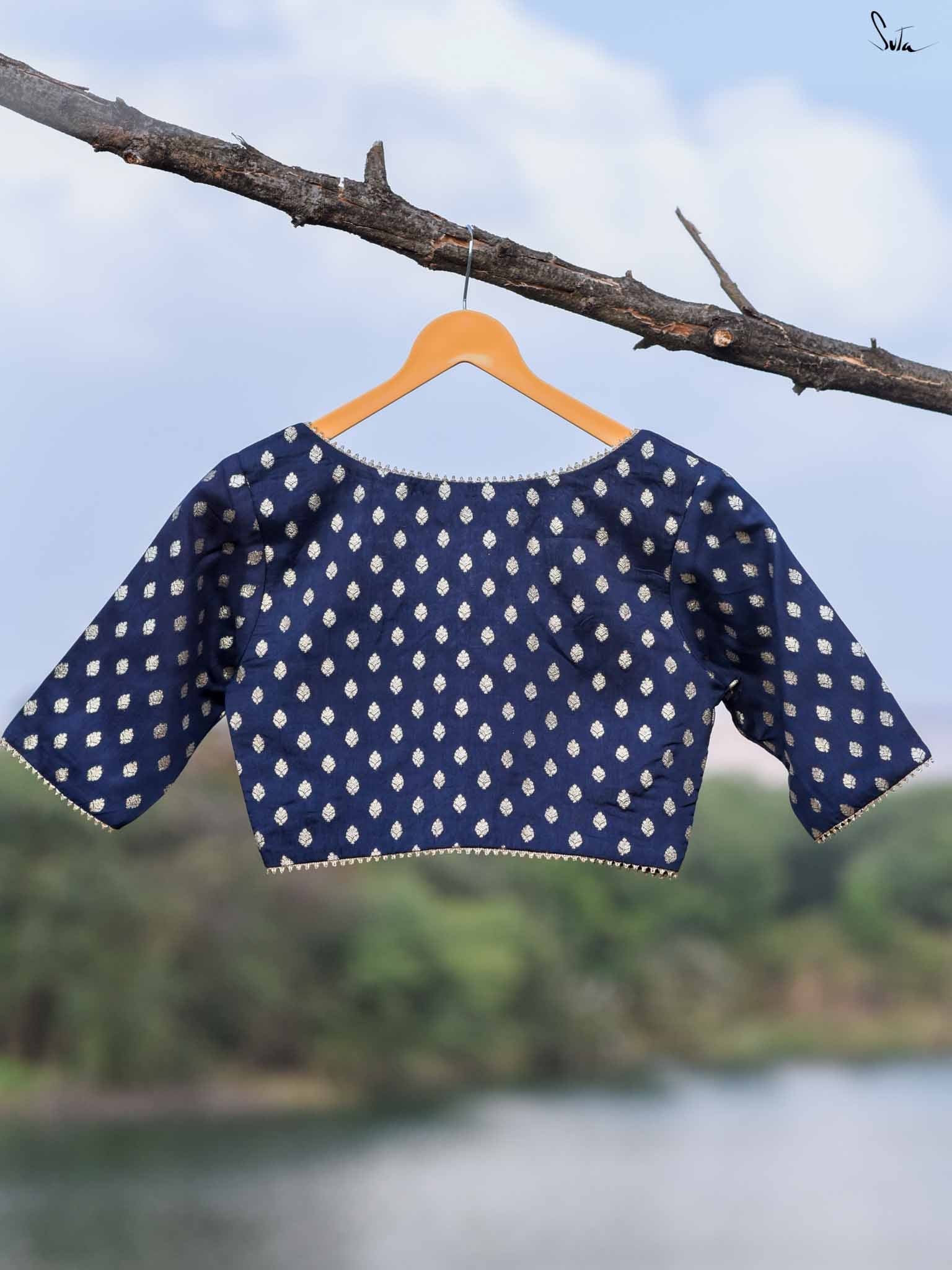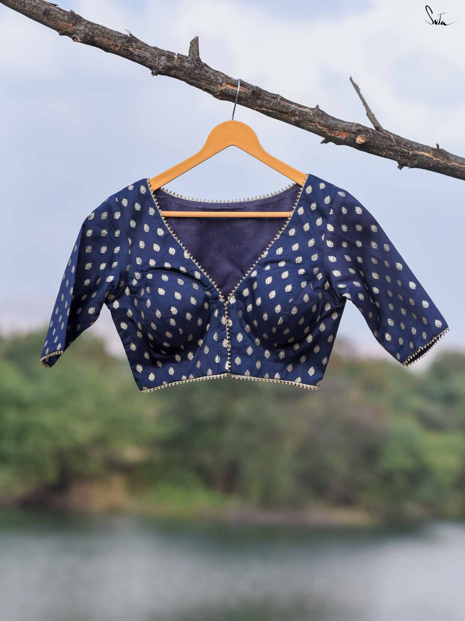 Divya Jyoti is a navy blue blouse in a viscose blend, accented with lace detailing. The striking V-neckline, front hook opening, and elbow-length sleeves add a unique flair to your saree look.