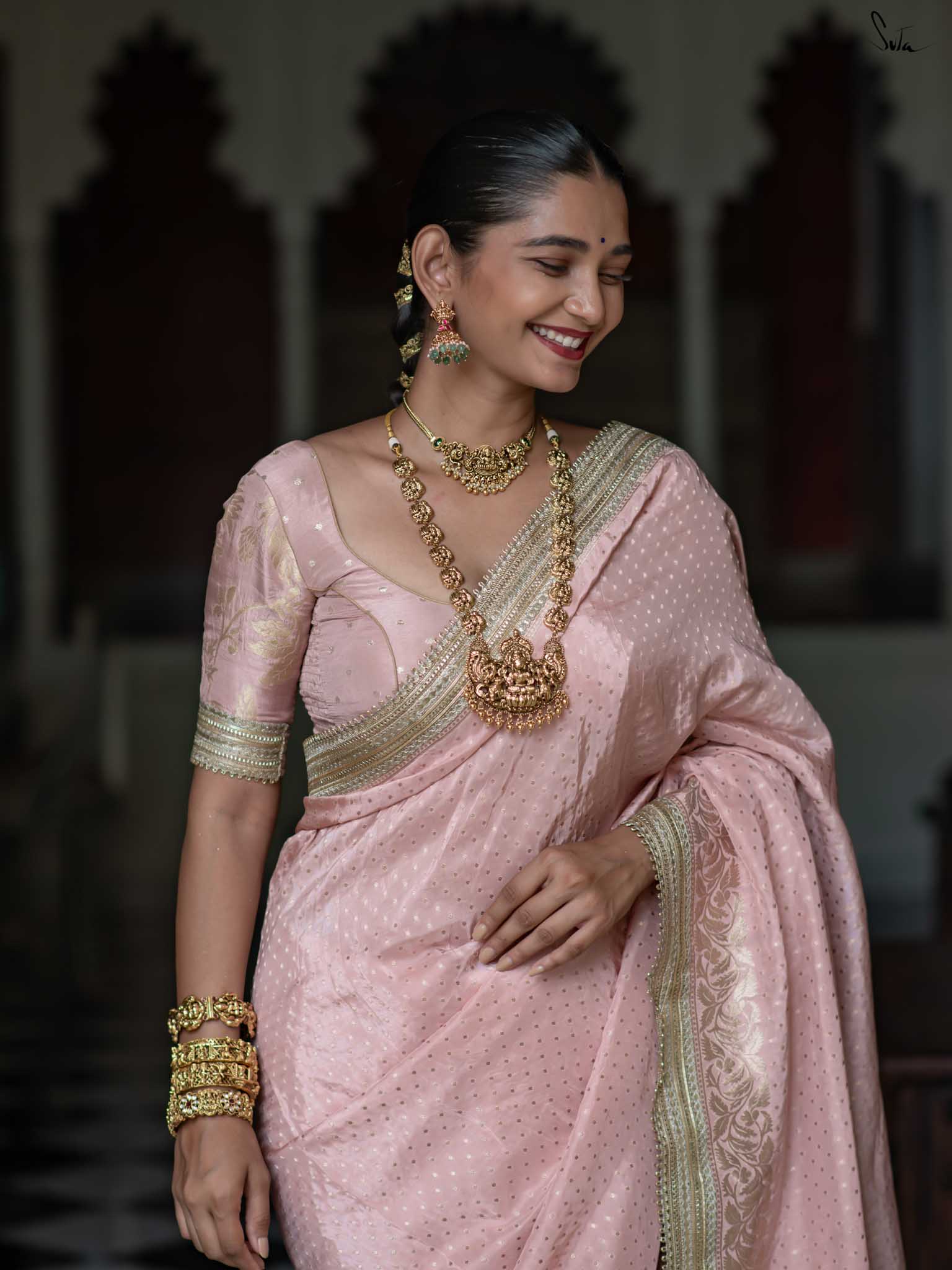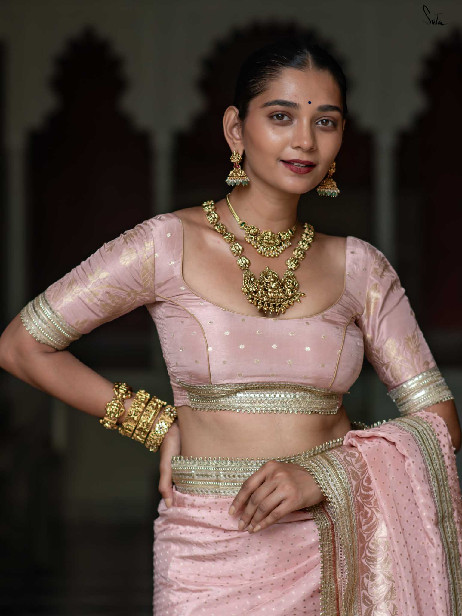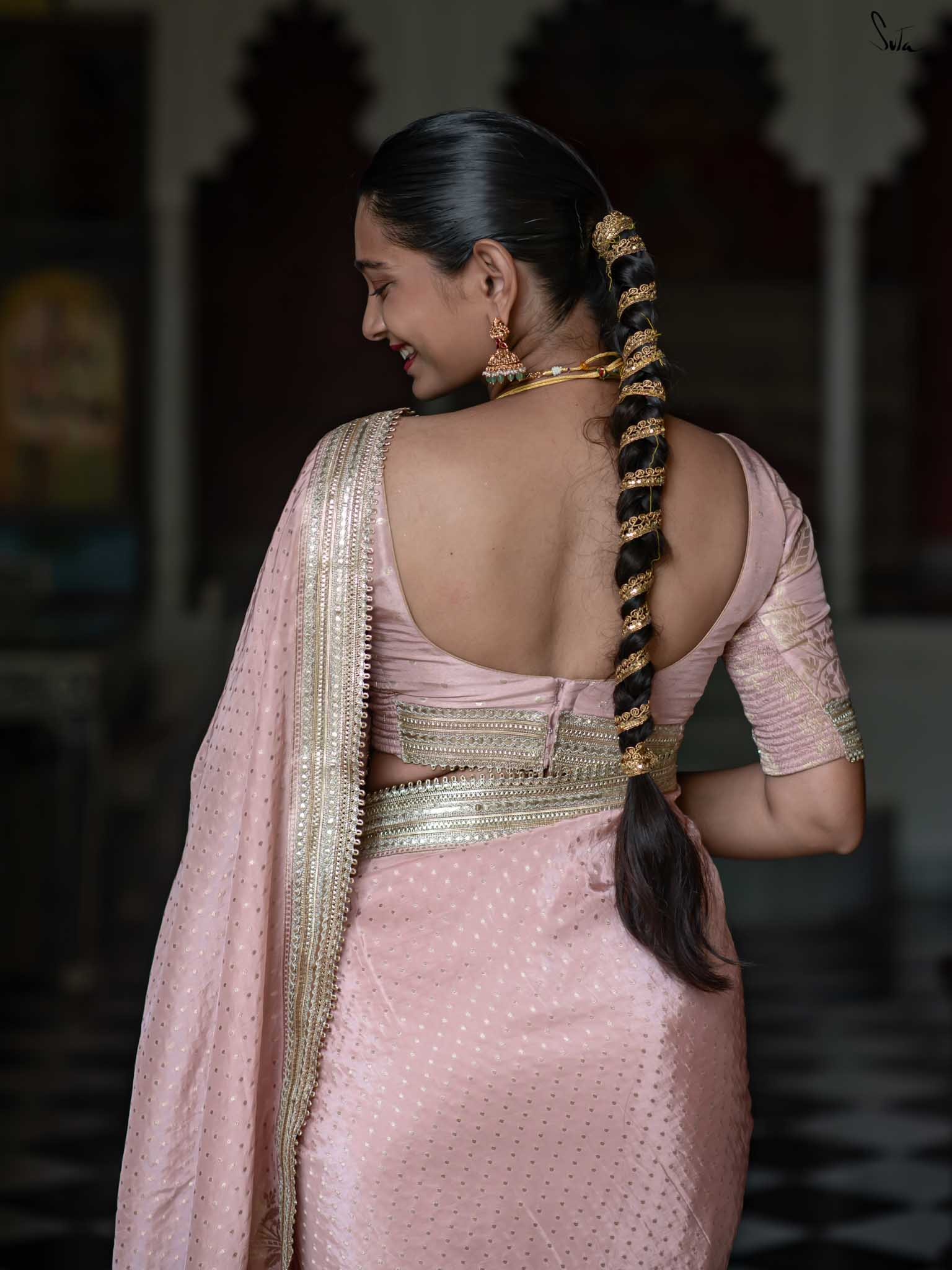 The model is wearing size S blouse and the saree is Sehra Hai