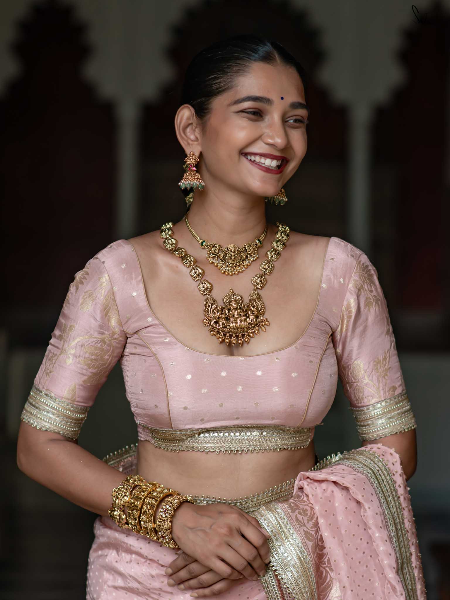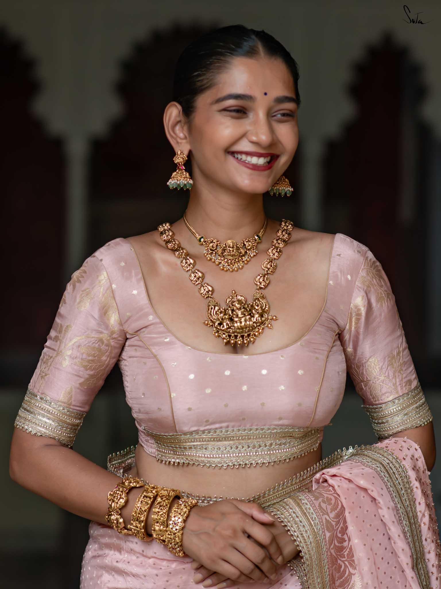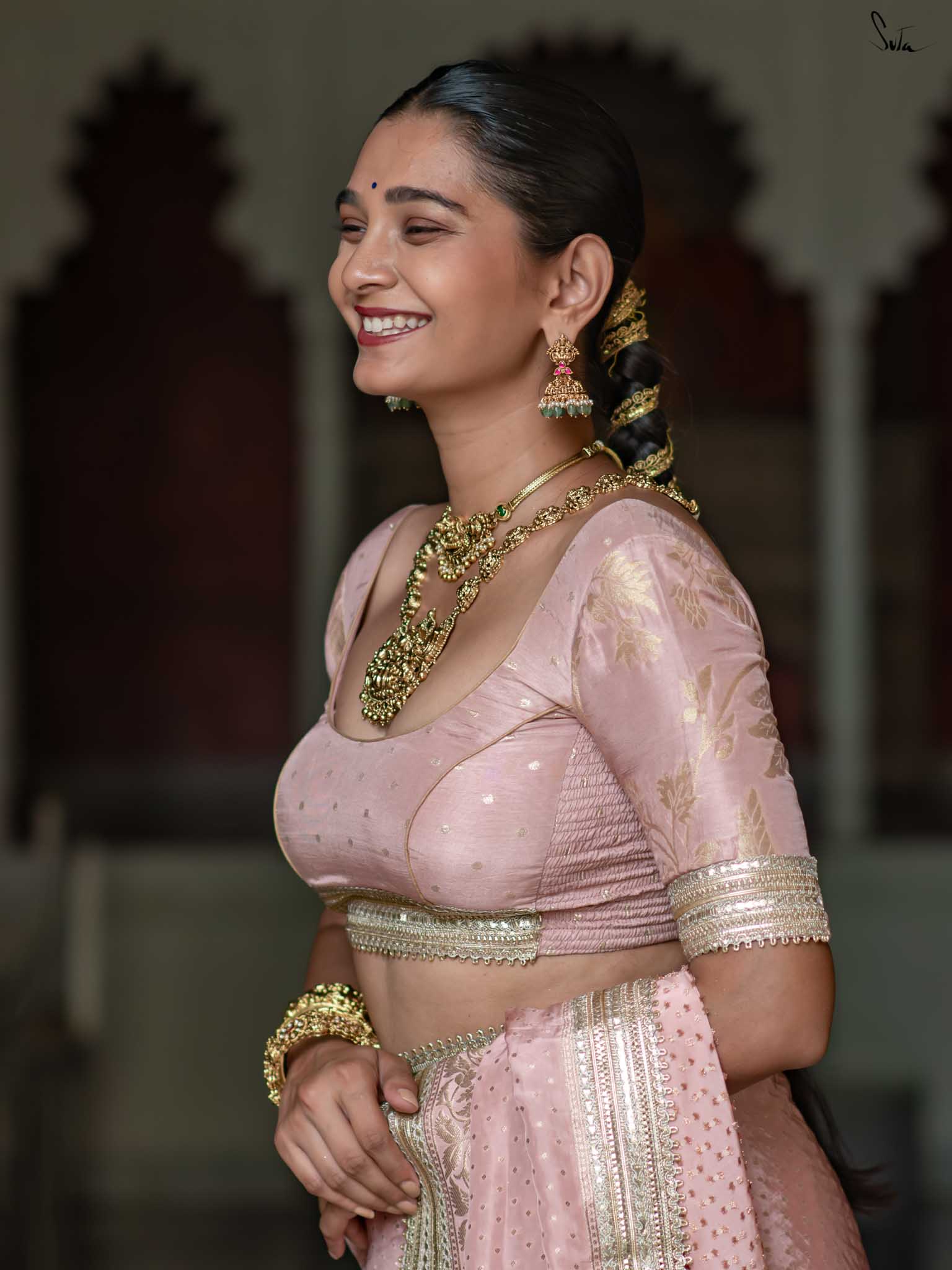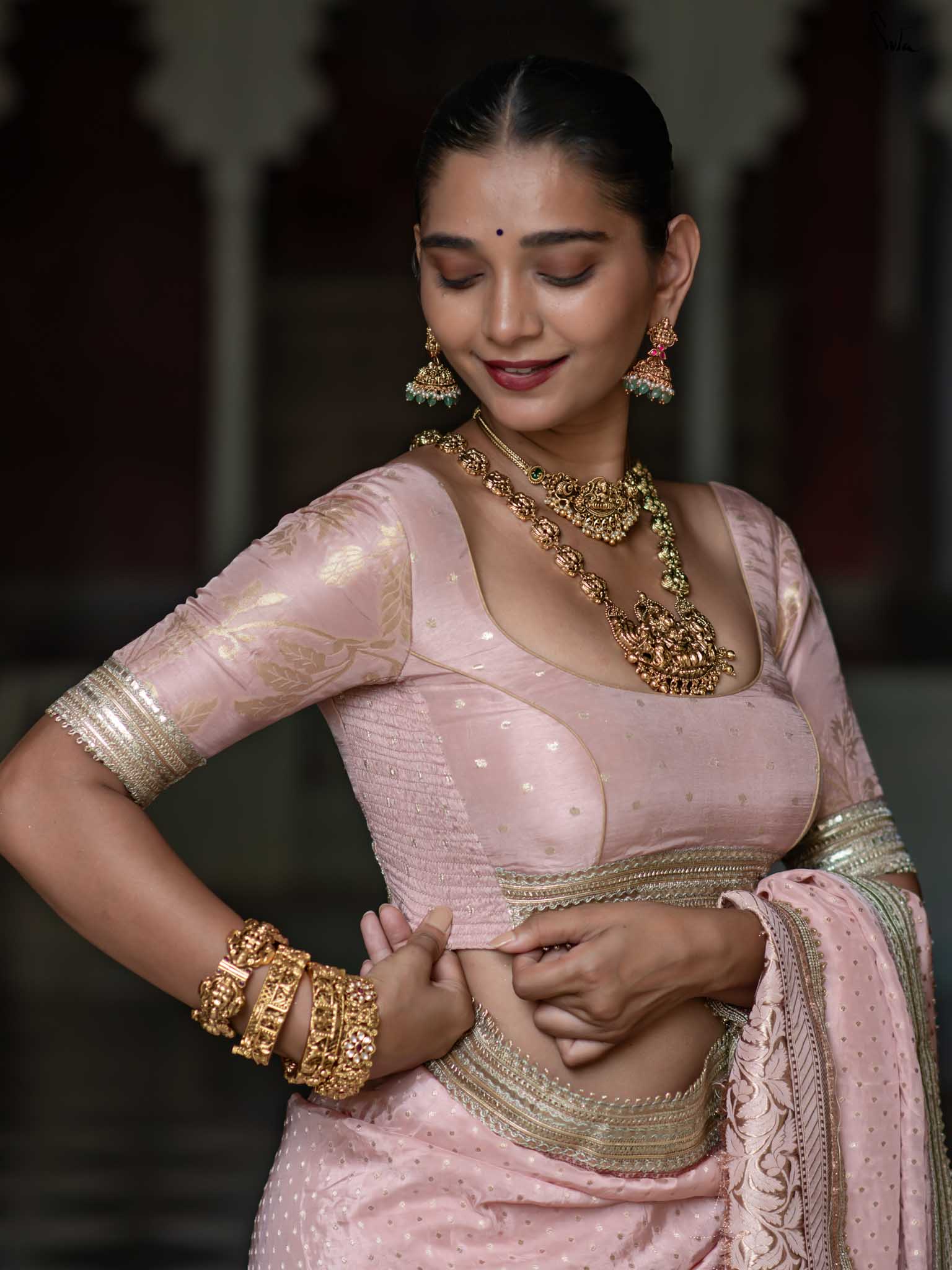 The model is wearing size S blouse and the saree is Sehra Hai