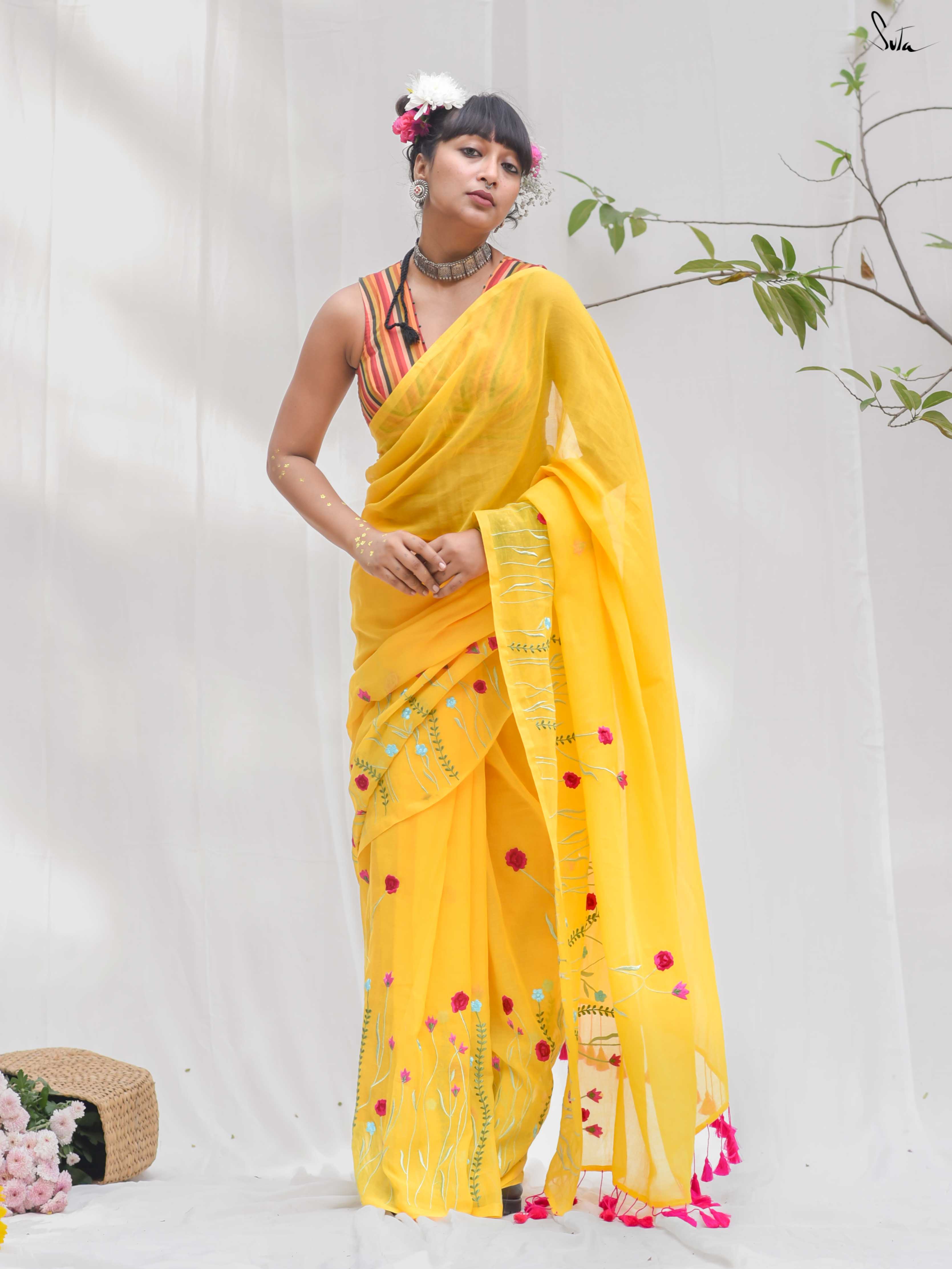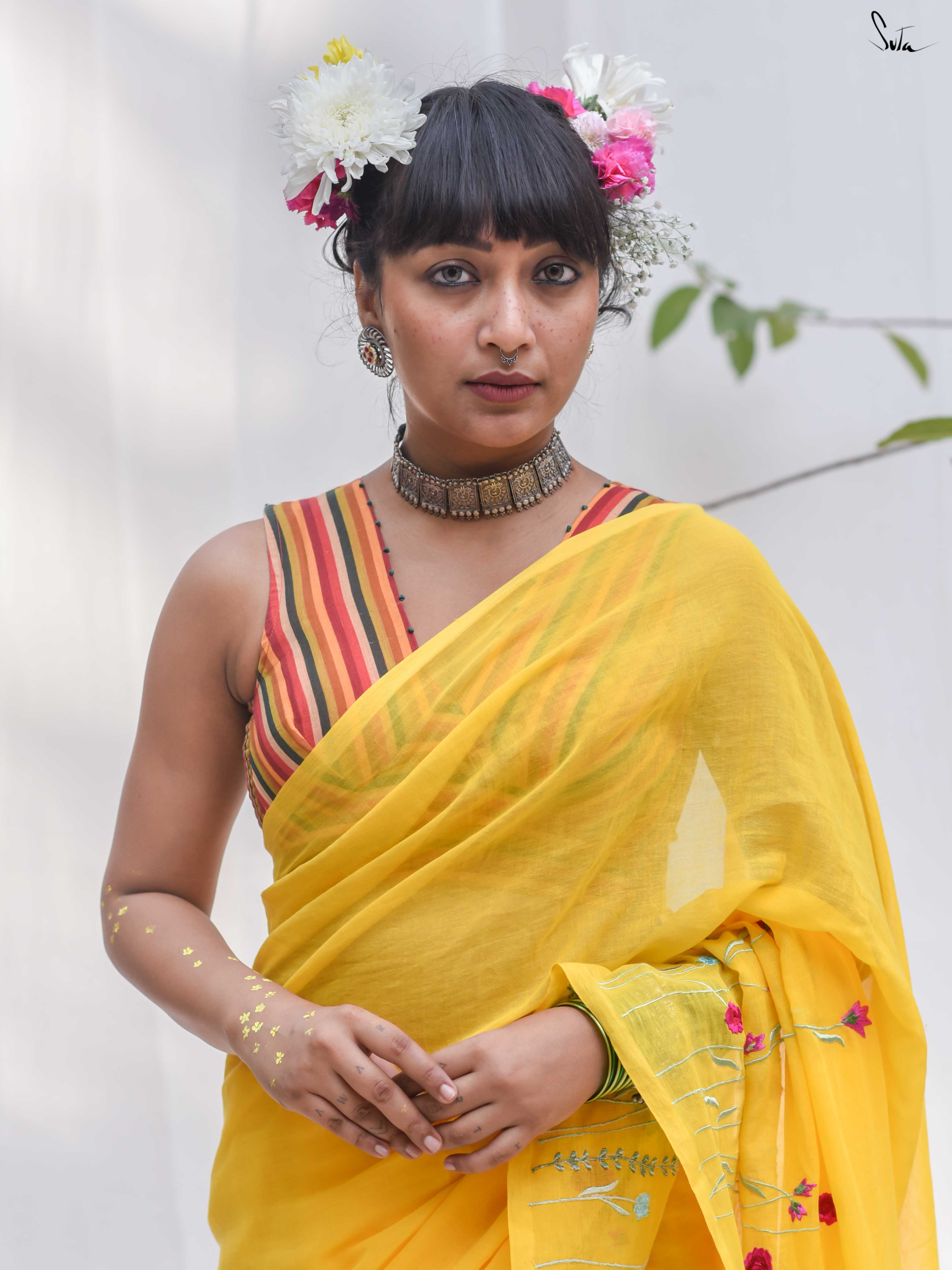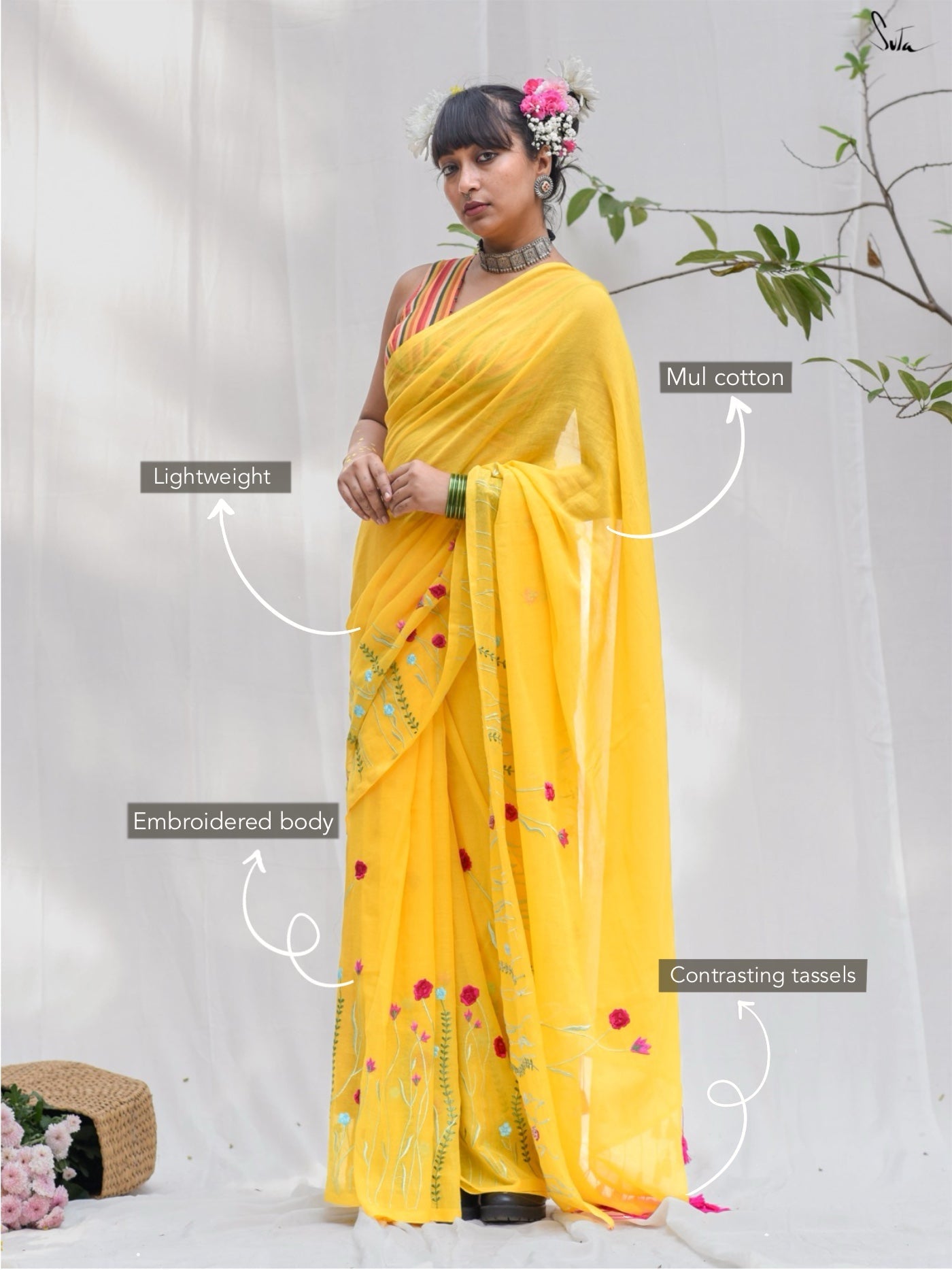 Soft, sunny, and full of gentle warmth, this saree captures the heart of Basant in its delicate embroidered florals. The mul cotton drape is feather-light and breathable, while the pink crochet lace adds a sweet pop of contrast, like spring flowers blooming against golden light.