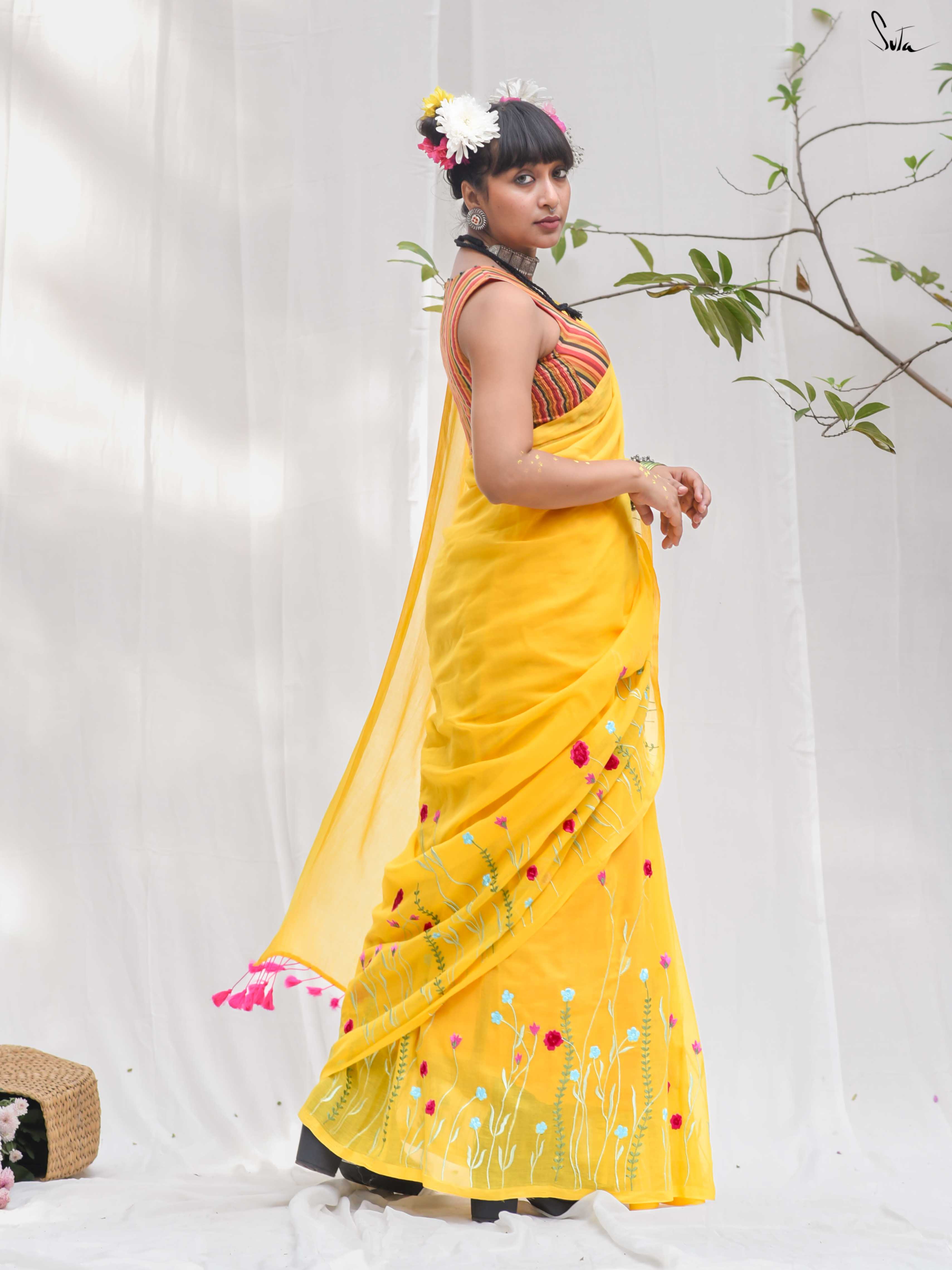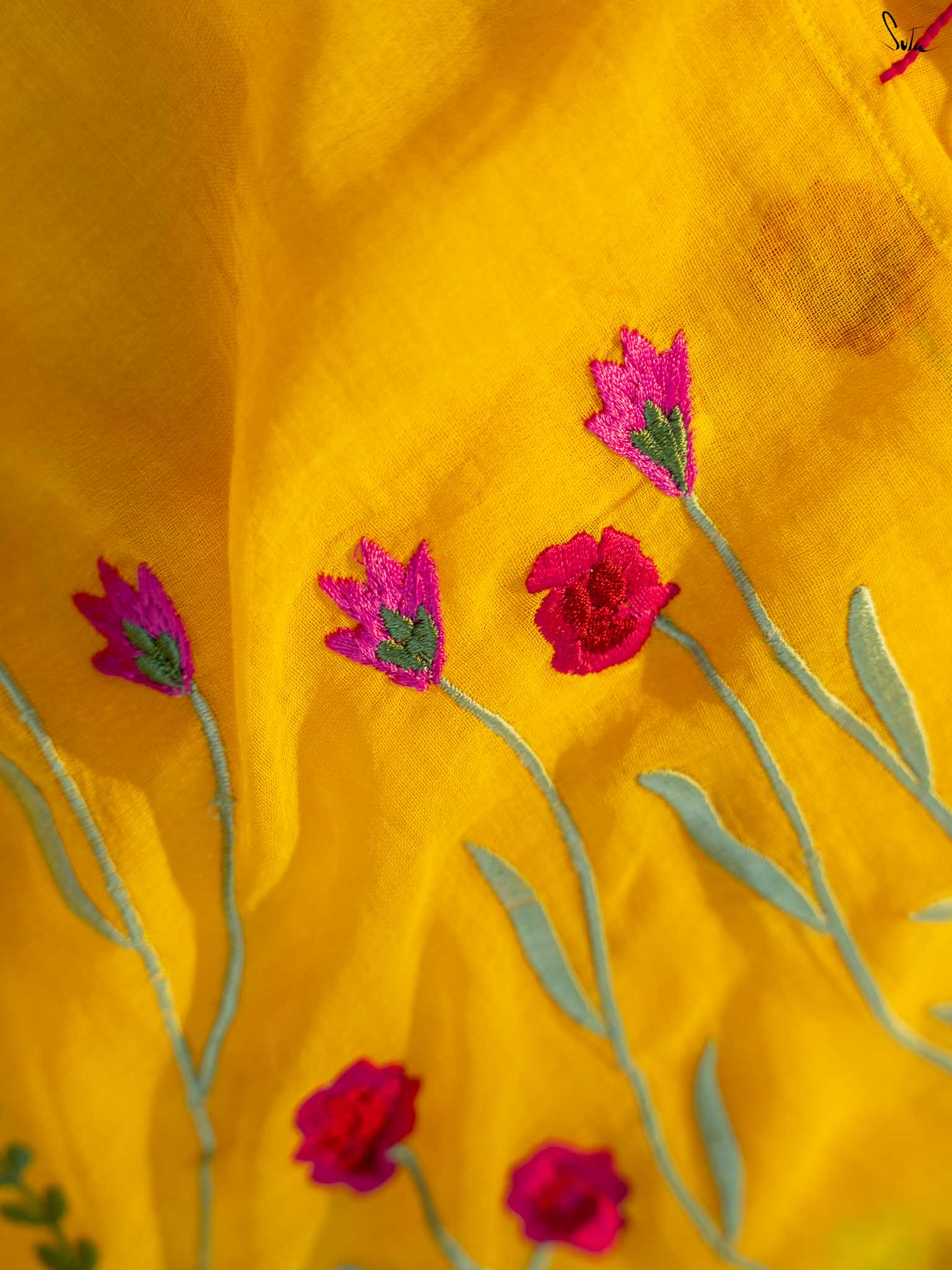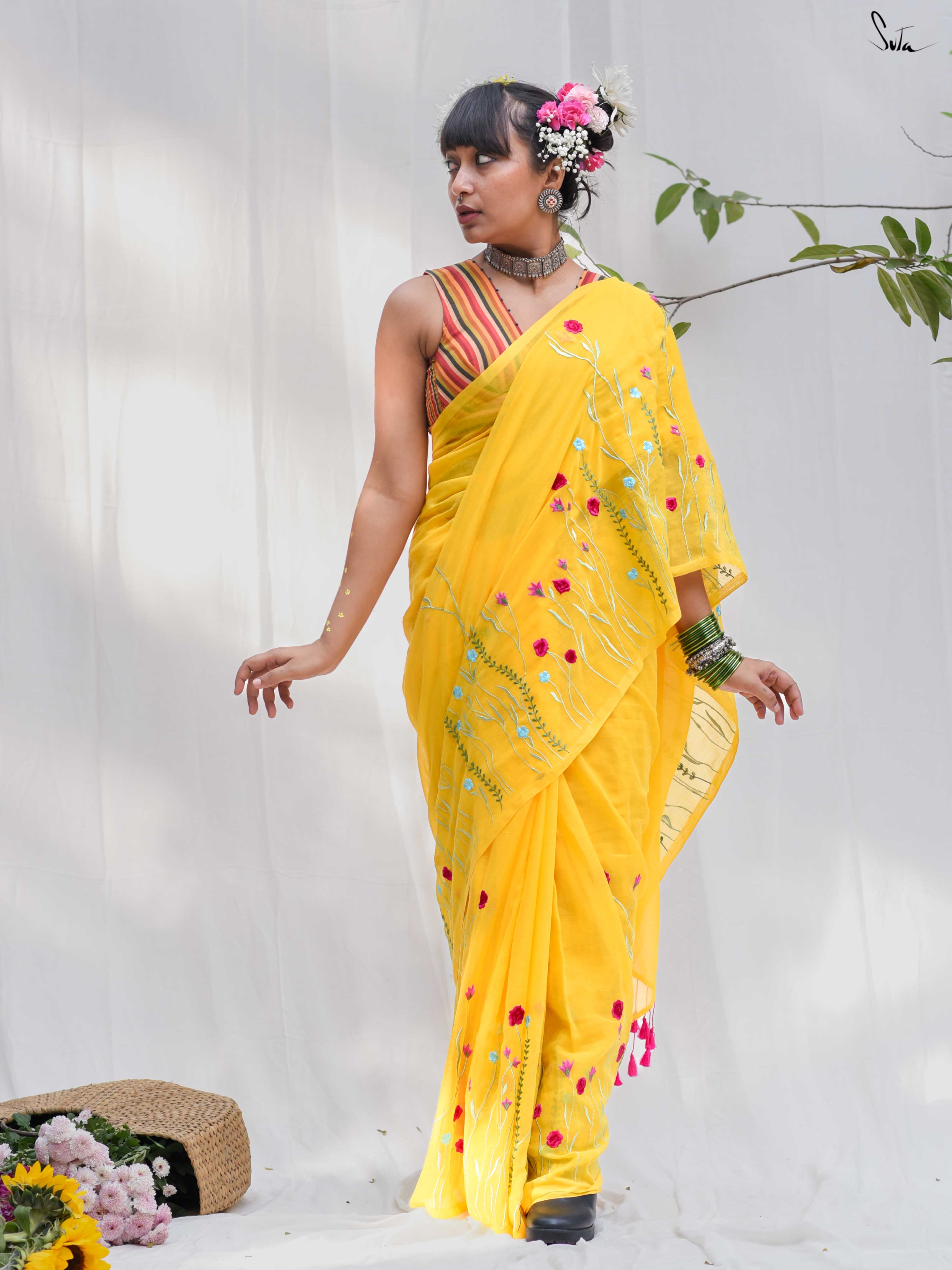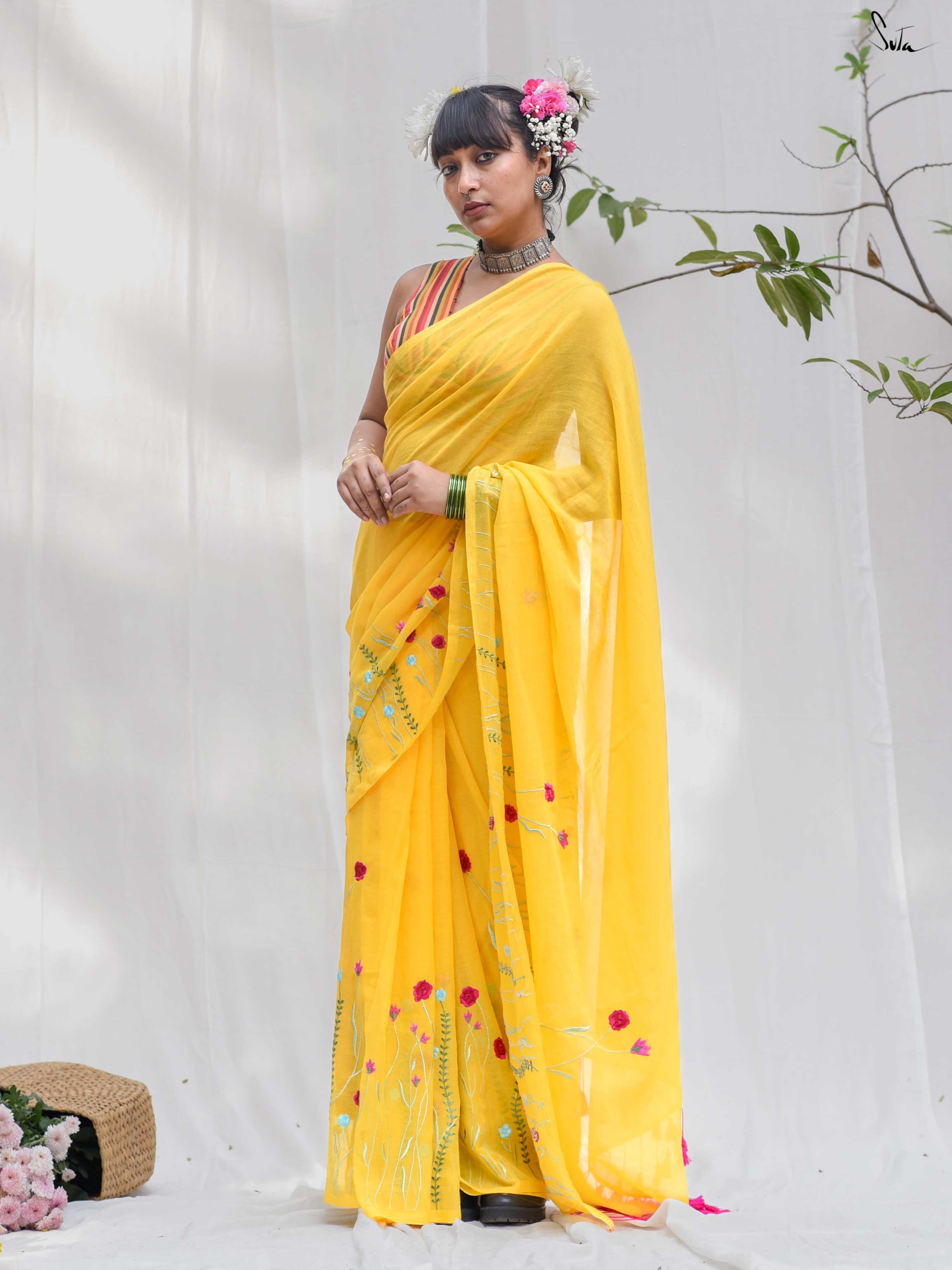 Soft, sunny, and full of gentle warmth, this saree captures the heart of Basant in its delicate embroidered florals. The mul cotton drape is feather-light and breathable, while the pink crochet lace adds a sweet pop of contrast, like spring flowers blooming against golden light.