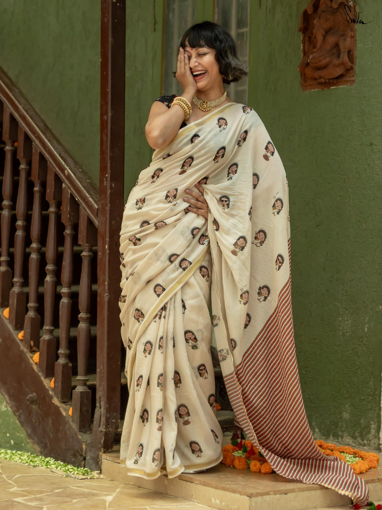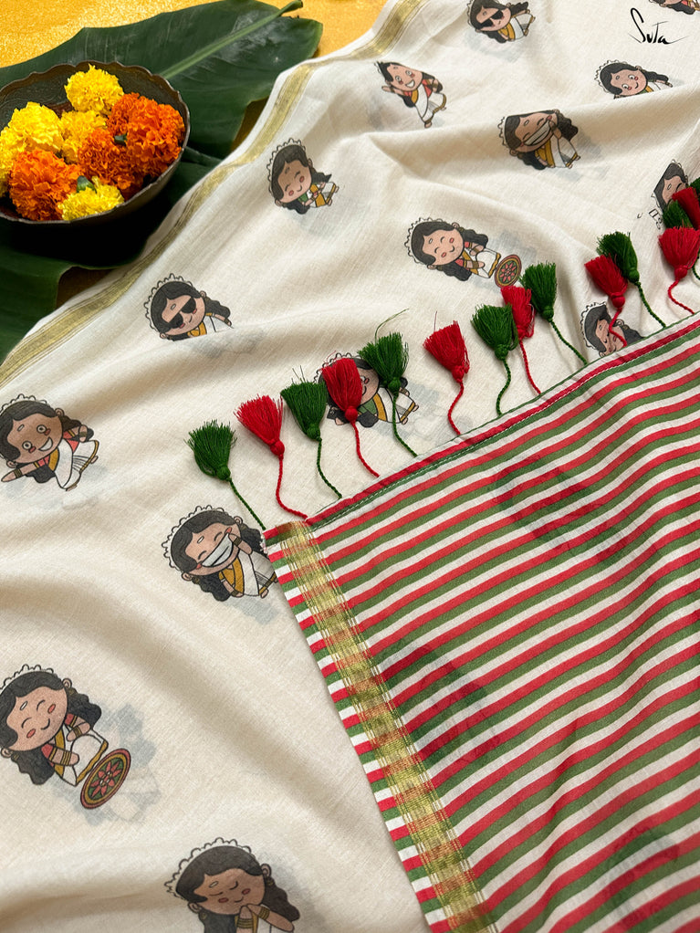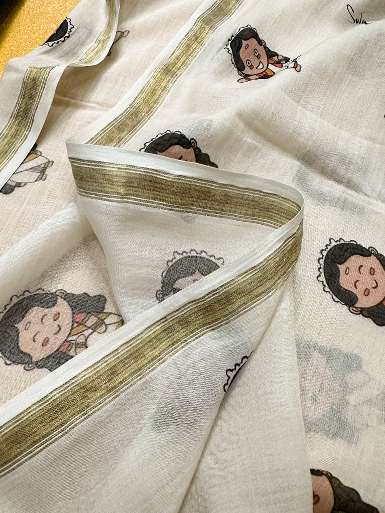 Off-white cotton viscose forms the base for a captivating print, showcasing illustrations of women engaged in various Onam festivities. The artwork brings the spirit of the harvest festival to life, while a classic gold zari border frames the design with a touch of elegance.
