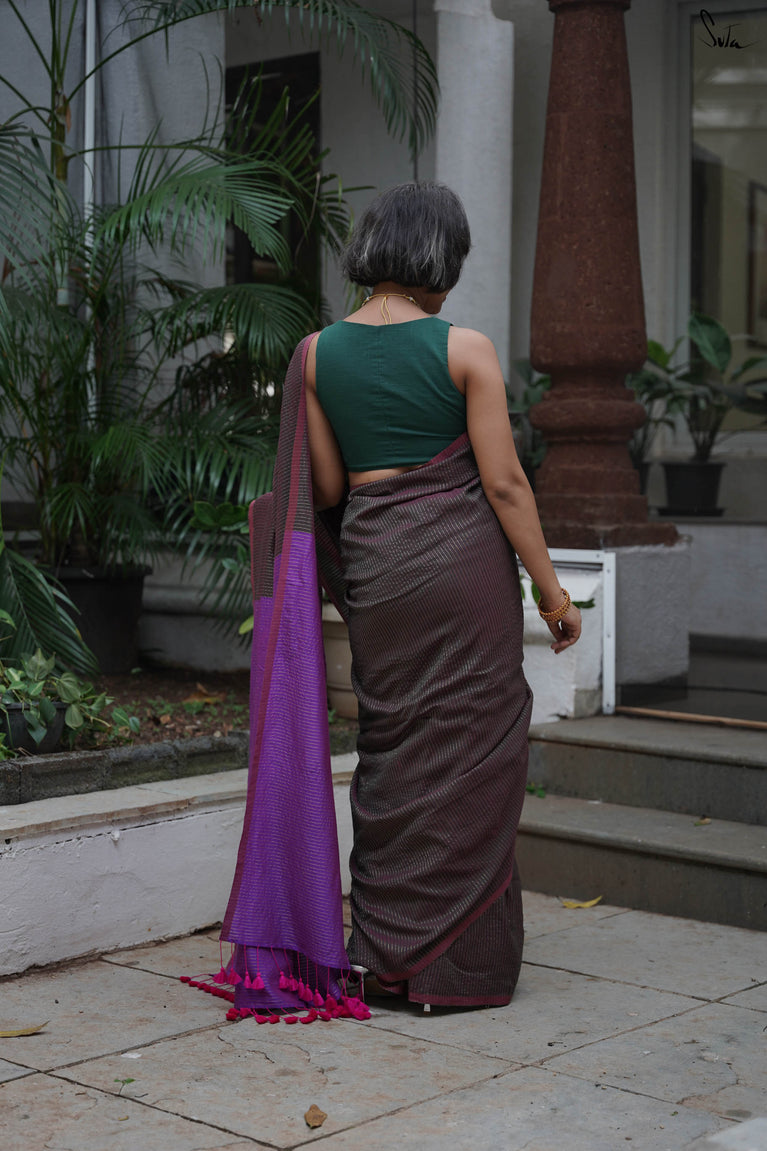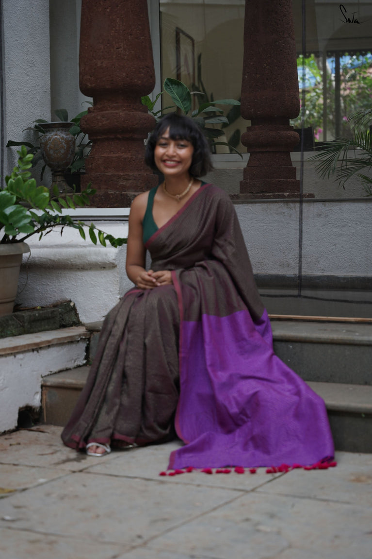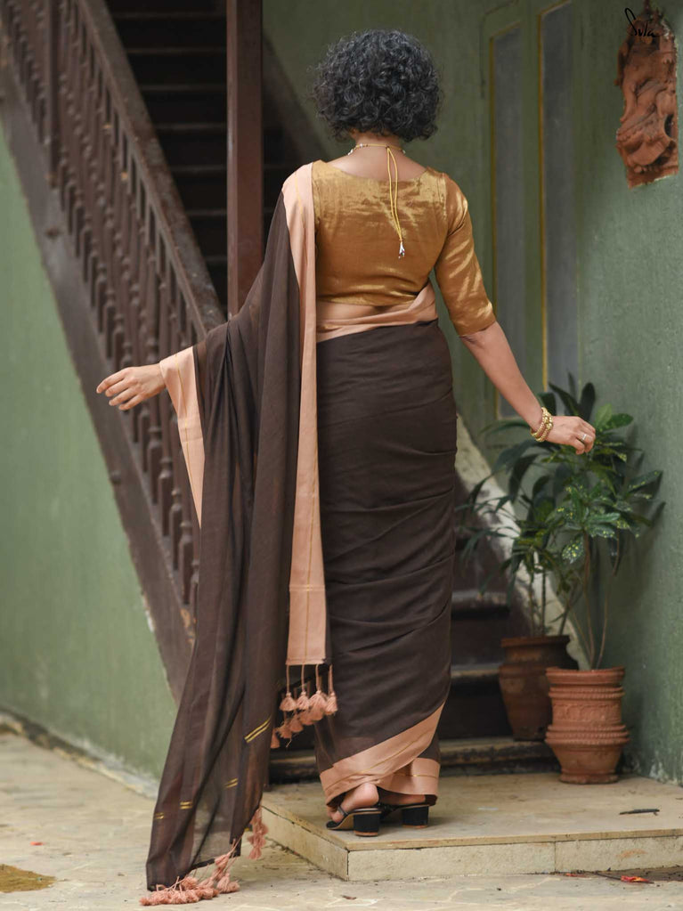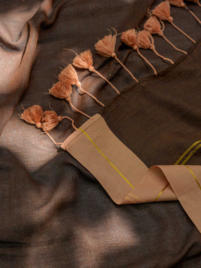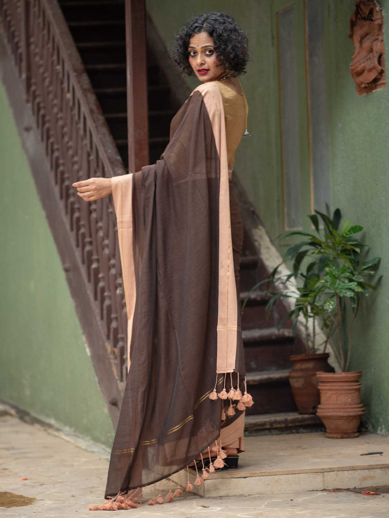 Earthy and comfortable, Dal Chini blends deep brown hues with a subtle zari border for a refined look. The beige jhalar tassels add softness to the rich woven mul cotton drape. A versatile choice for formal day events or understated festive occasions.