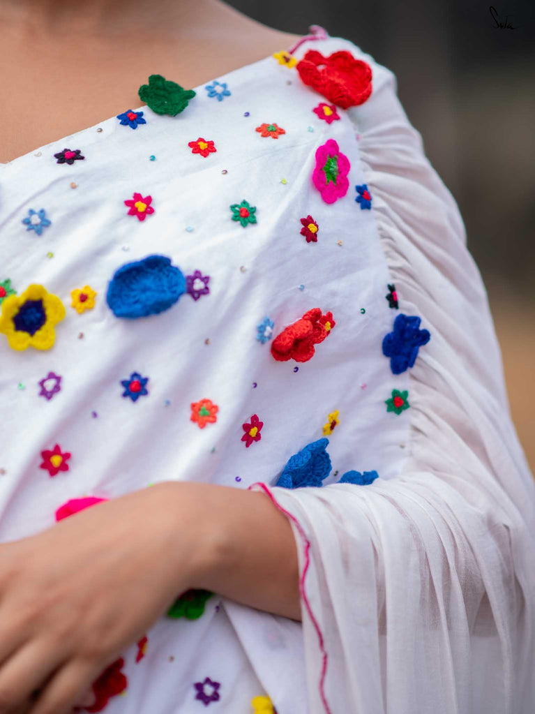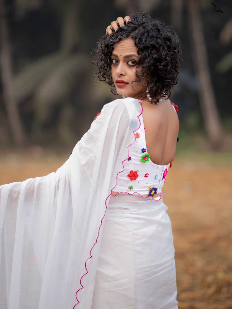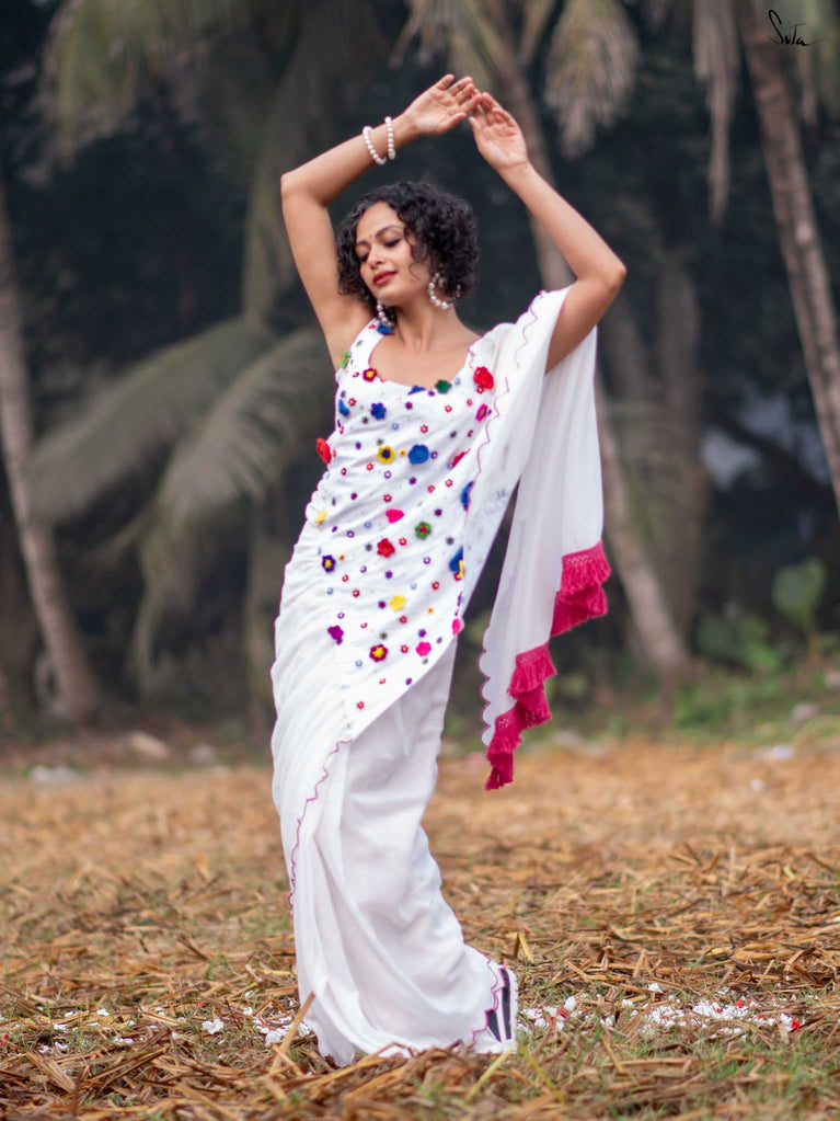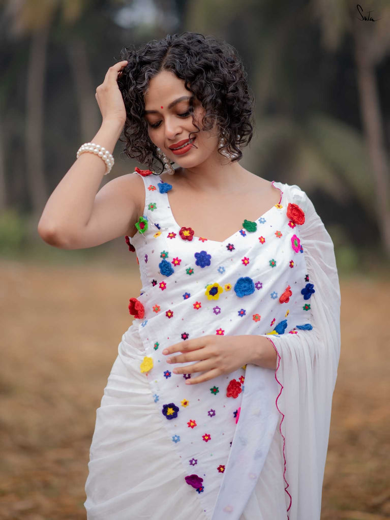 This saree is a canvas of joy, painted with a thousand colors of Holi. The white Mul Modal saree flows like a swirl of vibrant gulaal, carrying with it the spirit of celebration. Each fold is a splash of freedom hand-stitched in rich 3D multicolor crochet flowers and hand-embroidered sequin. The detailed scallop finish all-over twirls with the wind, while jhalar tassels add a hint of whimsy like the dance of colors in the air. Complement with a gathered pallu, it spreads a perfect festive joy and is bold enough to carry the spirit of every Holi reveler.