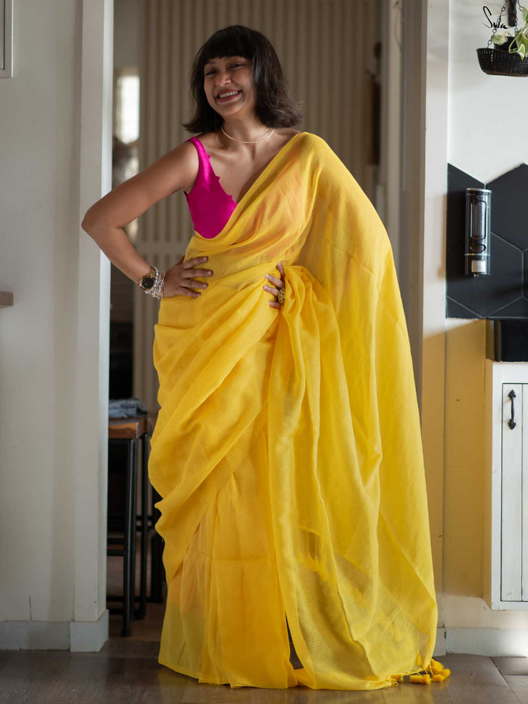 Bright and cheerful, this yellow mul cotton saree comes alive with its delicate zari stripes that catch and reflect light beautifully. The airy fabric is as comfortable as it is stylish, making it a great pick for celebrations or daytime events. Style it with a contrast Suta blouse and dainty earrings for an effortless yet striking appearance.