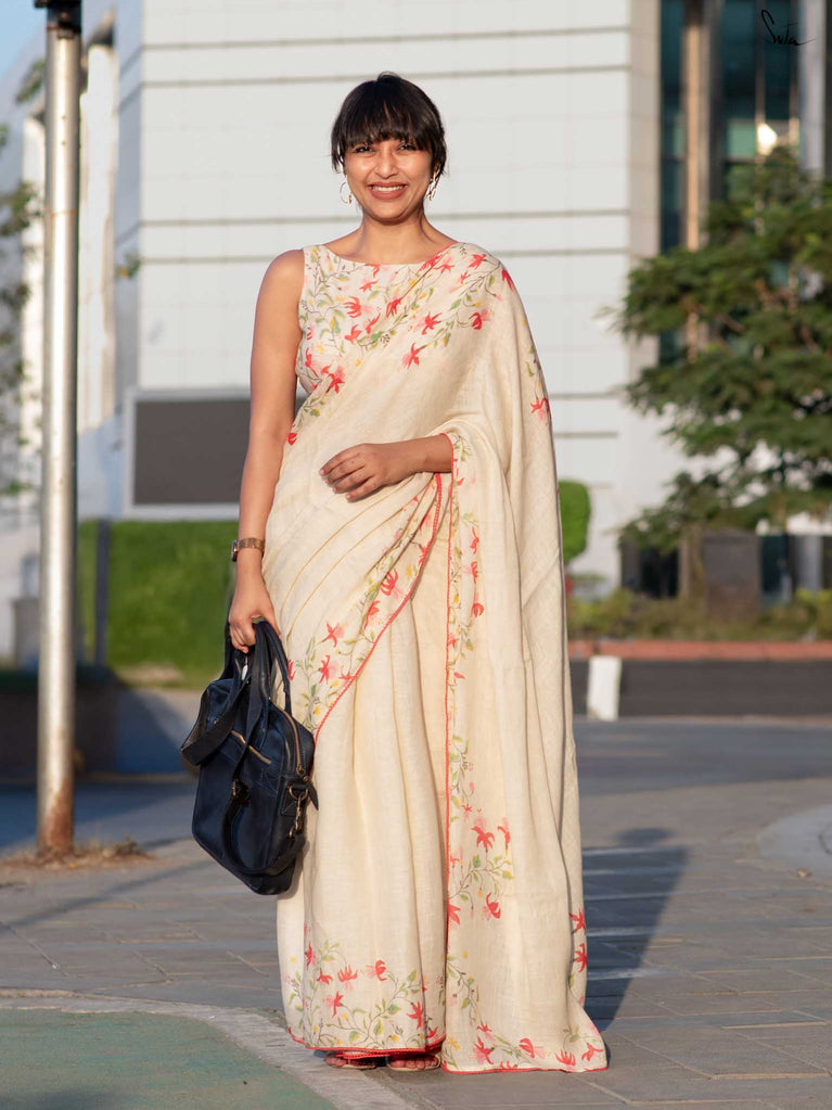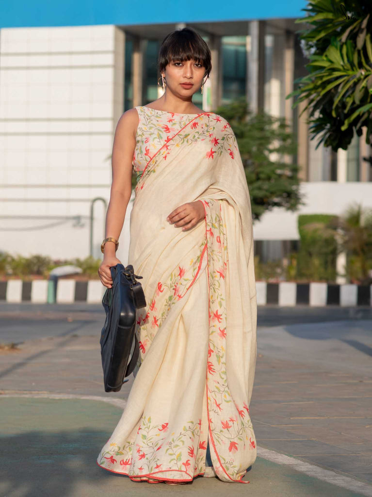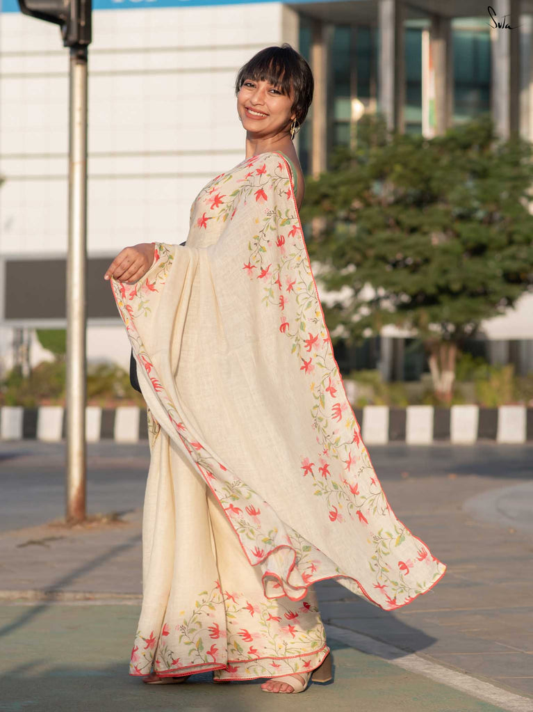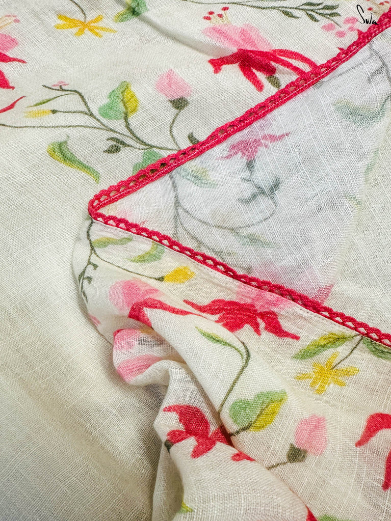 Unfold into grace with Fuchsia Fiza, a lovely off-white cotton linen saree that radiates warmth and beauty. The enchanting fuchsia border, paired with pink scalloped lace, evokes the gentle elegance of blooming flowers, making you feel as beautiful as you look. As you drape this stunning saree, its serene charm adds an aura of calm and refined elegance to your style. Pair it with the Phool blouse for a confident and effortlessly chic look that exudes sophistication.