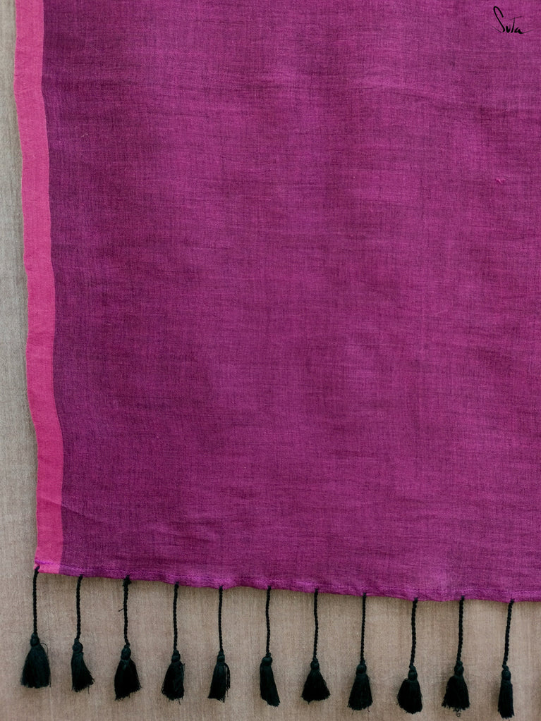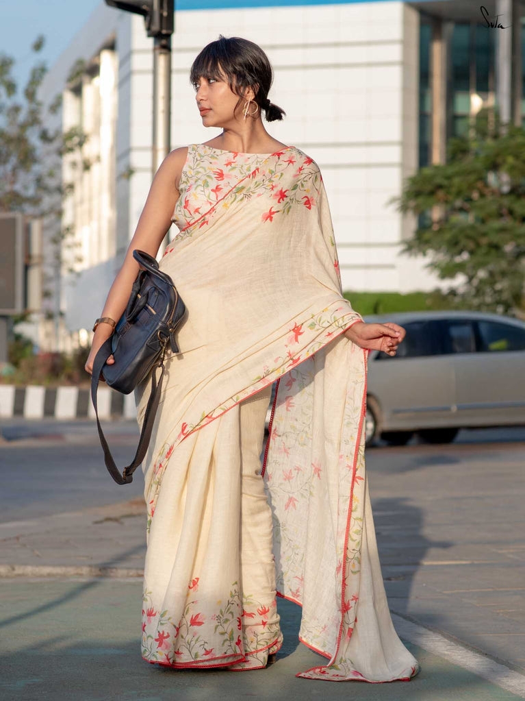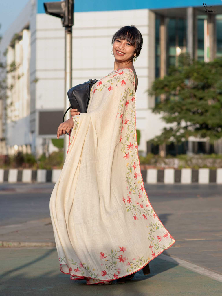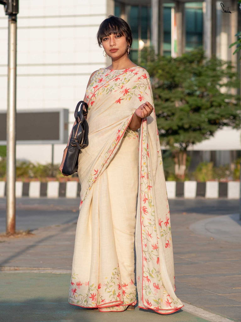 Unfold into grace with Fuchsia Fiza, a lovely off-white cotton linen saree that radiates warmth and beauty. The enchanting fuchsia border, paired with pink scalloped lace, evokes the gentle elegance of blooming flowers, making you feel as beautiful as you look. As you drape this stunning saree, its serene charm adds an aura of calm and refined elegance to your style. Pair it with the Phool blouse for a confident and effortlessly chic look that exudes sophistication.