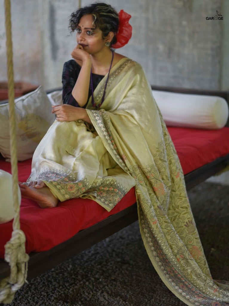 The word Betul translates into 'Maiden' and just like its name, the freshness of the saree describes nature's eternal bloom. A stunning work of art from the masterly artisans, who weave, stitch, and embroider magic with deep reverence and care, the saree reflects the harmonious relationship between art and nature. Wrap yourself in the radiant charm of nature with Betul, whose every fold whispers beauty!