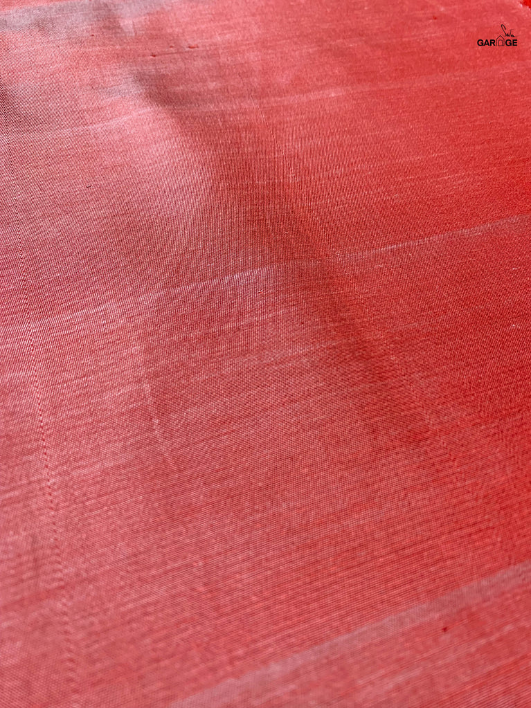 This saree has been handwoven by a master weaver in the Mashru tradition. The Mashru weave is said to have originated in West Asia, in the 19th Century. The fabric is woven with a silk weft and a fine cotton warp. It thus combines the ageless comfort of cotton and the timeless aesthetic of silk, elevated by the presence of gold and silver zari.