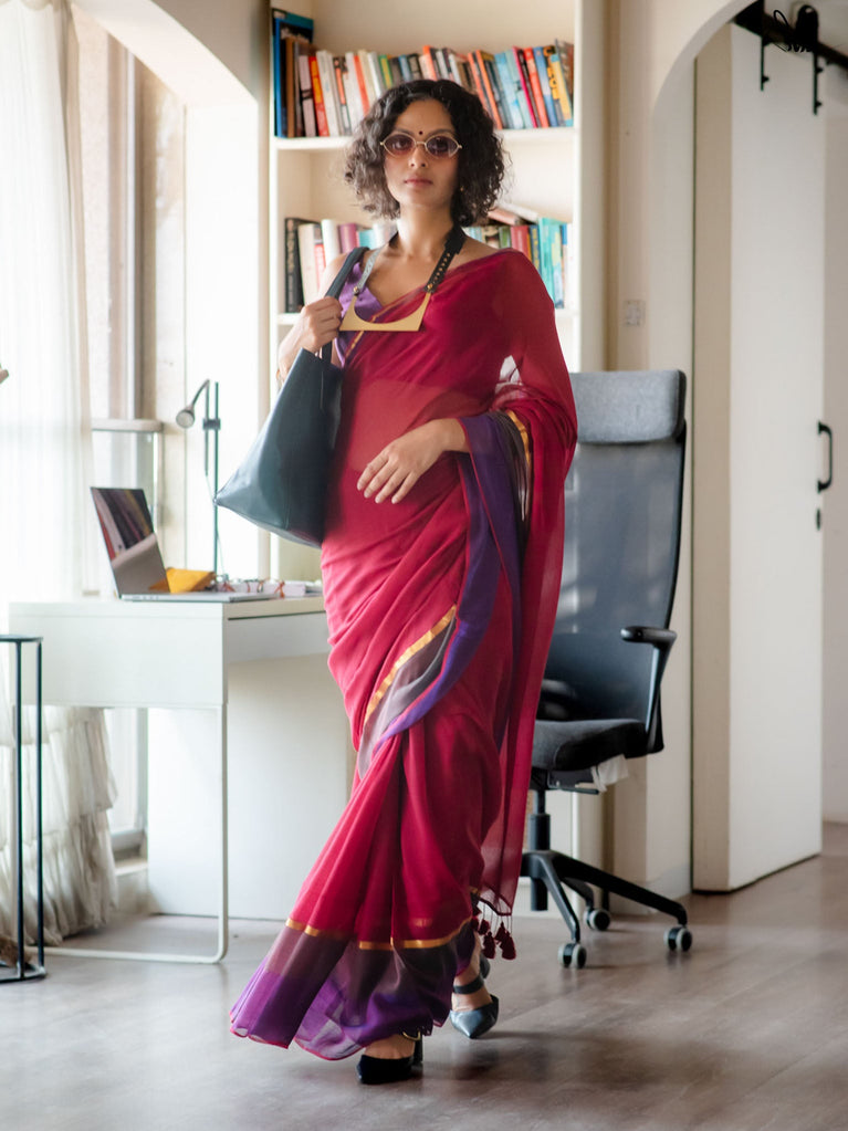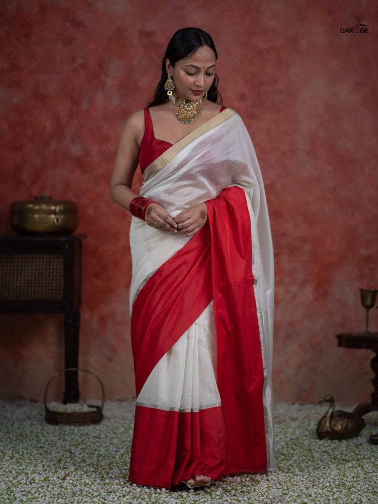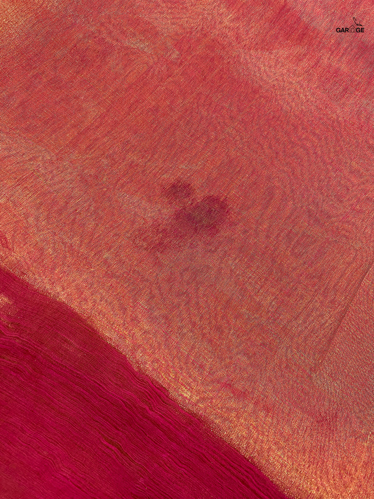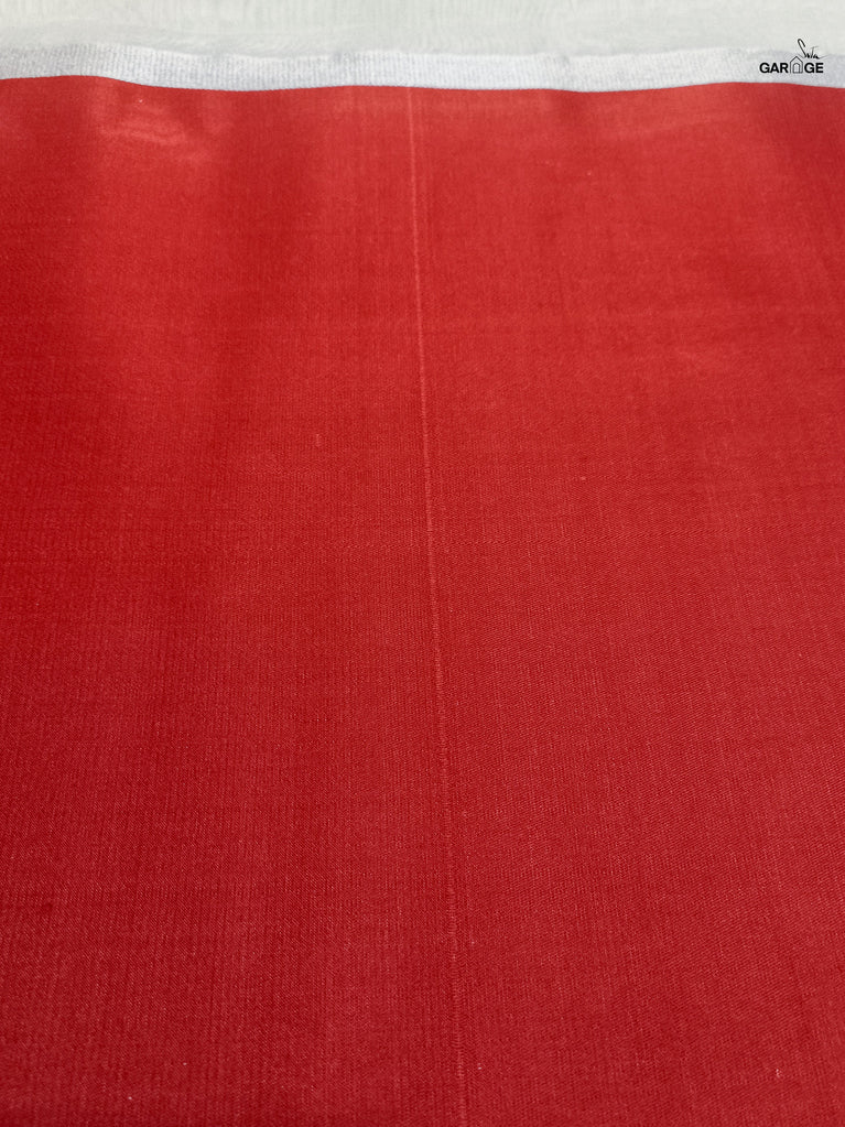 Silk is a natural fibre produced by the cocoons of silkworms. The shimmering appearance of silk is attributed to the prism-like structure of its fibres. While being smooth and soft, pure silk is also extremely durable and not slippery. Pure silk has been used in this rich red saree, to create a piece that is truly special and memorable.