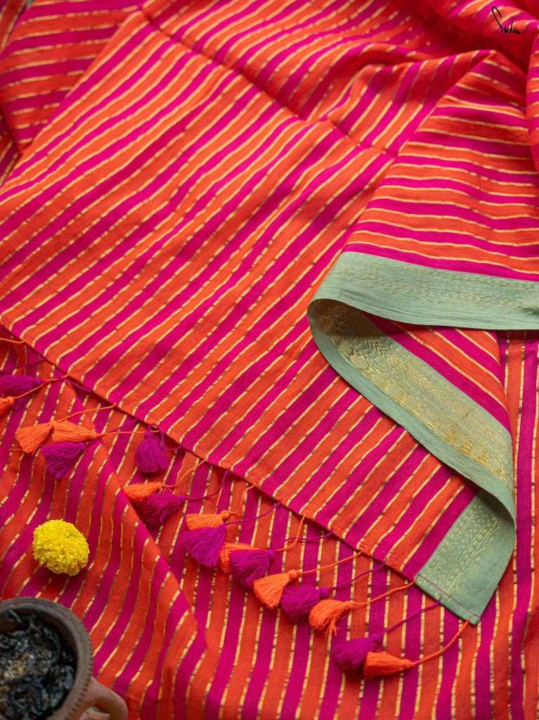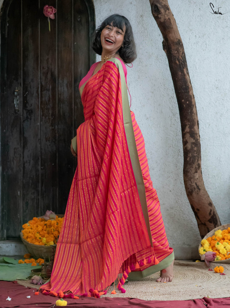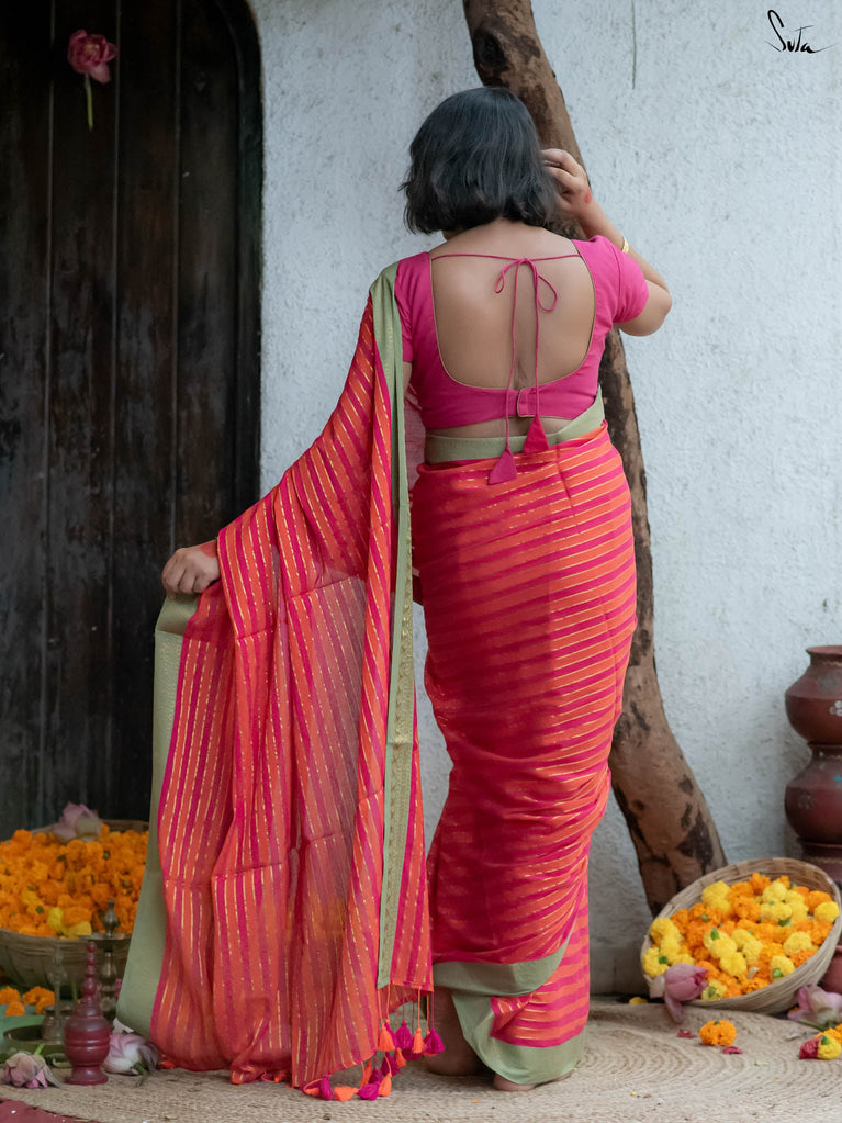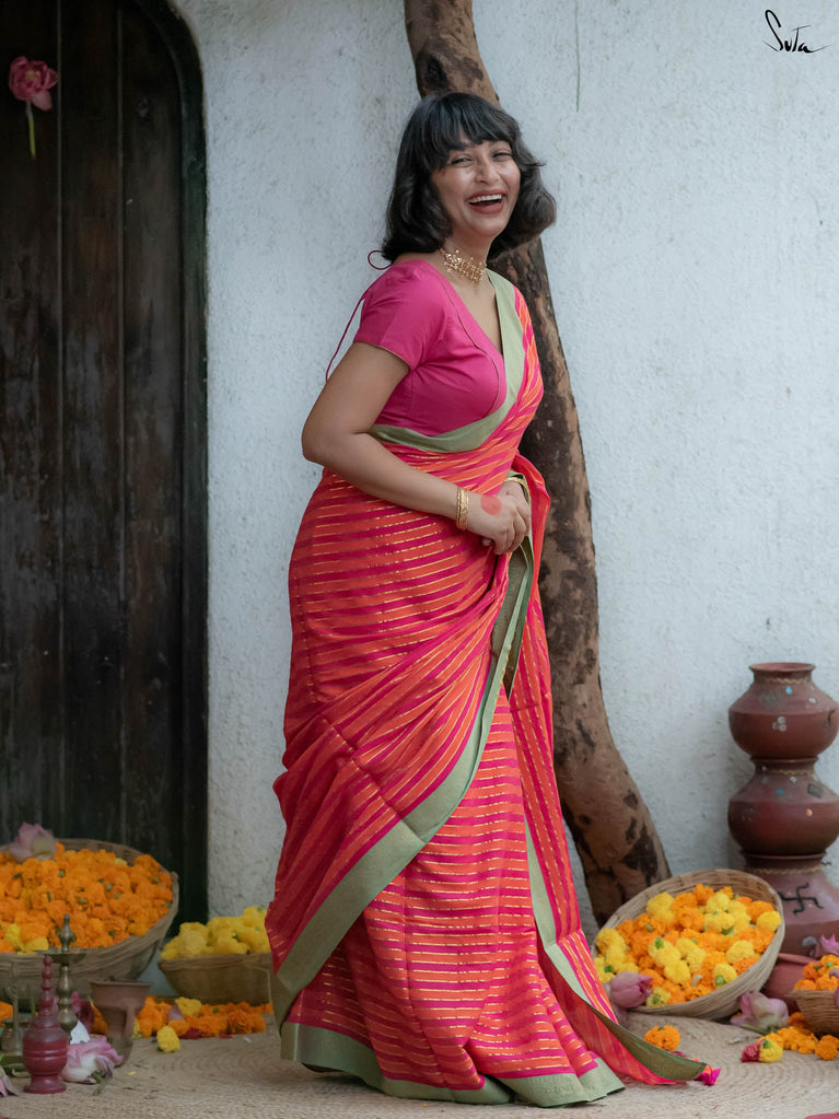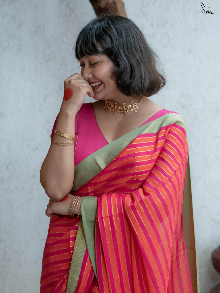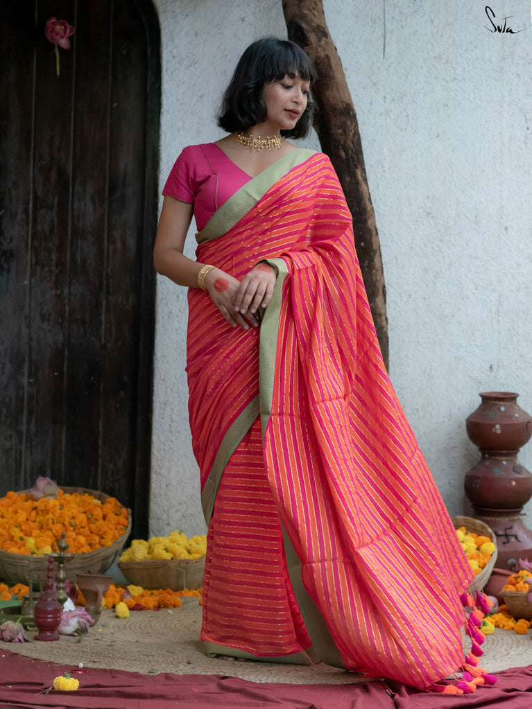 A pink and orange striped cotton saree that radiates warmth and playfulness, finished with a contrast green jacquard border that makes the whole piece pop. What makes it precious is its easy versatility — light enough for everyday wear yet striking enough to turn heads on festive mornings. It’s that saree you’ll keep reaching for when you want effortless charm with a dash of boldness.
