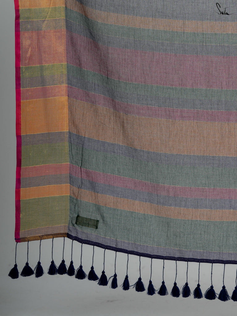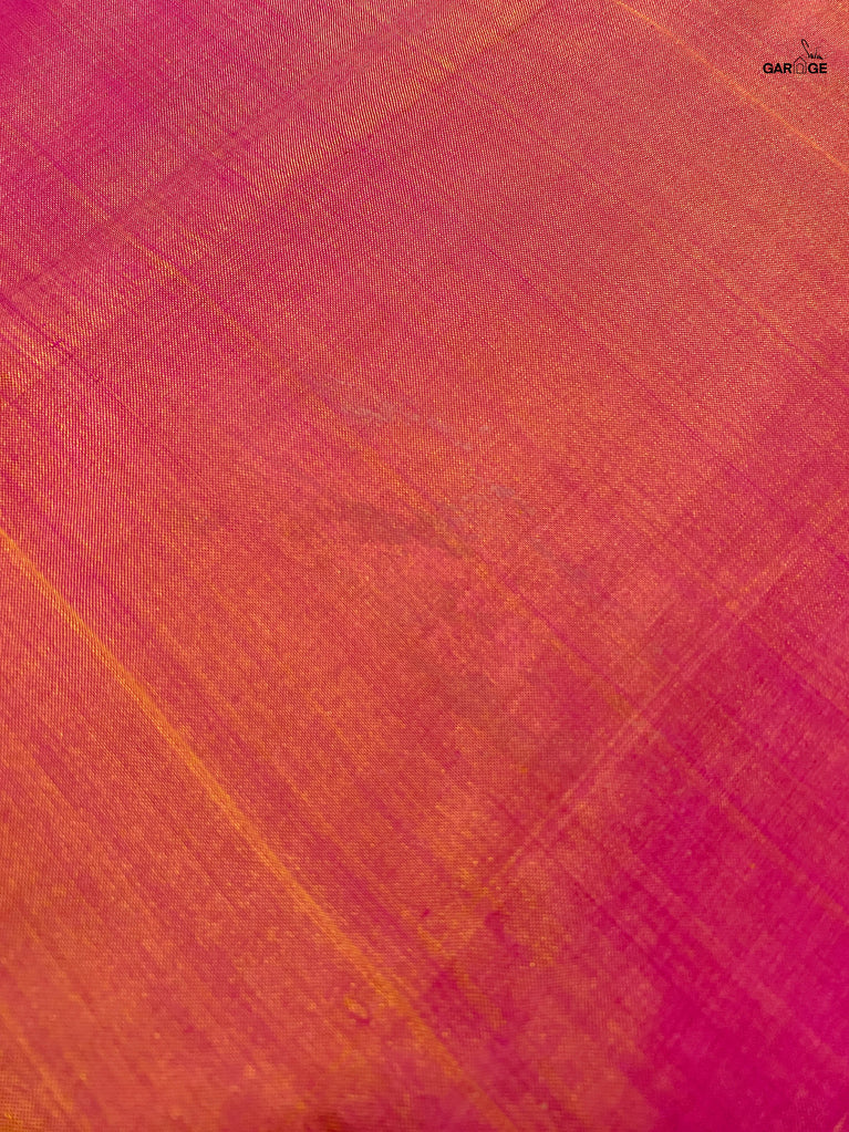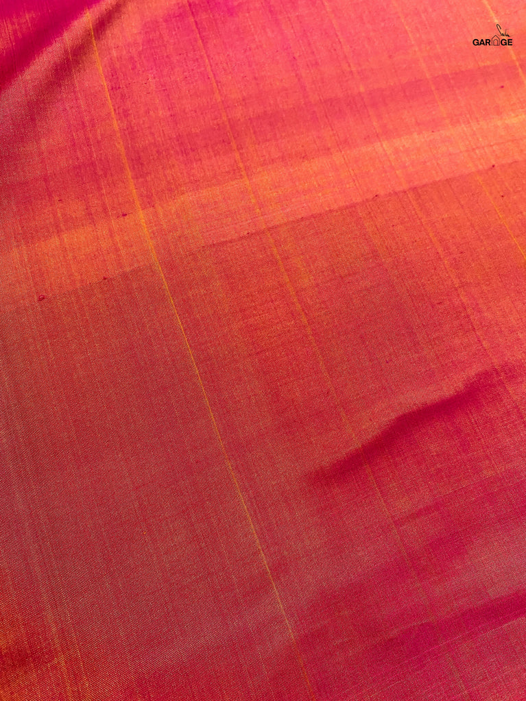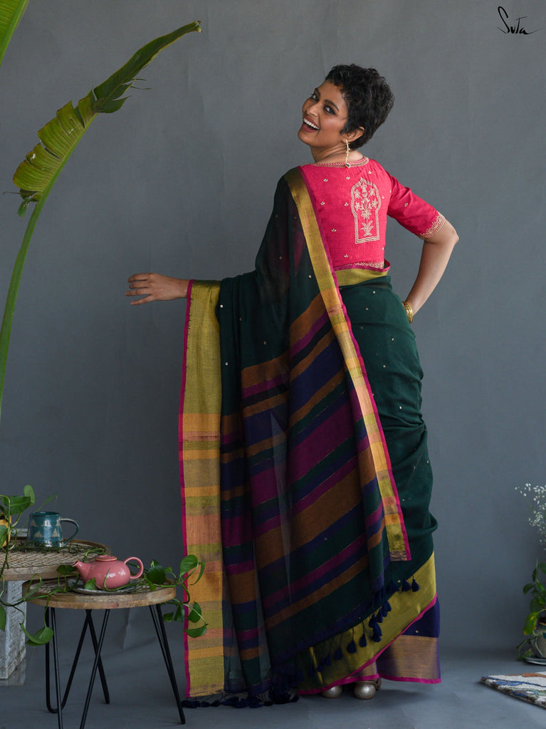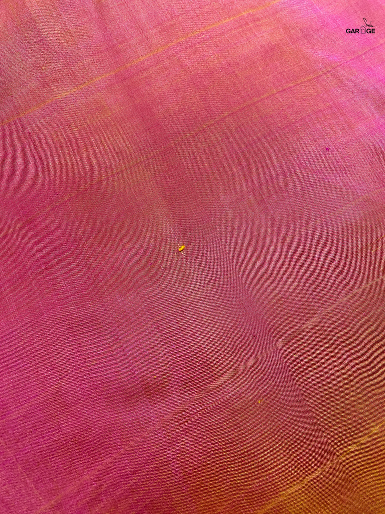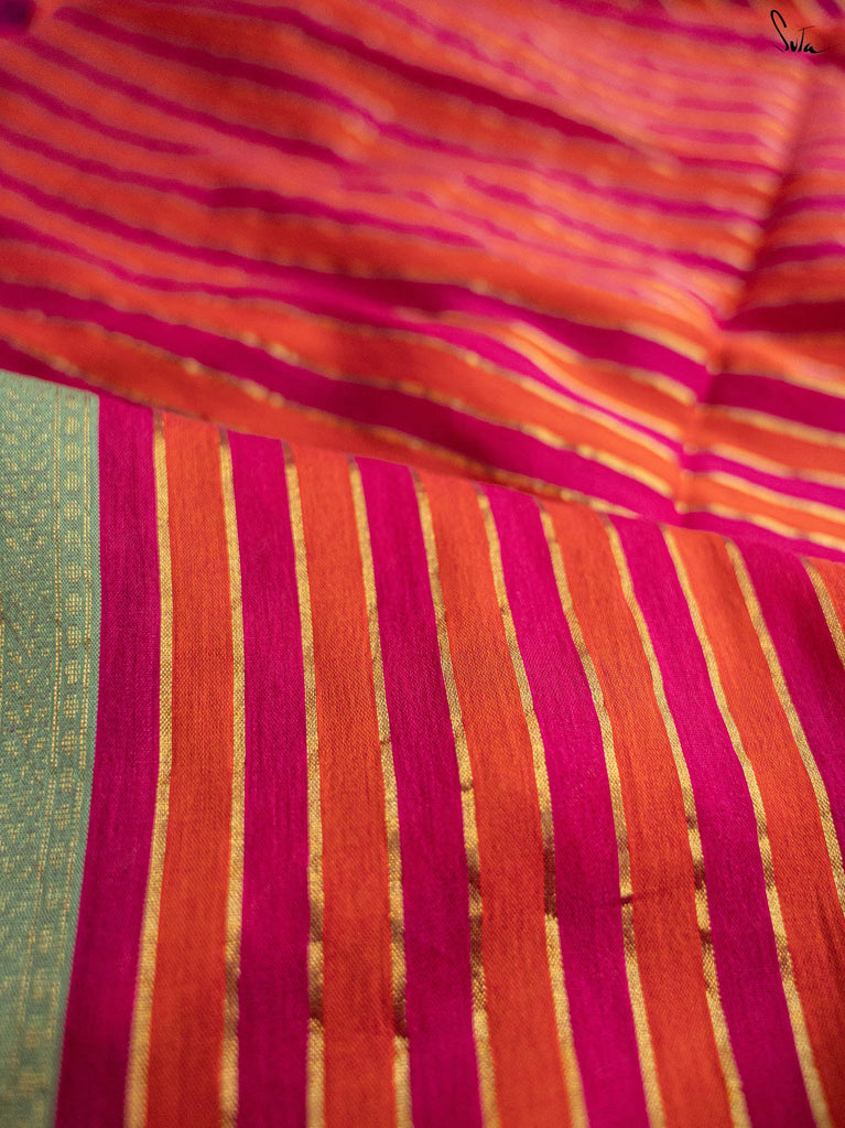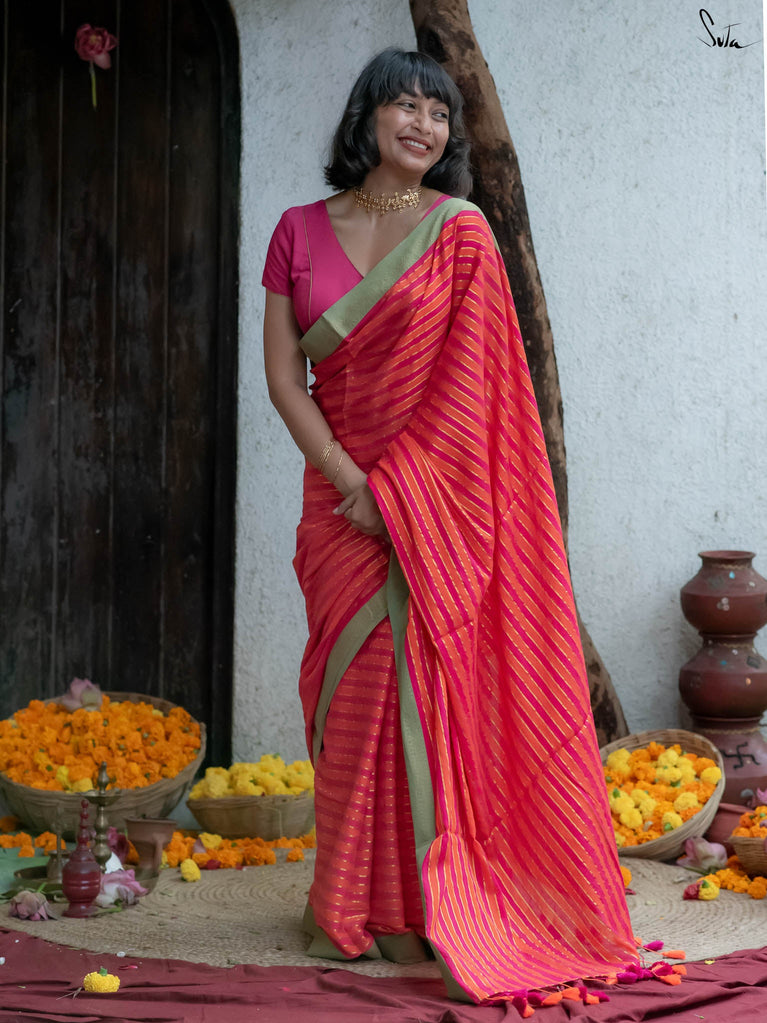 A pink and orange striped cotton saree that radiates warmth and playfulness, finished with a contrast green jacquard border that makes the whole piece pop. What makes it precious is its easy versatility — light enough for everyday wear yet striking enough to turn heads on festive mornings. It’s that saree you’ll keep reaching for when you want effortless charm with a dash of boldness.