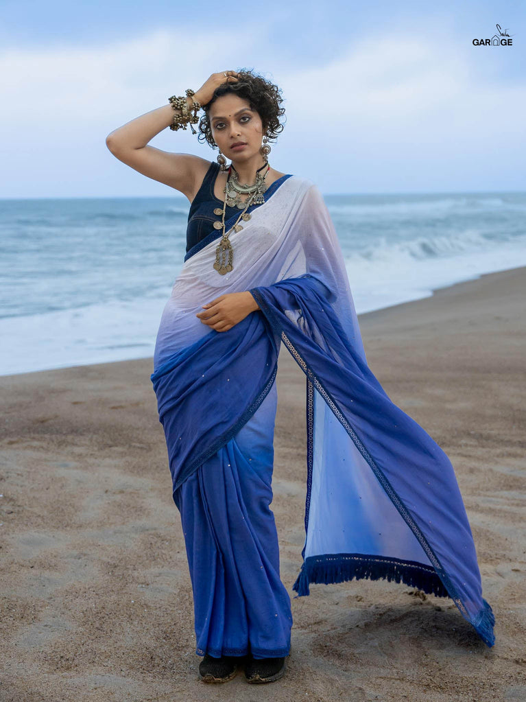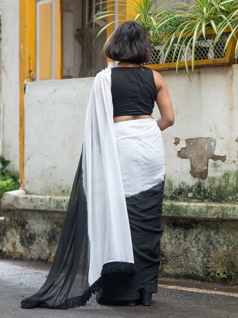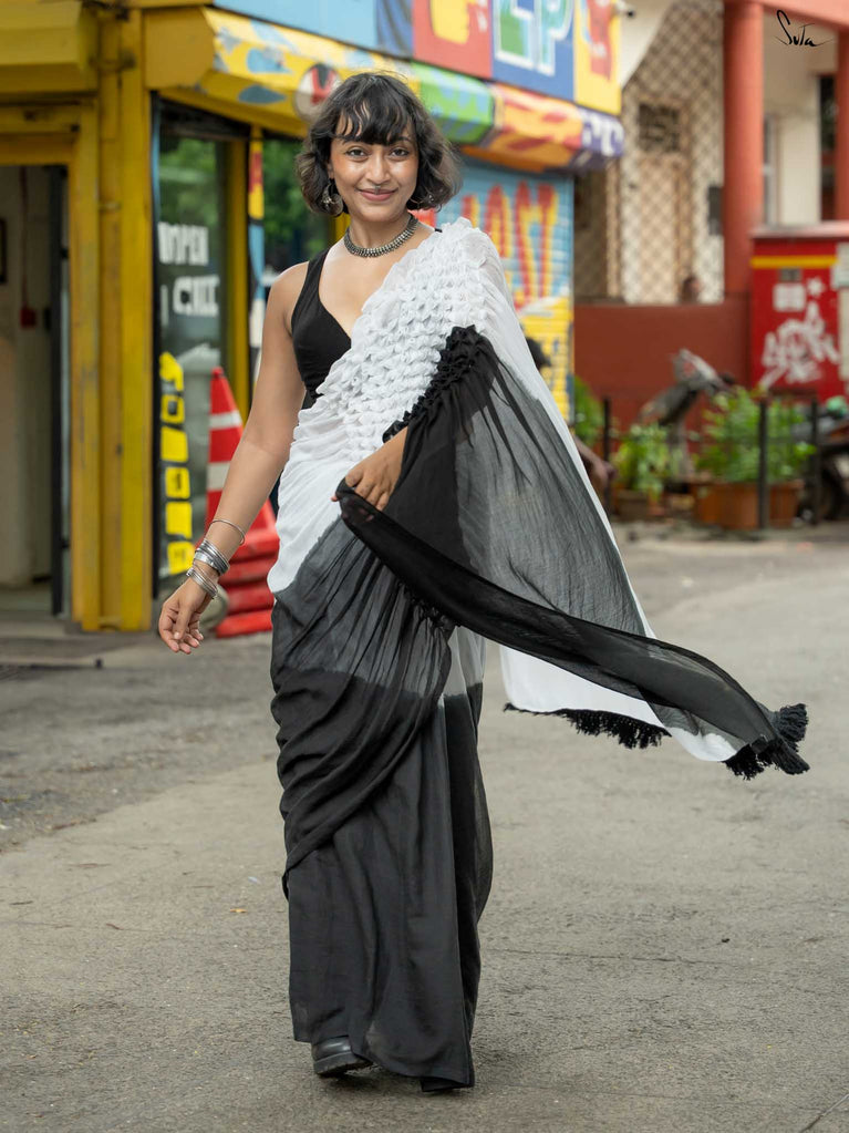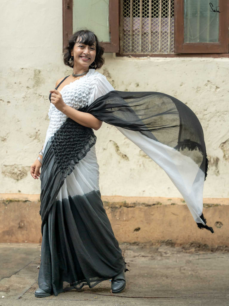 Classic yet full of contrast, this black and white ombre mul cotton saree is elegance reimagined. The tie-dye shifts from inky depth to soft ivory, echoing shadows melting into light. Shadow-toned smocking adds dimension, while monochrome tassels lend it a crisp finish. It’s a saree that speaks in silences and stands out in a crowd with quiet power in every thread.