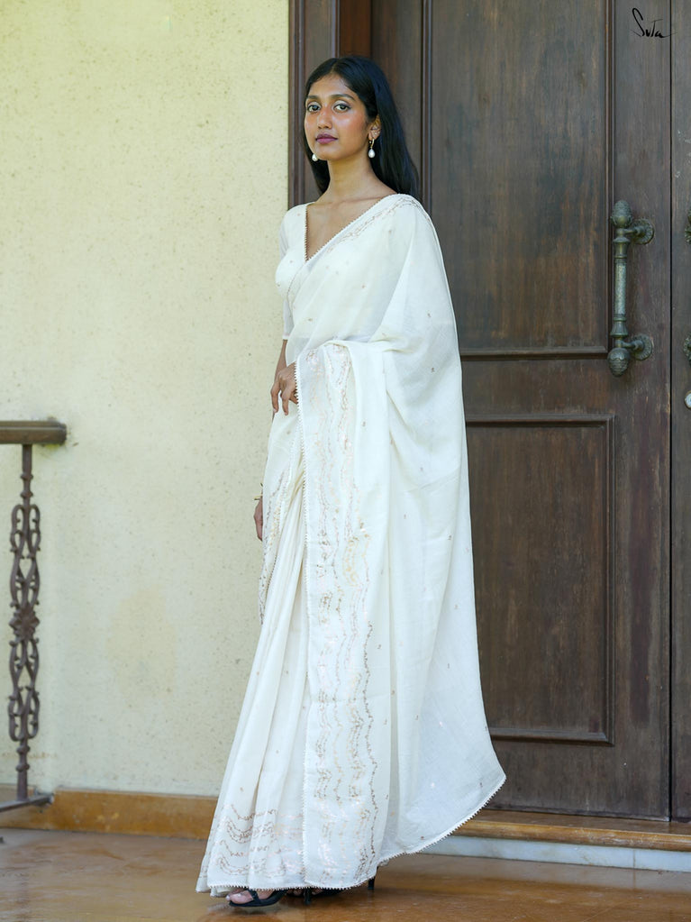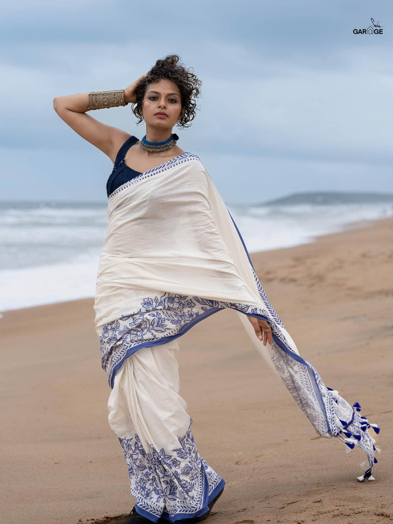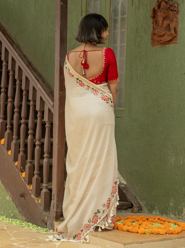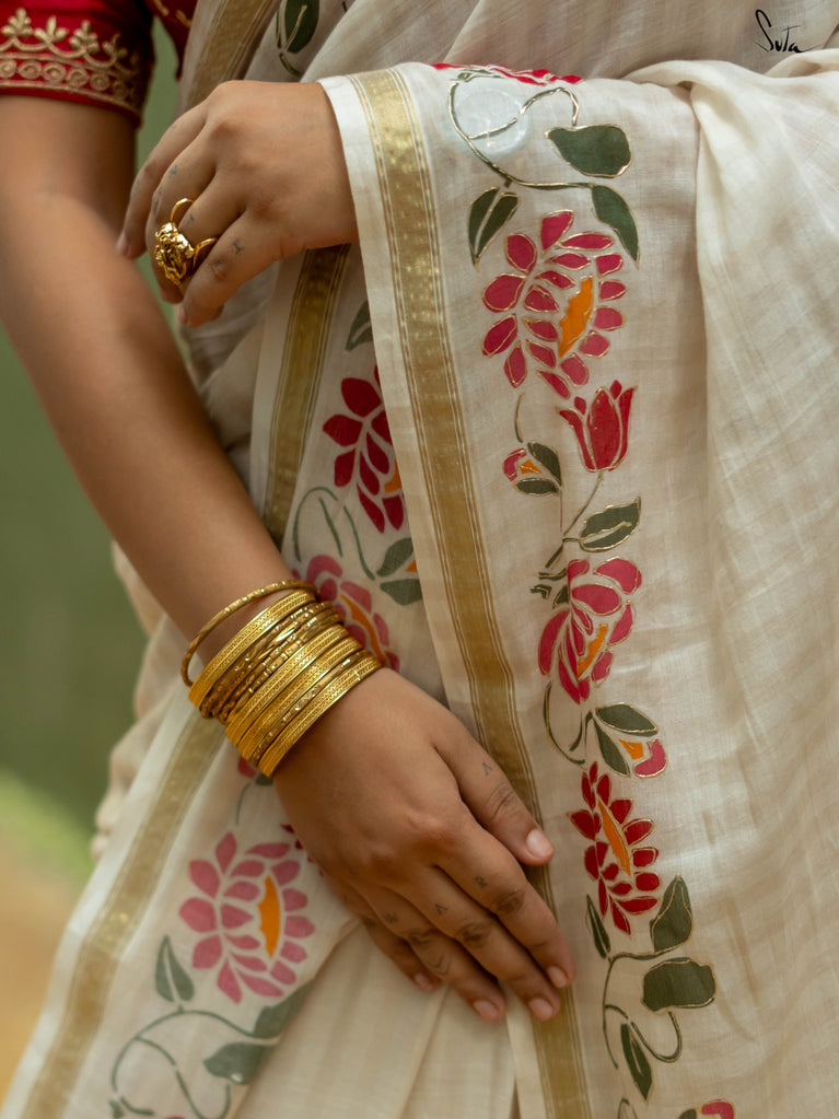 Arali is crafted from a cotton viscose blend, embodying the essence of a flower garden. This off-white saree drapes beautifully and a classic gold zari border adds a touch of regal opulence.
