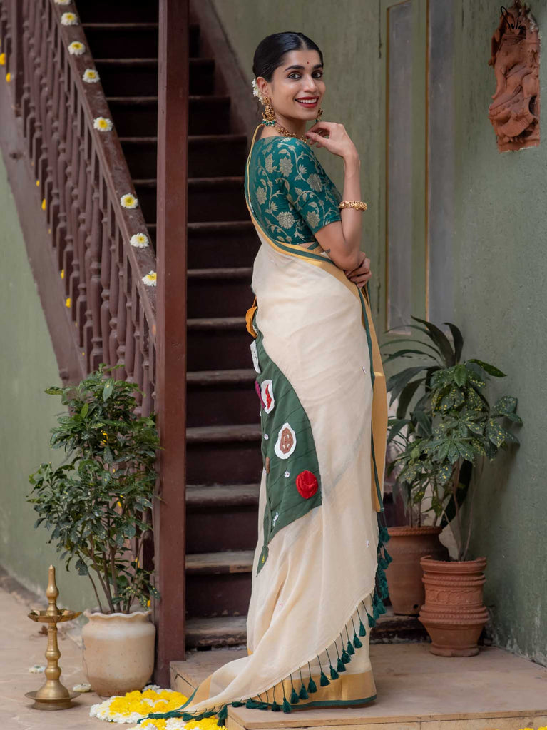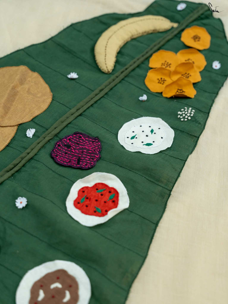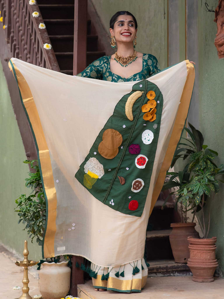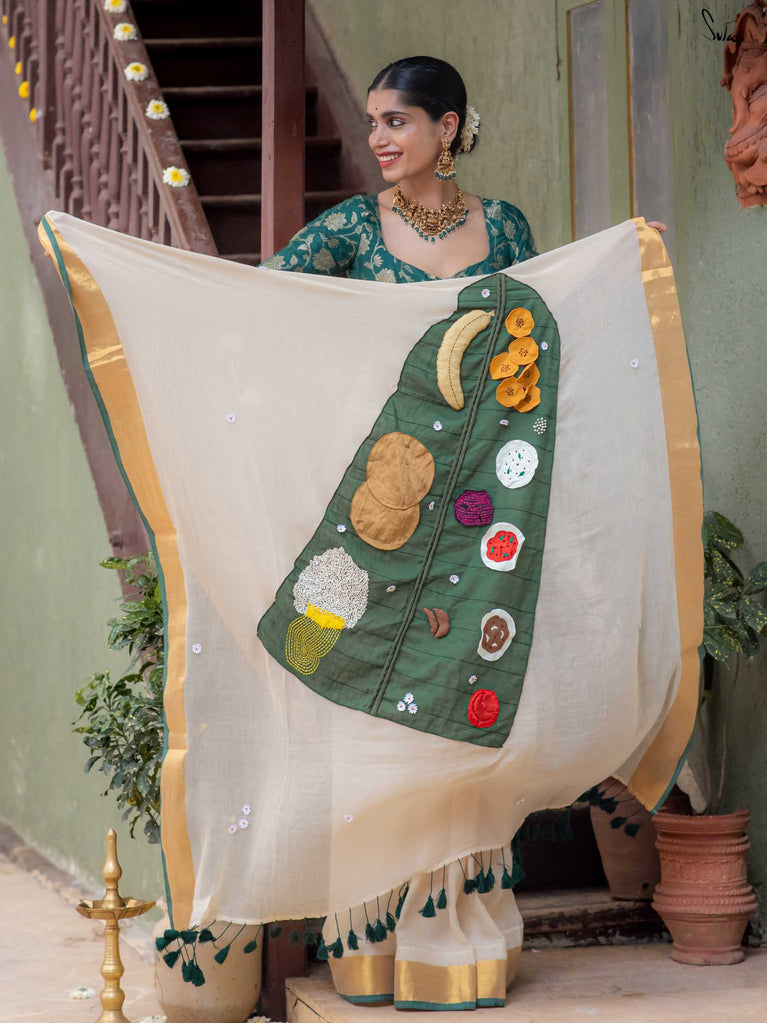 Asadhyam! is a woven mul cotton saree in a classic off-white shade, finished with a rich gold zari border. The highlight is the pallu, featuring a colourful patchwork of the iconic Onam Sadhya served on a banana leaf. Small white floral motifs are scattered across the body, adding a soft, charming touch to this joyful drape. The name Asadhyam! is a familiar Malayali expression usually said with a smile and a happy sigh after a delicious meal. This saree brings that same feeling to life: of fullness, joy, and celebrating the little things that matter.