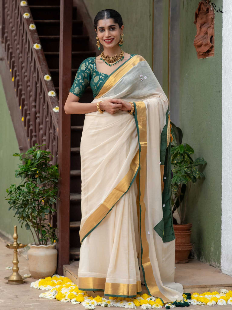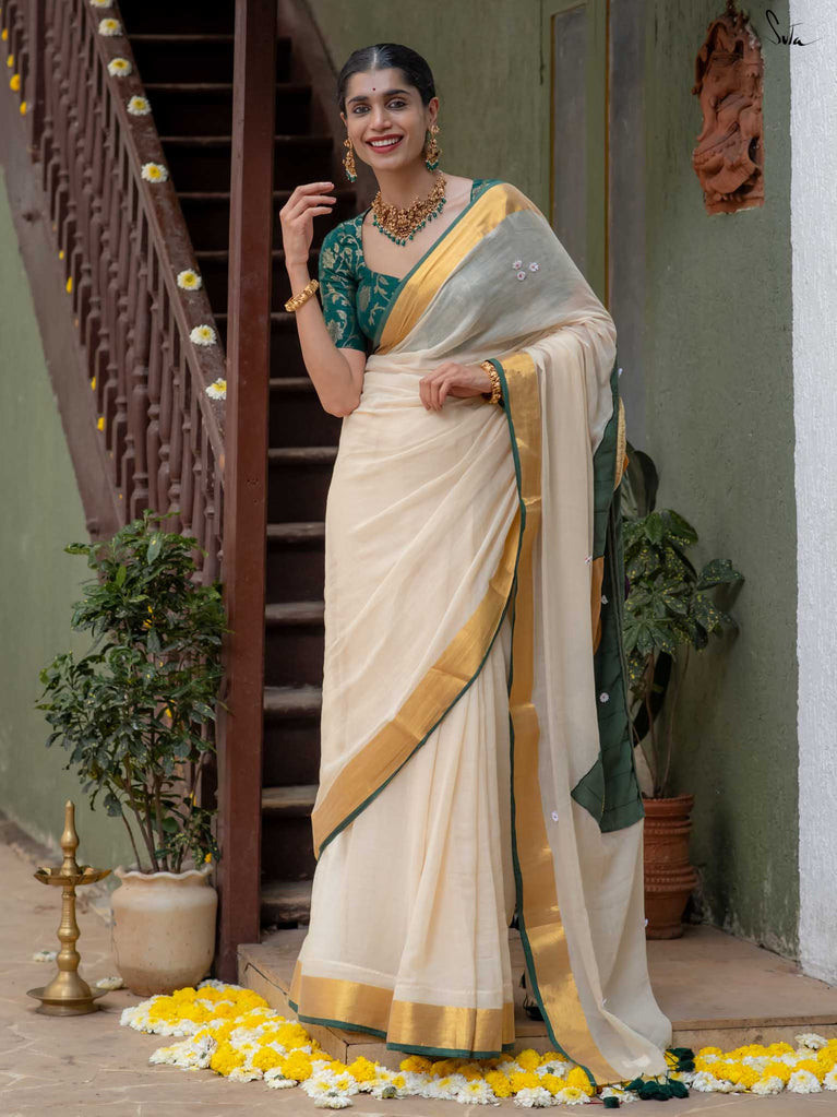 And what’s Onam without a touch of gold? Pair your favorite jewelry with this saree to complete your Onam look.