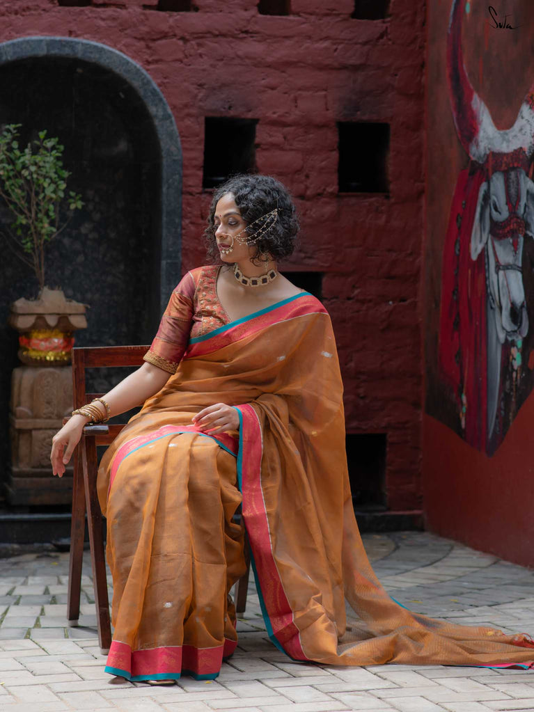This saree has been handwoven by a master weaver in the Mashru tradition. The Mashru weave is said to have originated in West Asia, in the 19th Century. The fabric is woven with a silk weft and a fine cotton warp. It thus combines the ageless comfort of cotton and the timeless aesthetic of silk, elevated by the presence of gold and silver zari.