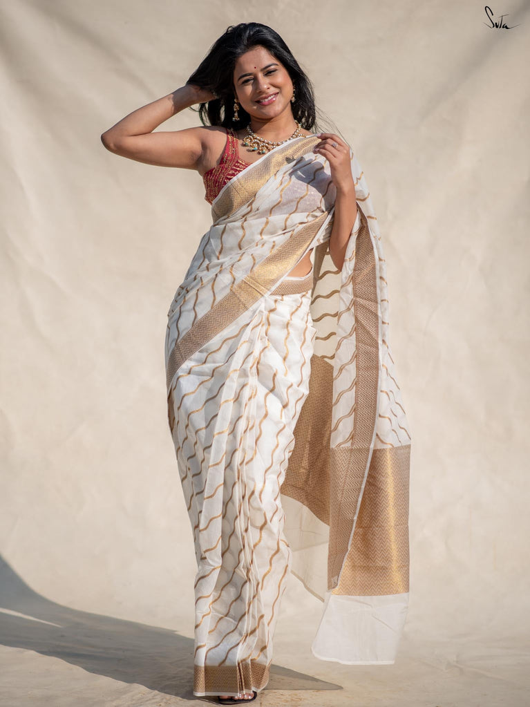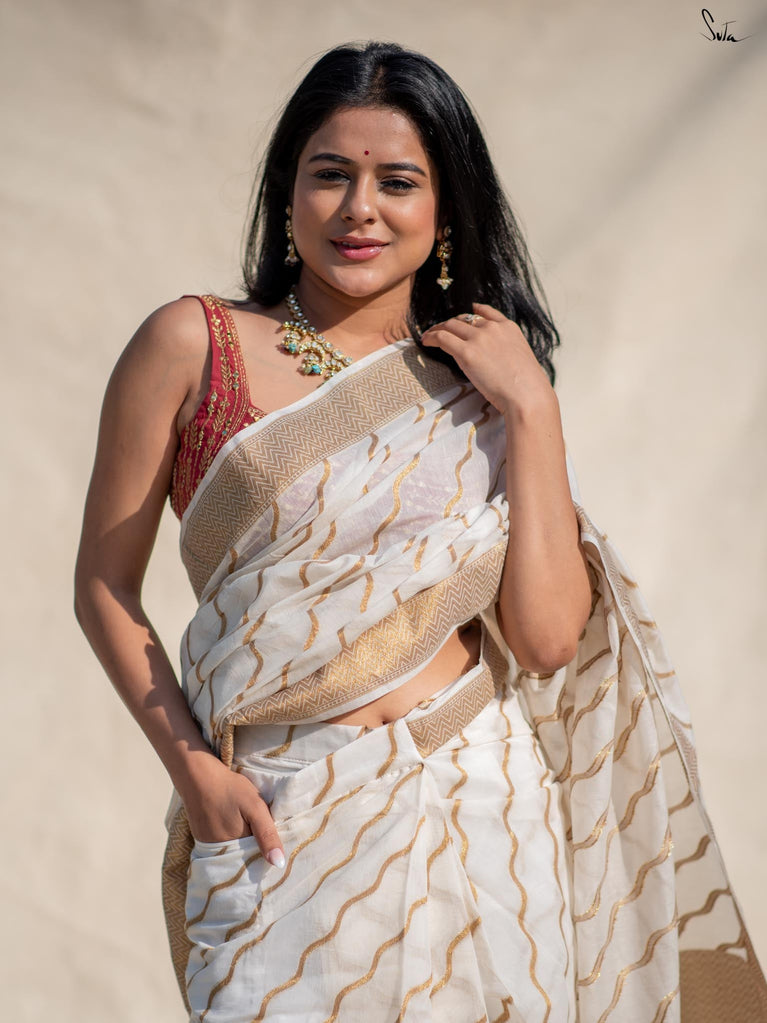 Golden Waves captures the endless rhythm of the ocean, with white and gold waves woven into lightweight polyester cotton. The contrasting gold pallu adds a unique touch, and with adjustable loops, you can skip the underskirt as it has lining attached, and pleats (we have built-in hooks with no pleat hassle) with a pocket, achieving the perfect drape in under 30 seconds.