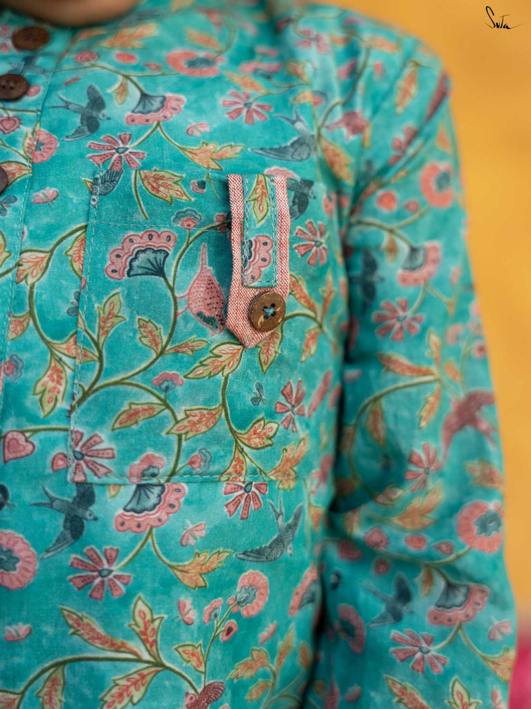 A song of colour and play, Bulbul is designed for the little gentlemen to shine. The kurta, in soft sushi voile, pairs lightness with festivity, while the cotton cambric pajama ensures all-day ease. The full-sleeve kurta features a cheerful digital print of flowers and birds, bringing a playful touch to traditional wear. A front button opening makes it easy to slip on, and side pockets add a practical twist for little treasures. The crisp white pajama pants come with an elasticated waistband and side pockets, perfect for morning aartis to evening fun.