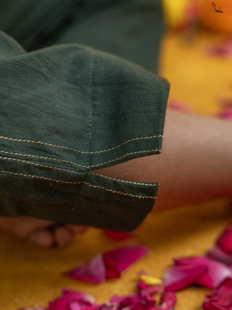 A festive classic for little gentlemen, Aamli is crafted in soft, breathable cotton cambric. The lush green, full-sleeve kurta with delicate chumki shimmer brings just the right festive magic. A front button opening makes dressing easy, and side pockets hold tiny treasures. The matching pajama pants feature cotton cambric comfort, an elasticated waistband, and side pockets for all-day ease, perfect for pujas, family gatherings, or joyful play.