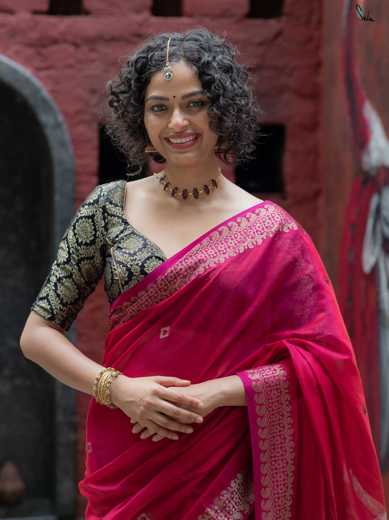 Silk is a natural fibre produced by the cocoons of silkworms. The shimmering appearance of silk is attributed to the prism-like structure of its fibres. While being smooth and soft, pure silk is also extremely durable and not slippery. Pure silk has been used in this rich red saree, to create a piece that is truly special and memorable.