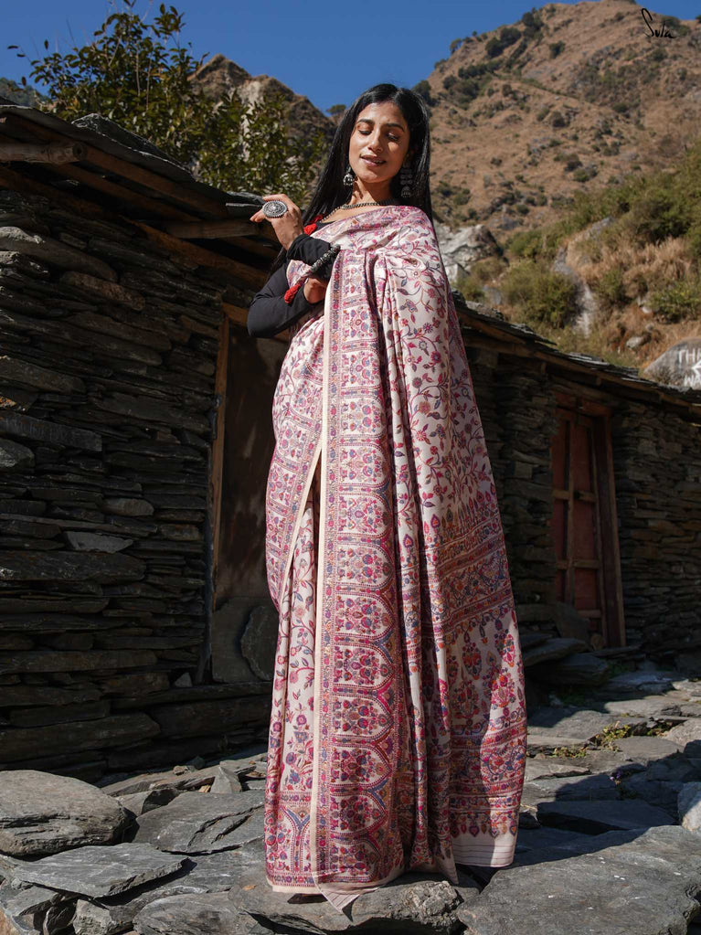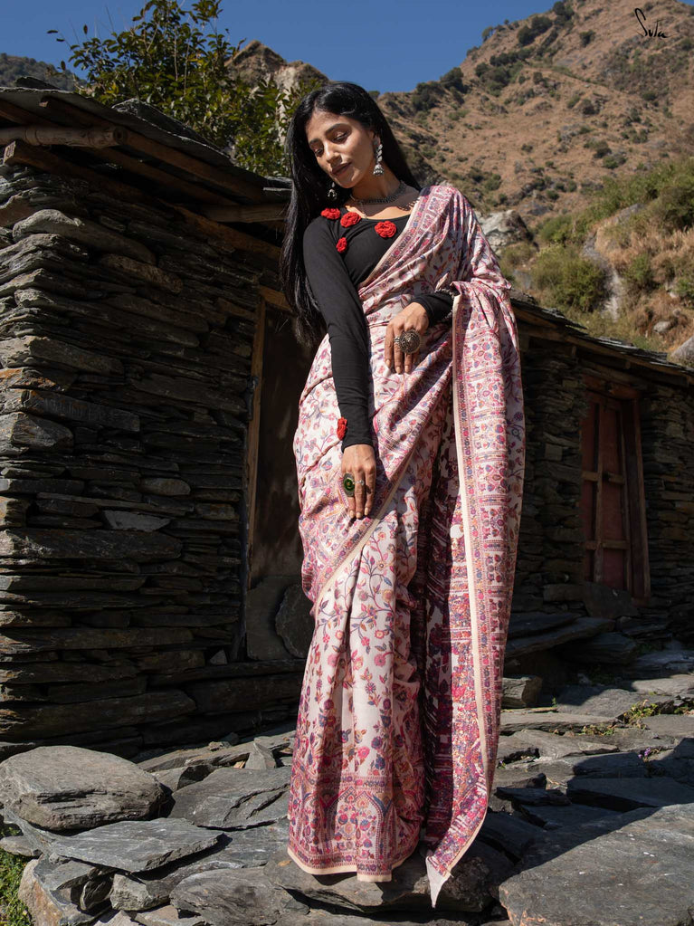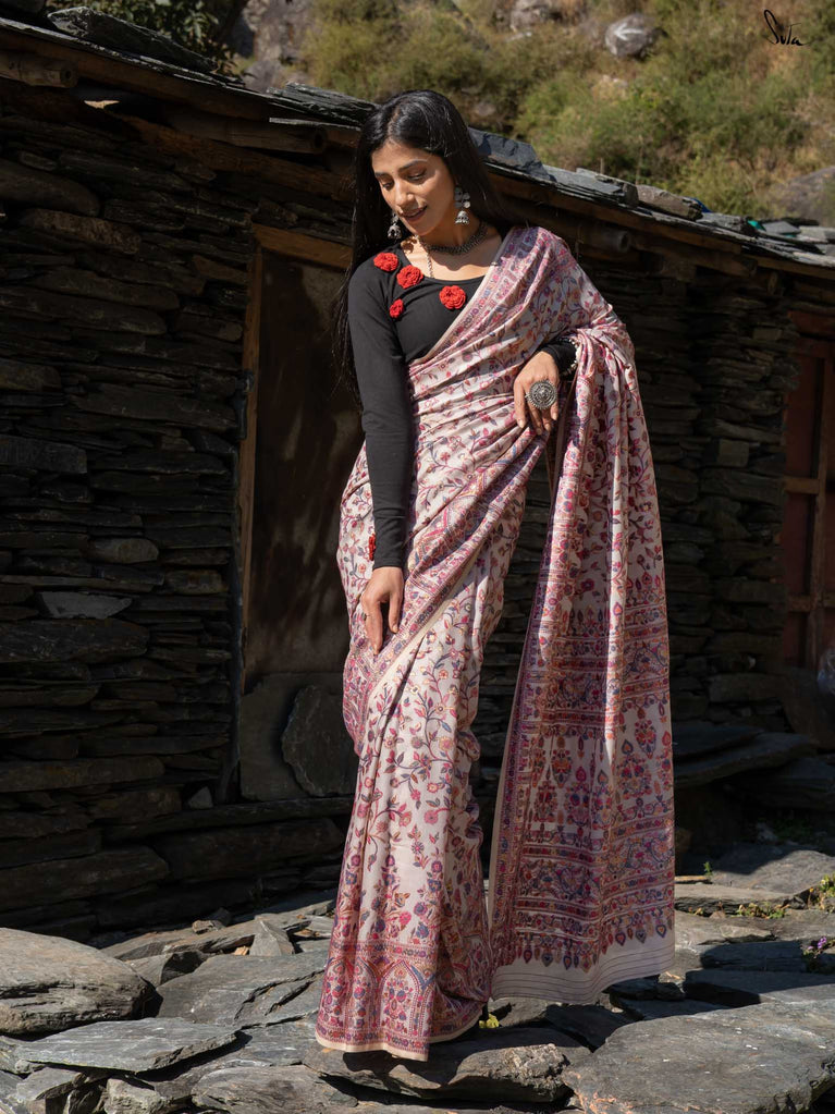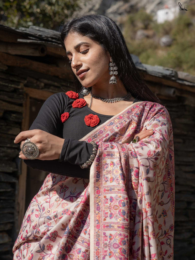 Chinar Pashm feels like autumn in Kashmir -soft, warm, and full of quiet beauty. Made from luxurious pashmina silk, this off-white saree is woven with bright, intricate patterns inspired by Chinar leaves in sunlight.Light yet rich, it blends heritage with modern elegance. Perfect for evenings when you want to look graceful without trying too hard -timeless, soulful, and simply stunning.