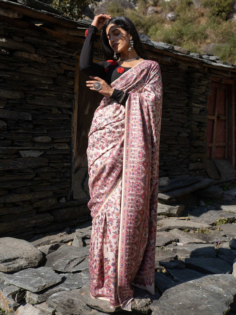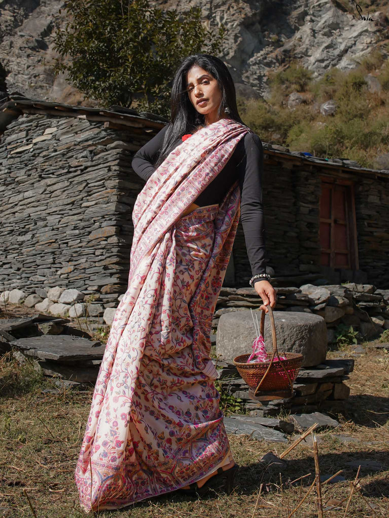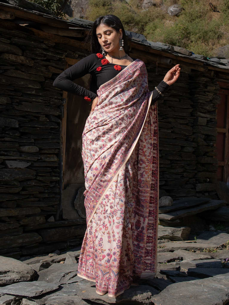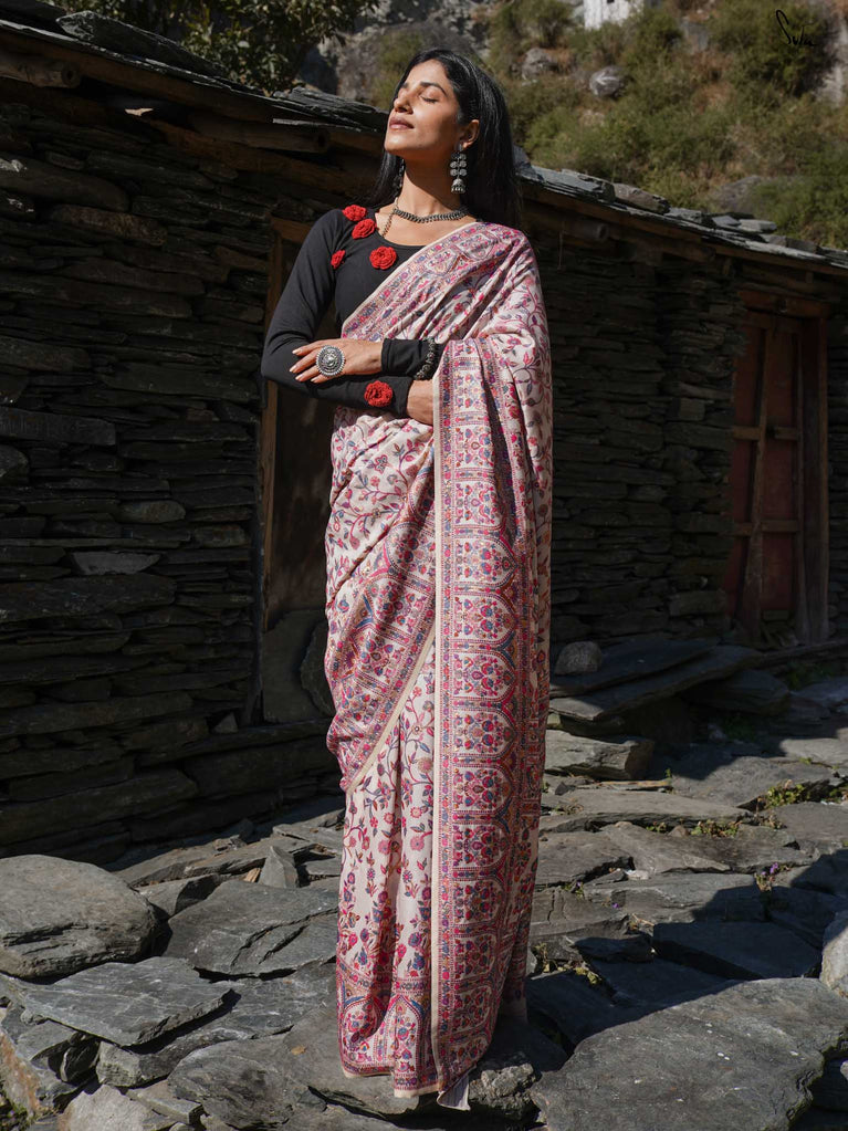Chinar Pashm feels like autumn in Kashmir -soft, warm, and full of quiet beauty. Made from luxurious pashmina silk, this off-white saree is woven with bright, intricate patterns inspired by Chinar leaves in sunlight.Light yet rich, it blends heritage with modern elegance. Perfect for evenings when you want to look graceful without trying too hard -timeless, soulful, and simply stunning.