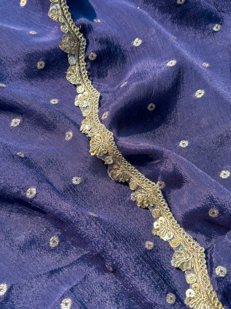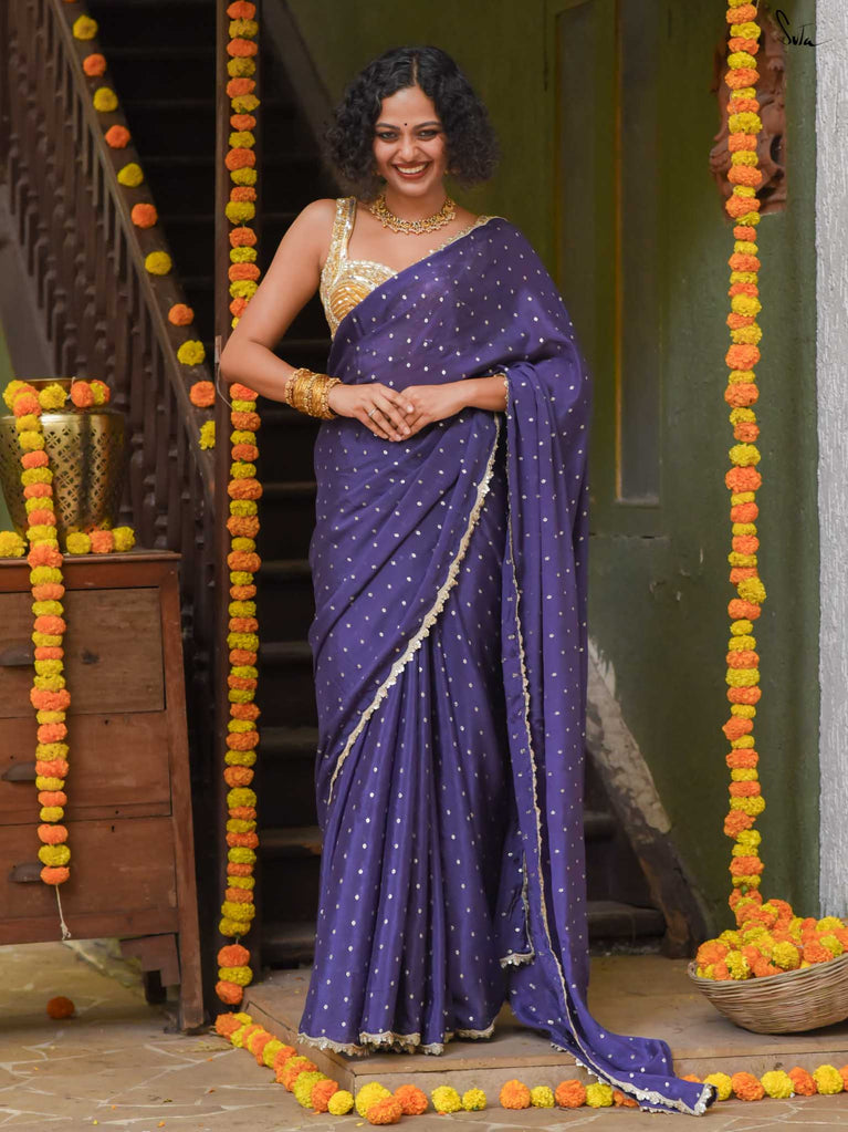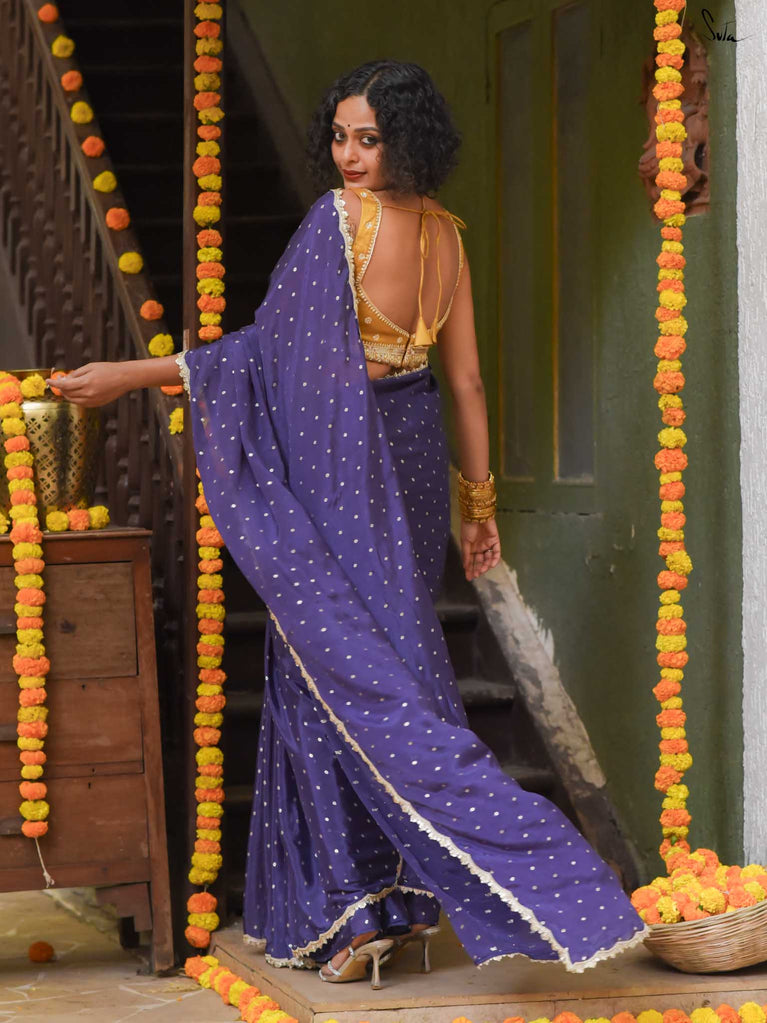 Rich & striking - this purple viscose-blend saree brings depth and elegance to every celebration. The smooth drape is adorned with light gold woven buttis that add a soft, luminous sparkle. Finished with an embroidered scallop lace, it carries a refined yet celebratory feel, perfect for evening weddings, receptions, and special family events.
