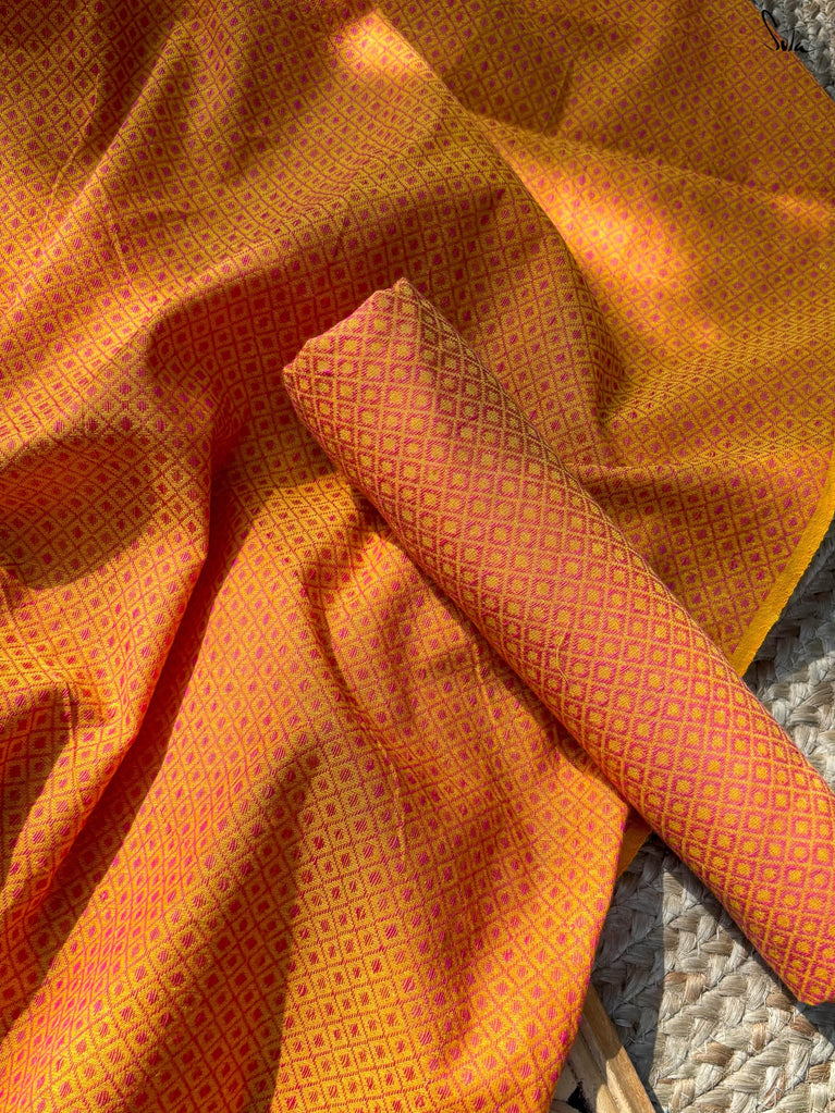 Apricot Pashm feels like apricot flowers opening under a twilight sky. Woven from a soft blend of pashmina wool and silk blend, it’s light, fluid, and effortless to wear.The deep blue base shines with colourful woven motifs, inspired by Kashmiri artistry and serene mountain evenings. Warm, elegant, and easy this saree blends tradition with modern charm.Made for the woman who seeks beauty in softness, Apricot Pashm brings strength wrapped in grace.