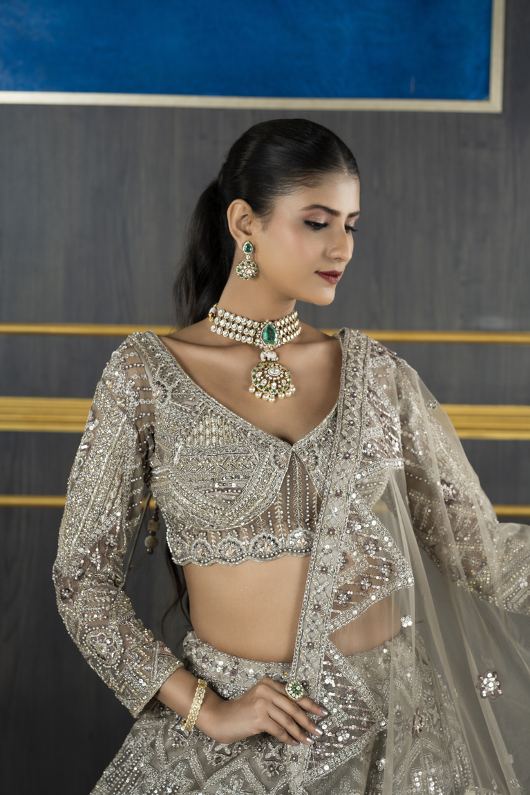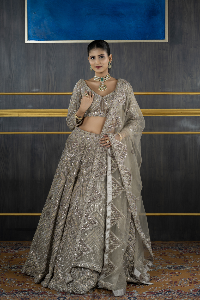 Net lehenga with Heavy Jarkan on Lehenga and Blouse with Heavy 4 Sided Duppata and Full Hands
