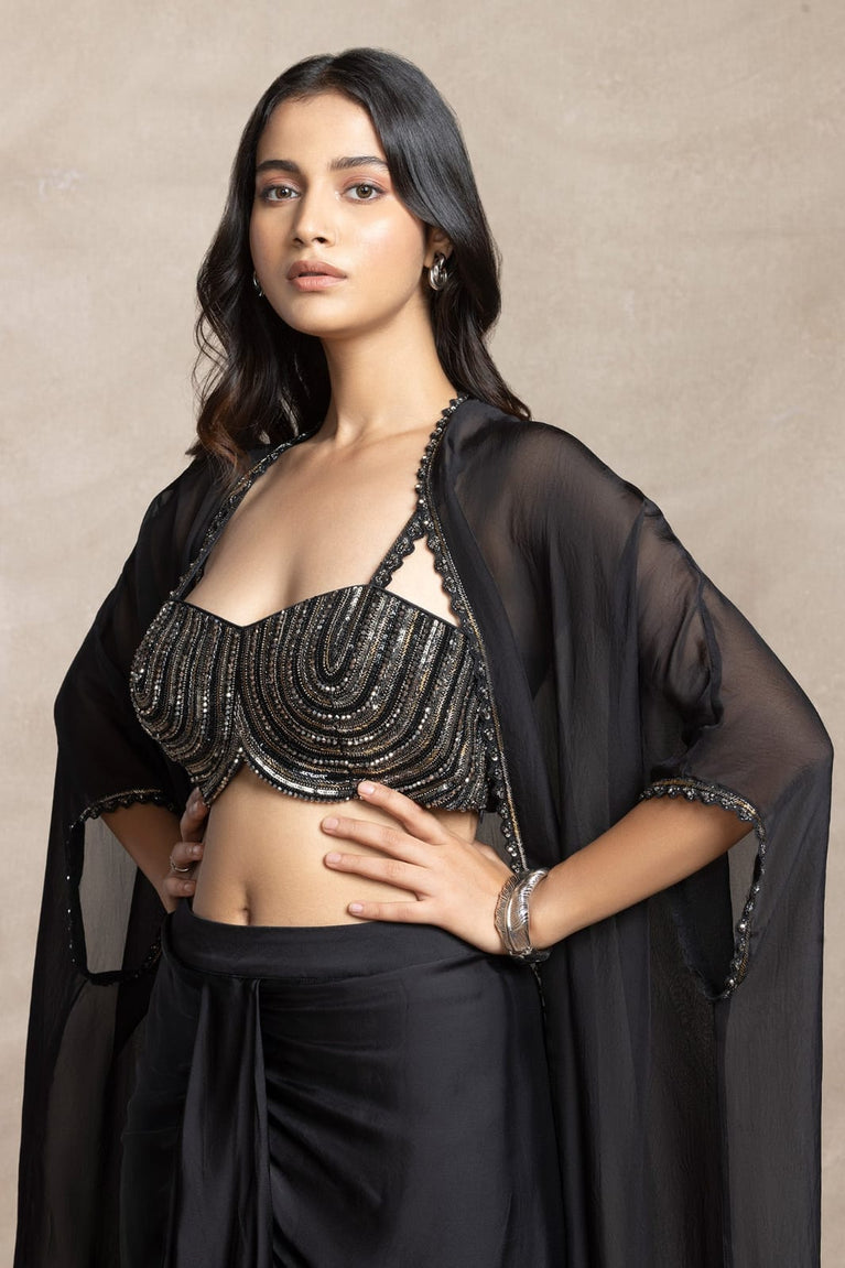 This vibrant orange coord set includes a fitted blouse, flared pants, and a flowy cape, giving a chic Indo-western look. A great pick for haldi ceremonies, cocktail parties, or fusion-themed weddings.