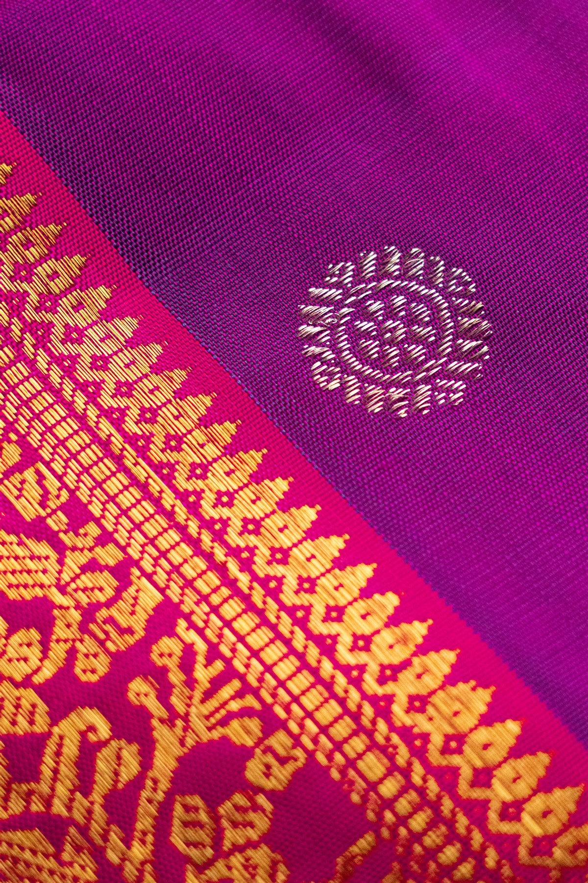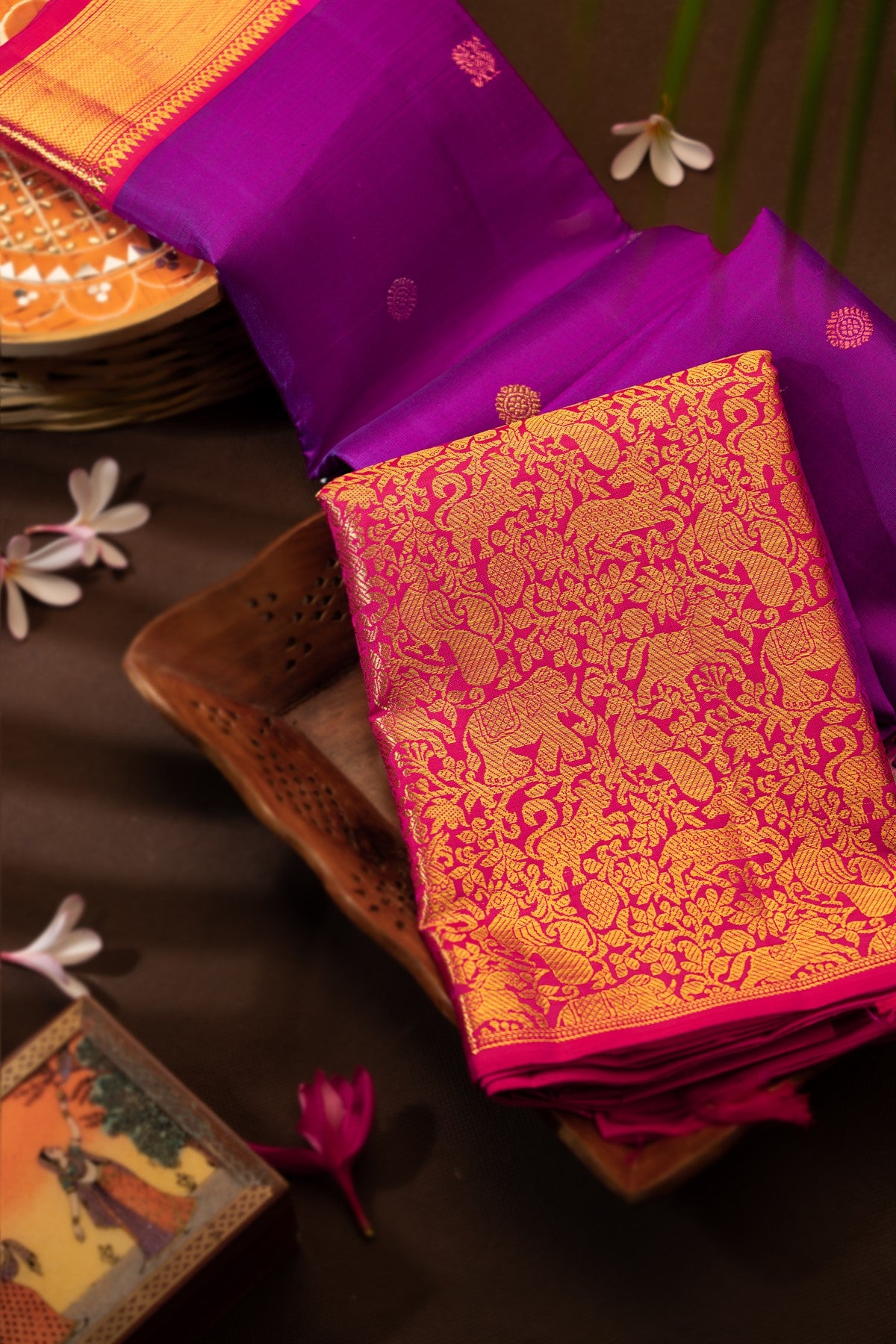This elegant Kancheepuram Silk Buttis Saree in a gorgeous magenta hue is a true embodiment of traditional Indian antique heritage. The exquisite Peacocks and Rudhasha Buttis adorning the saree's body are painstakingly woven with zari and provide a touch of glitz to the saree's graceful elegance. It is bordered by an Animals in Floral Brocade border that provides a lustrous sheen to the drape. A Diamond Brocade With Animals pallu and a Contrast With Border blouse complement this sumptuous ensemble.