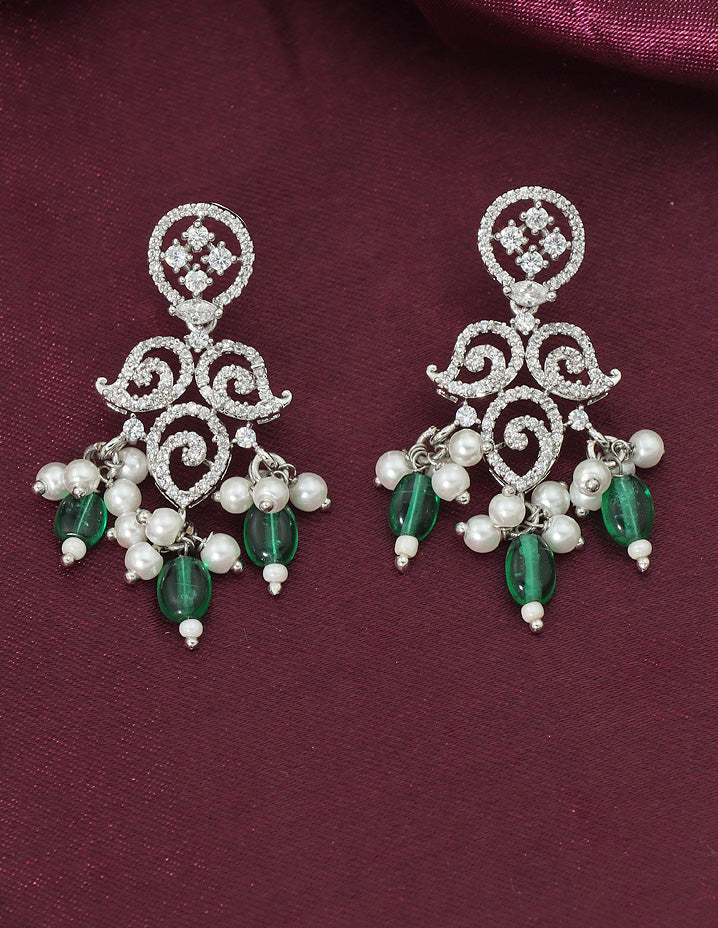 Gracefully designed with glistening CZ stones and lustrous Stones, this rhodium-finish necklace set features delicate leaf motifs, perfect for a touch of timeless elegance at weddings or evening soirées.